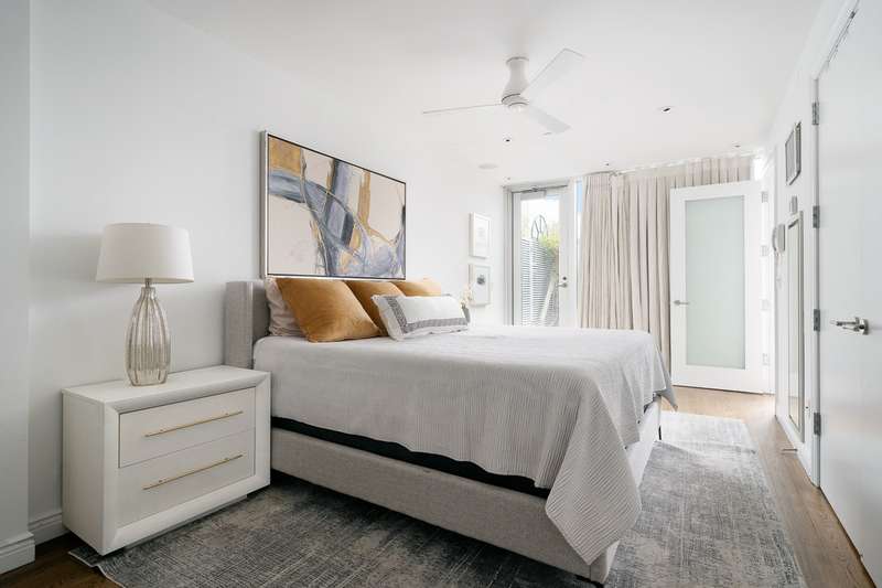 The upper-level primary suite is a tranquil retreat with spa-like en-suite bath, a wall of custom closets, a dressing area, and direct access to a private terrace. The terrace, thoughtfully planted with year-round greenery and equipped with power and water, is a true outdoor oasis perfect for lounging, dining, or entertaining in the warmer months.