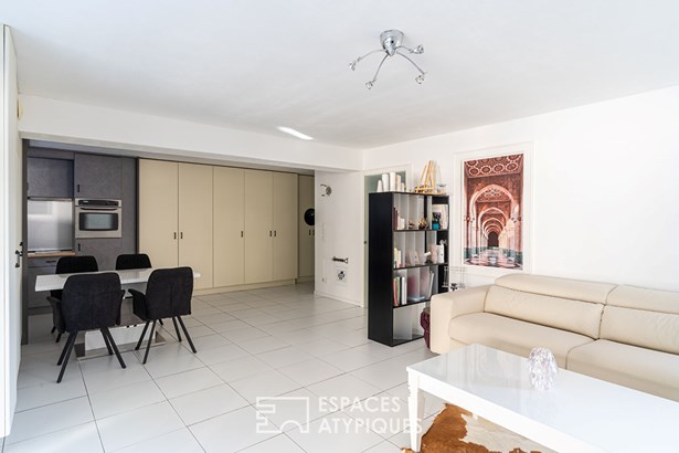 Upon entering, an optimized space features numerous custom storage units that blend harmoniously into the decor, providing both elegance and functionality. The apartment opens onto a pleasant living room where the perfectly integrated open kitchen invites conviviality. The whole space benefits from beautiful natural light thanks to large openings leading to the veranda. The veranda is fully modular and can be closed in winter to create a second cozy living room or opened in summer to extend outdoor living. A bathroom completes the interior layout.