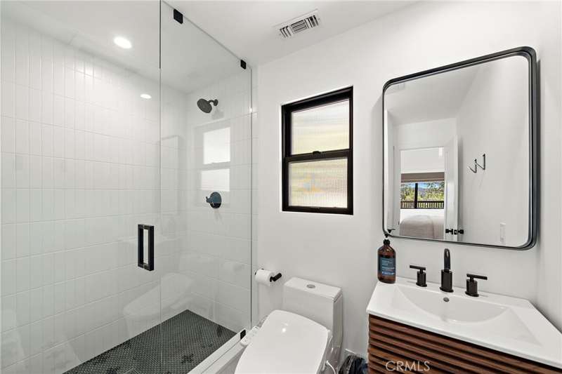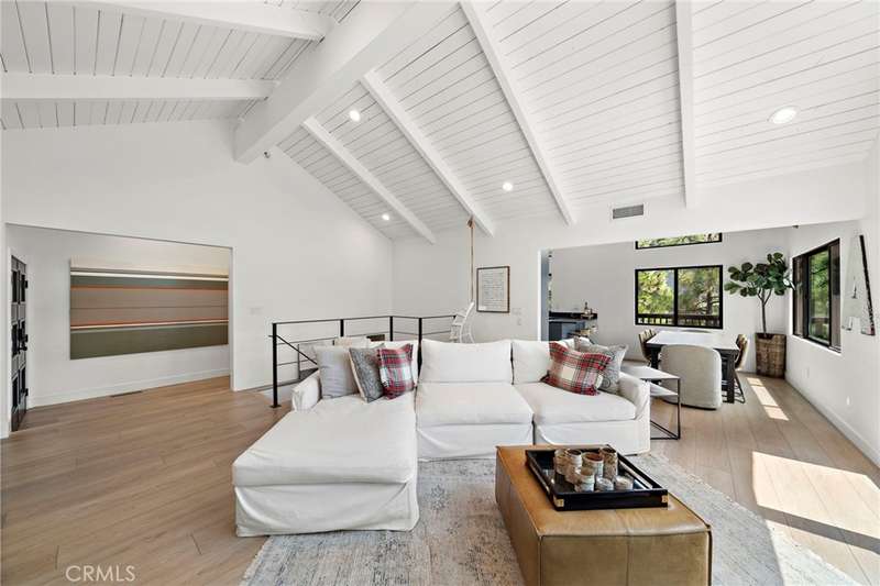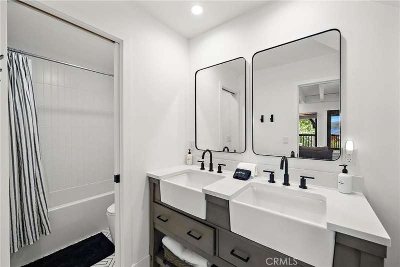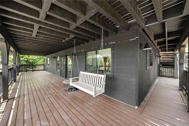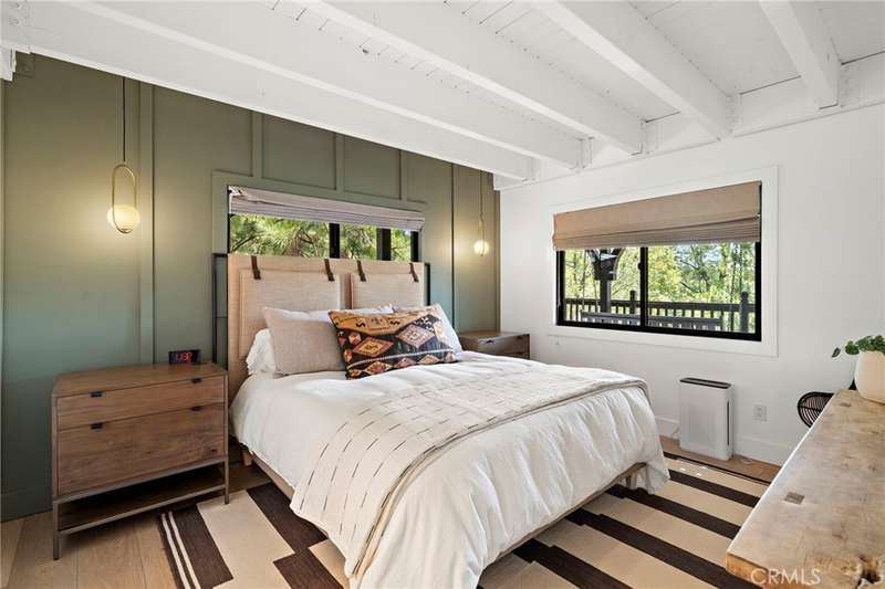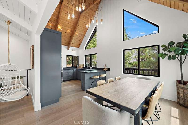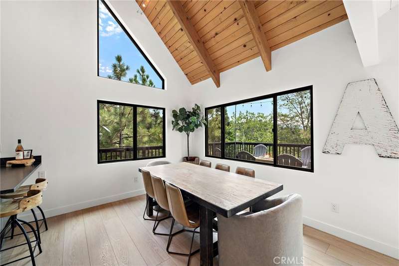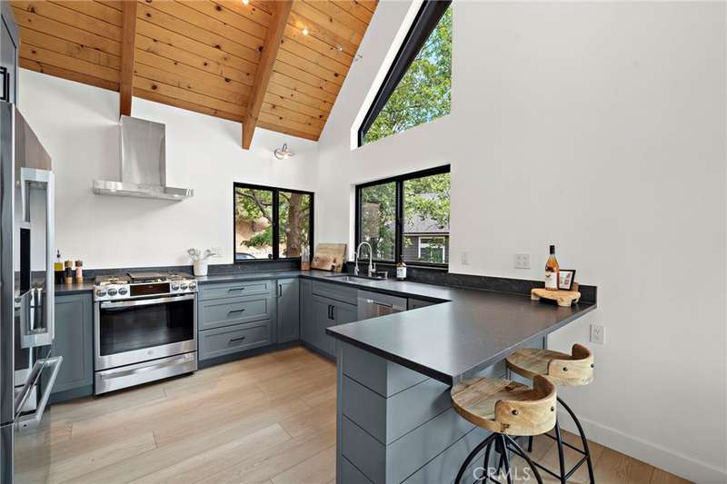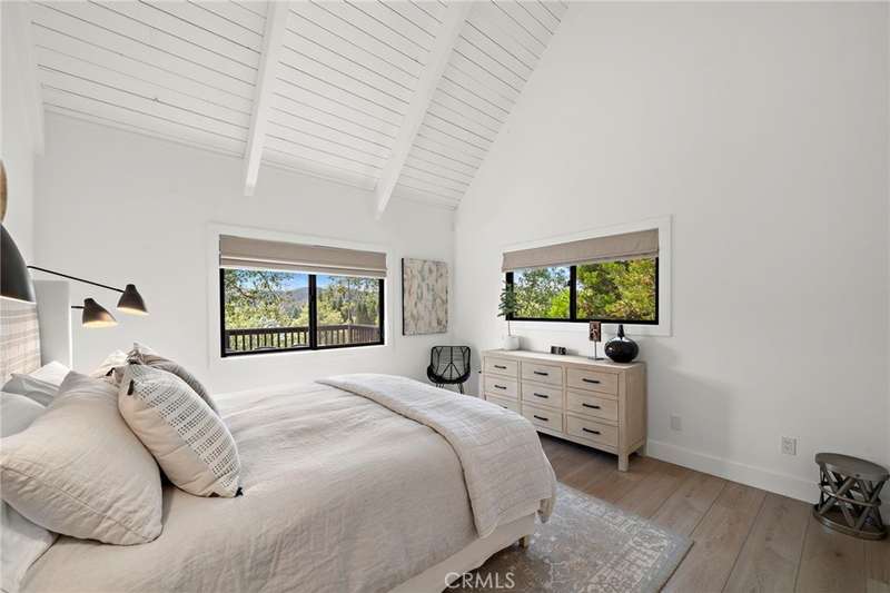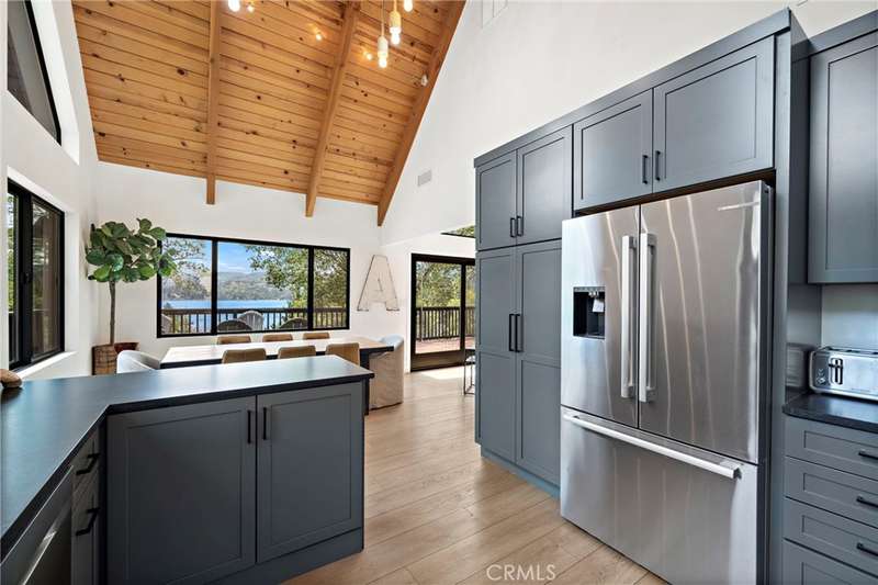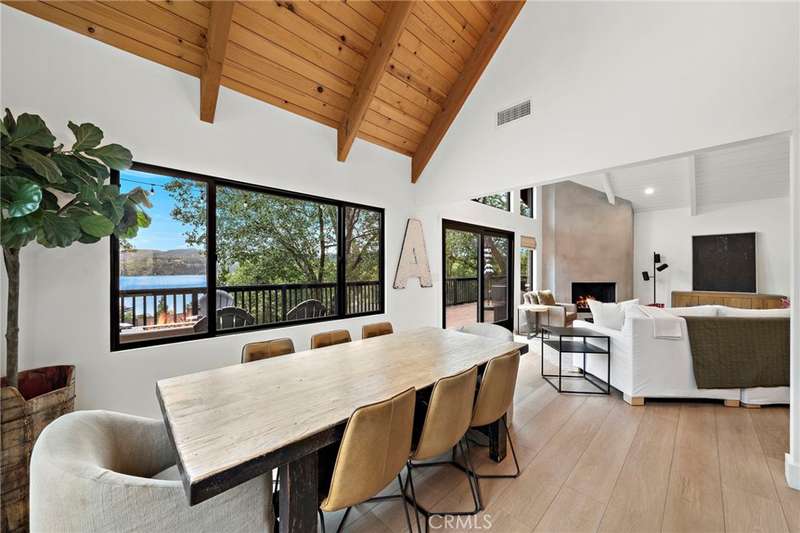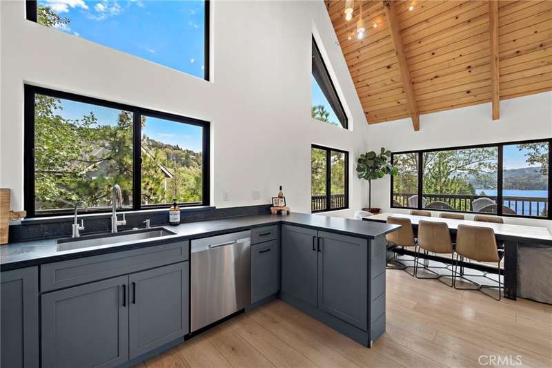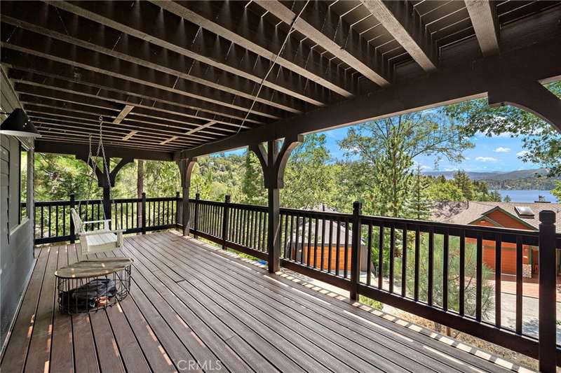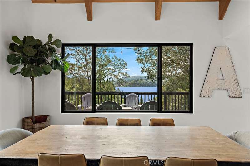 This stunning 4-bedroom, 3.5-bath mountain retreat combines modern upgrades with timeless lodge-style charm, offering captivating lake views from nearly every window. Thoughtfully remodeled in 2020-2021, the home features a bright open floor plan perfect for both comfort and entertaining. The main level showcases a dramatic great room with vaulted ceilings, expansive windows, recessed lighting, and a cozy gas fireplace that opens to a large entertainer's deck. The remodeled kitchen is a chef's dream with stainless steel appliances including a refrigerator, shaker-style cabinetry, pantry with pullout shelves, granite counters, peninsula with seating, and large windows framing the view. Two primary suites with spa-inspired baths--one on the main level and another on the lower level--provide privacy and flexibility, while two additional bedrooms and a spacious family room with a second fireplace and walk-out access to the lower deck with a swinging bench create the perfect retreat for family and guests. Outdoor living shines with two expansive decks crafted in durable Trek decking, ideal for gatherings, dining, or simply enjoying the mountain air and lake views. Additional highlights include dual HVAC and A/C systems with split thermostats, vinyl flooring throughout, inside laundry with washer and dryer, a finished pull-through two-car garage with automatic doors on both sides, and ample guest parking. Sold mostly furnished for a true move-in ready experience, this home is ideally located just above the trails of North Bay Cove with lake rights, peaceful morning walks, sunset strolls, and easy access off Bay Road with level parking. Just minutes from Blue Jay and Lake Arrowhead Village shops and dining, this exceptional property offers the perfect blend of modern amenities, mountain appeal, and lake lifestyle--whether as a primary residence, weekend escape. The home is also licensed as an active Airbnb!