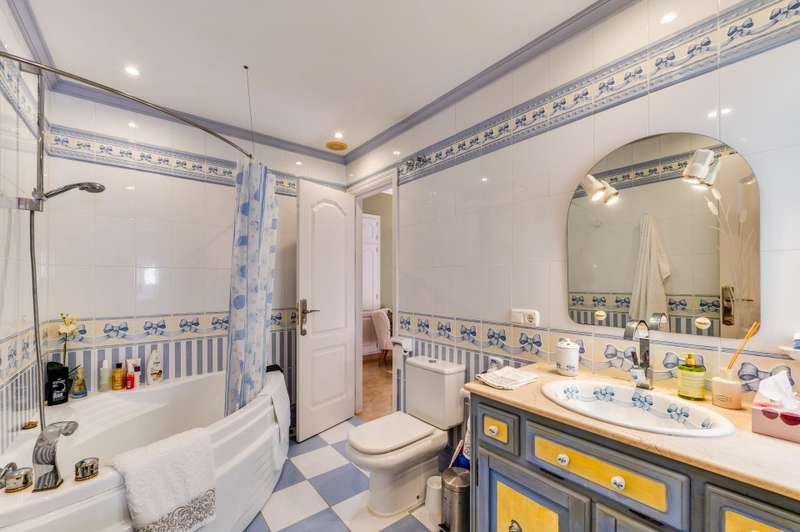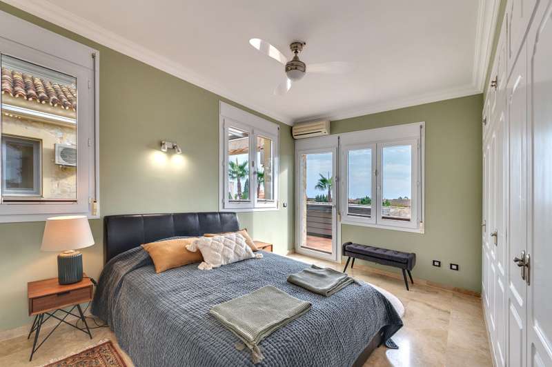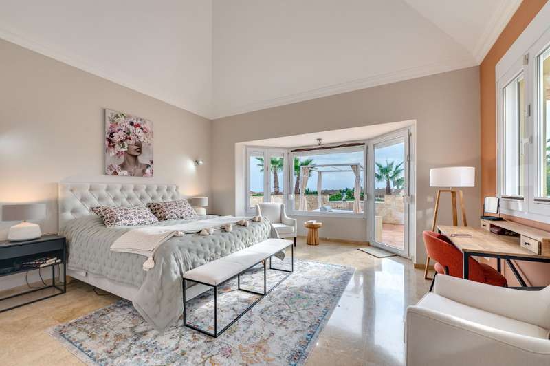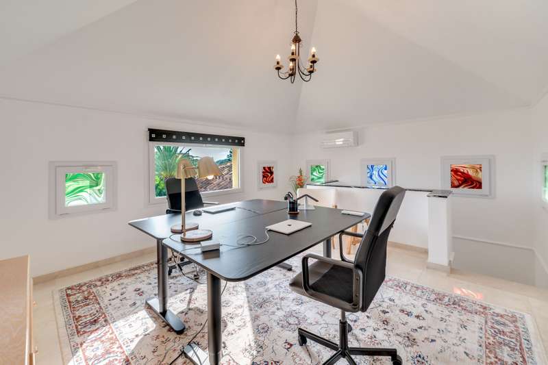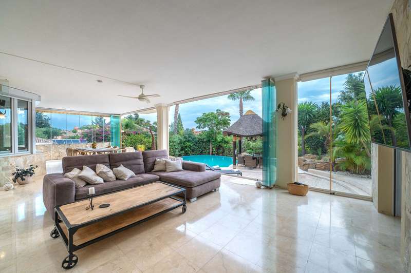 Discover this stunning 5-bedroom villa in the exclusive Santa Maria Golf area of Elviria. Just minutes from the golf course clubhouse and within walking distance of Elviria’s town center and the beach, this property offers the perfect balance of privacy, elegance, and Mediterranean charm. With panoramic sea views from the first floor and beautifully maintained outdoor spaces, it’s a rare find in one of Marbella’s most sought-after locations. As you step through the grand entrance, you’re welcomed by a striking gallery staircase and a sunlit orangery courtyard. The heart of the home is the expansive open-plan kitchen, featuring a Teppanyaki grill, double ovens, and a spacious central island—ideal for both everyday dining and hosting gourmet gatherings. The villa's living areas are designed for both comfort and sophistication. A double lounge with vaulted ceilings includes a formal sitting area with a cozy fireplace and a relaxed TV lounge that opens onto the terrace, garden, and pool.