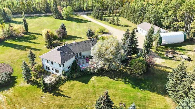 This stunning 8.62-acre property offers the best of both worlds—peaceful country living with the convenience of being only 5 minutes west of Rimbey. The 1,945 sq. ft. bungalow is designed with both comfort and practicality in mind, featuring an open and bright main floor accented by elegant built-ins, new custom window shades, and a cozy gas fireplace. The kitchen, with an abundance of counter tops, gas stove, and large walk-in pantry, which seamlessly flows into the dining area, making it ideal for family gatherings or entertaining. The main level offers two spacious bedrooms, two bathrooms, and thoughtful extras like a large laundry and mudroom. The fully developed basement adds two more bedrooms, a bathroom, a generous rec room, and ample storage options including a cold room and utility space. Heated by an efficient boiler system providing both in-floor and forced-air comfort, this home ensures warmth without the need for a traditional furnace. Outdoors, the property continues to impress. An oversized heated double garage (32’ x 31’) and a massive 32’ x 48’ heated shop with radiant heating provide incredible space for projects, hobbies, or equipment. For added convenience, a 22’ x 40’ tarp RV cover building offers excellent storage for your recreational vehicles. The backyard is private which includes an inviting pond with a trickling water fall —perfect for relaxation or outdoor living. Practical updates include a drilled well, a septic tank and new septic mound (2024), and a durable stucco exterior. With its perfect blend of modern comfort, functionality, and country charm, this acreage is a rare find.If you’re looking for a private retreat that’s close to town but offers all the benefits of country living, this property is one you don’t want to miss.