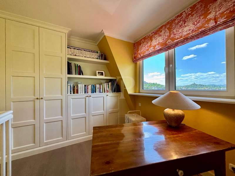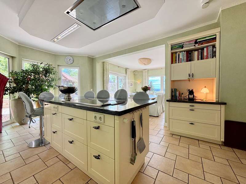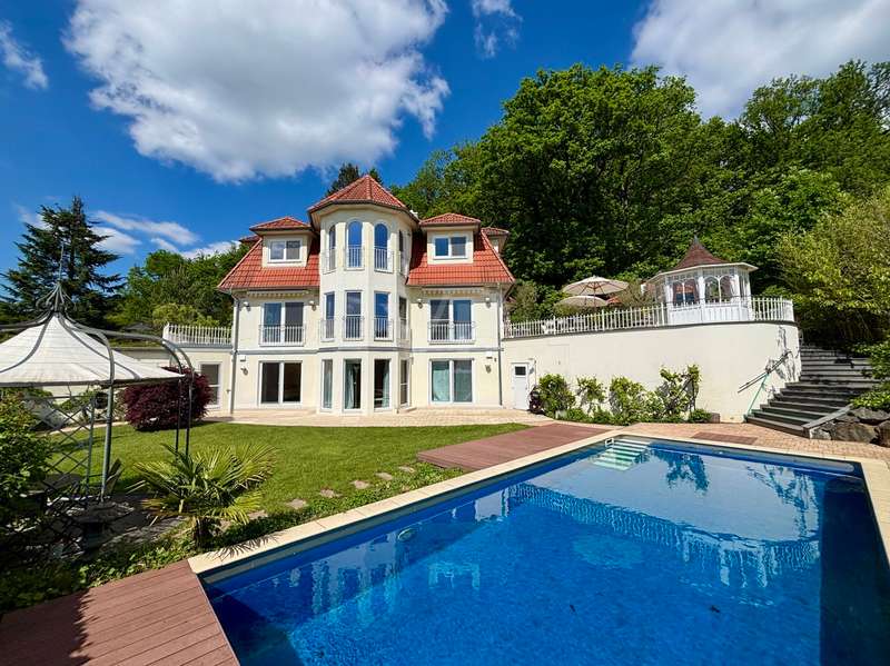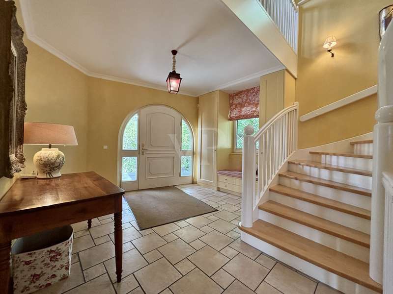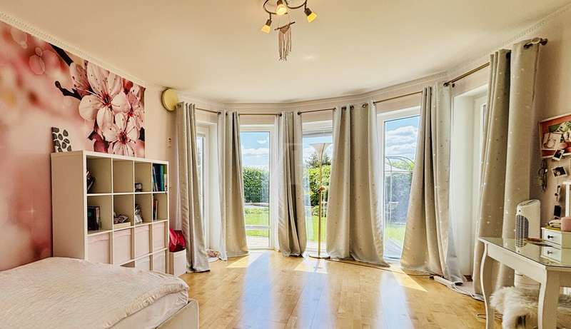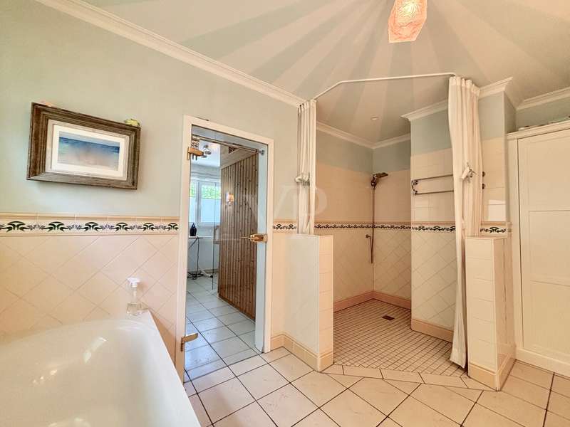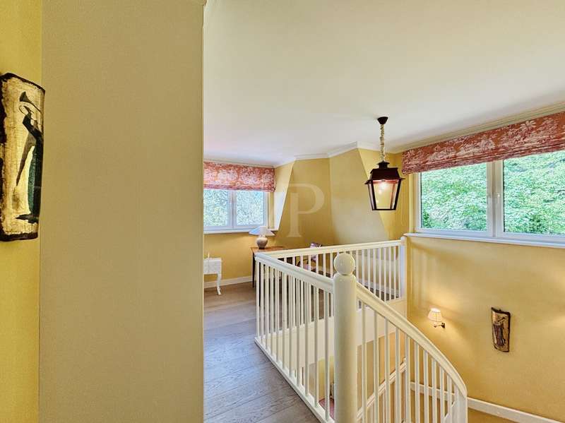 This special residence is located on a spacious plot of approx. 1500 m² on the edge of the forest. With a living space of approx. 313 m², the house extends over three floors and offers space for eight spacious rooms. The construction method of the Isartal timber house from 2005 impresses with its quality and sustainability. The property has five well-proportioned bedrooms and three high-quality bathrooms, providing ample private space for a family. The underfloor heating and an efficient wood pellet heating system combine to create a comfortable living environment and support sustainable energy use. Particularly noteworthy is the wood-burning stove from 2013, which provides additional warmth and a special atmosphere. The open, large fitted kitchen is equipped with first-class appliances from Zug and offers plenty of space for culinary creations. There is plenty of space for the family in the adjoining dining and living area. The unusual architecture with a bay window over all floors creates special places with spectacular views. For company and relaxation outdoors, the pool with osmosis and counter-current system offers welcome cooling in the summer months. This area is complemented by a summer kitchen and various outdoor areas for socializing in the open air. Various play equipment is available for children, while the teahouse offers peace and quiet. The secure property is equipped with electric gates and has a double garage with space for two vehicles. There is the option of installing a kitchen connection in the basement, which significantly expands the possible uses. A wine cellar rounds off the offer and provides optimal storage conditions for lovers of fine wines. With a particular focus on feng shui, harmonious aspects were incorporated into the design to create a pleasant and balanced living environment. The combination of modern comfort and well thought-out details makes this house a unique offering on the market. The quality of living and the feel-good ambience are unique. Combined with one of the most beautiful views in the area.
