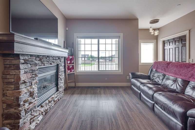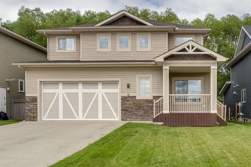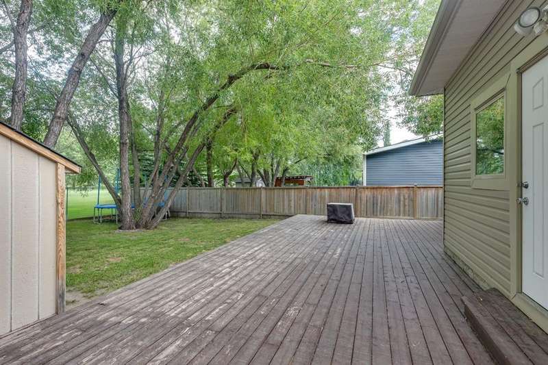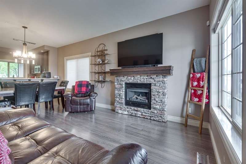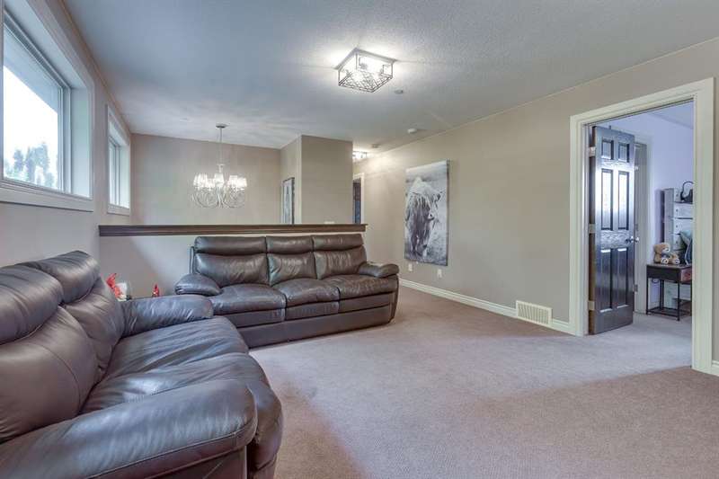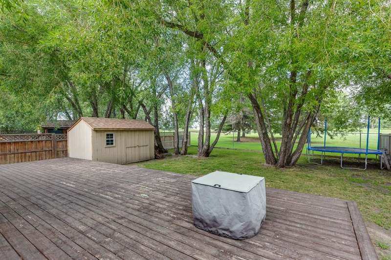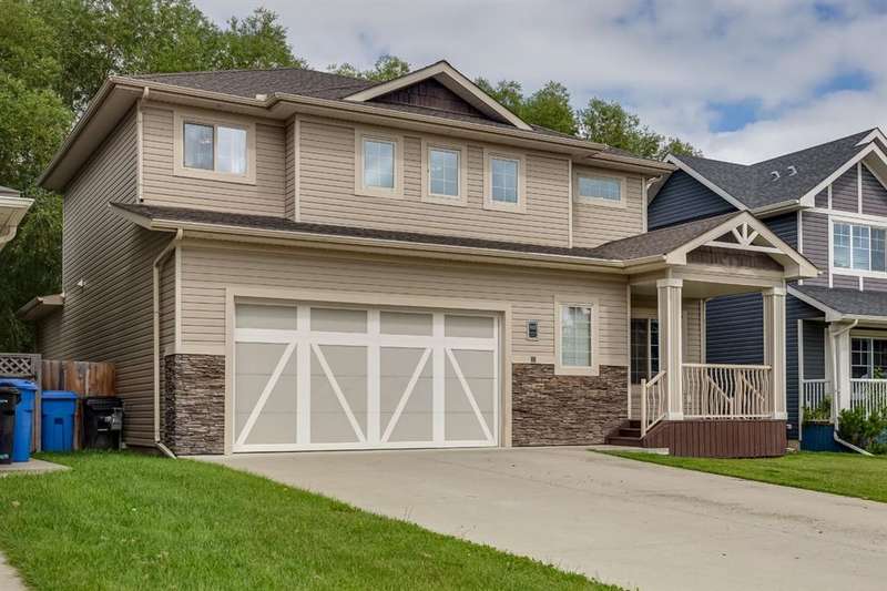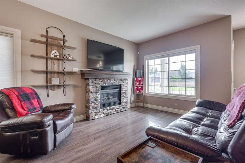 Exceptional Home Backing the Golf Course!! Welcome to a lifestyle of comfort, beauty, and convenience in this immaculate 1,728.33 sq ft Gold Seal home, perfectly positioned on the 17th Fairway of the Carstairs Golf Course. Imagine waking up to sweeping golf course views, enjoying peaceful mornings on your charming front veranda, and hosting friends in a home that blends elegance with everyday functionality. The open-concept main floor is warm and inviting, featuring a stunning stone-faced gas fireplace, sunlit dining area, and a chef-inspired kitchen with raised breakfast bar and stainless steel appliances. A handy half bath and main-floor laundry add to the thoughtful design. Upstairs, unwind in the spacious bonus room, two generously sized bedrooms (one with walk-in closet), and a luxurious primary suite boasting a walk-in closet and spa-style ensuite with soaker tub. The newly finished basement expands your living space with a large family room anchored by a cozy electric fireplace, plus hidden rough-ins for a future bathroom. Step outside to your private outdoor oasis—an impressive 700+ sq ft deck on concrete pilings, overlooking a beautifully landscaped, mature-treed backyard with stunning golf course vistas. A large garden shed keeps tools and toys organized, while the oversized heated 4+ car garage/workshop is perfect for car lovers, hobbyists, a home gym, or extra storage. Set in a quiet, low-traffic neighborhood, this home also features a state-of-the-art fire suppression sprinkler system for peace of mind and lower insurance premiums. Fully fenced yard, decorative walkways, and the added perk of a brand-new grocery store just a short stroll away make this a truly unbeatable location.