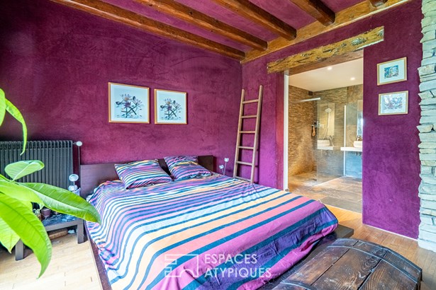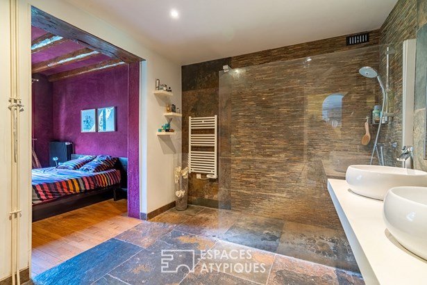A few steps provide access to the ground floor which is composed of a spacious entrance opening onto a beautiful living room of more than 44 sqm with exposed beams with east-west crossing light and a triple-opening insert fireplace for beautiful fireplaces opening onto the living room, a dining area with access to the terrace of more than 20 sqm and the garden. A semi-open kitchen fitted and equipped with its piano and La Cornue ovens (Inova kitchen), then a bar area still in the living room for making good cocktails. A master suite with a dressing room, a mezzanine then a superb Italian bathroom and adjoining double sink.