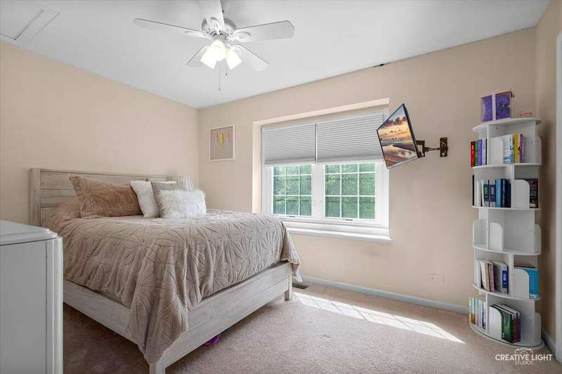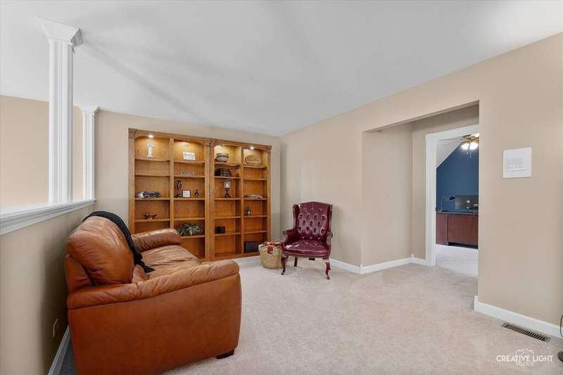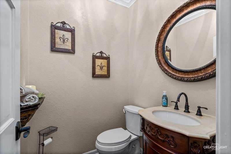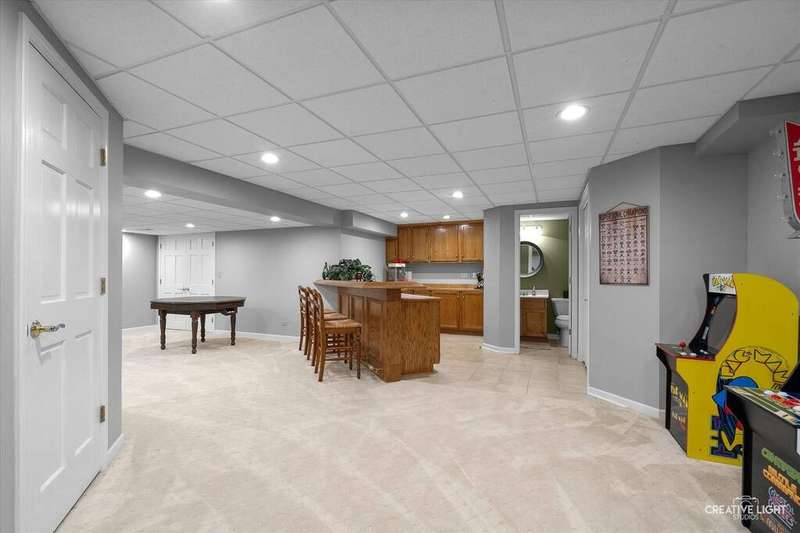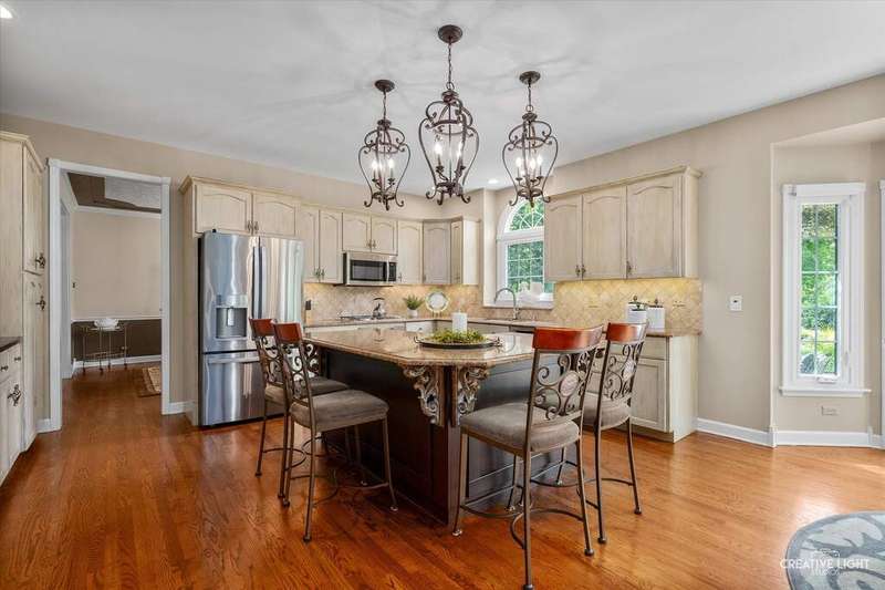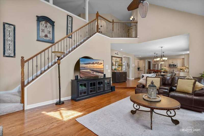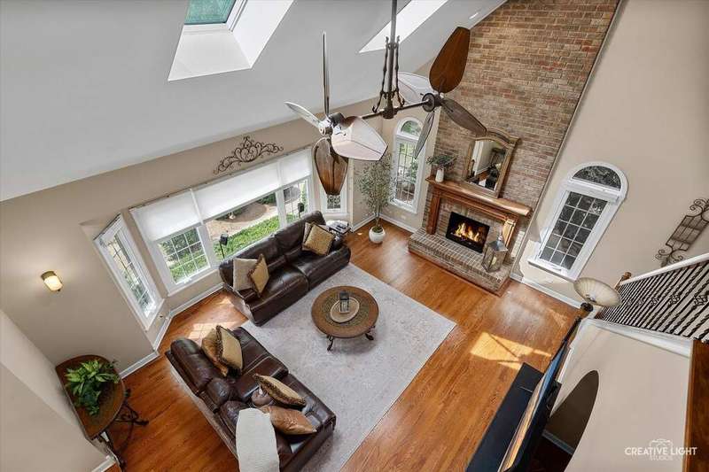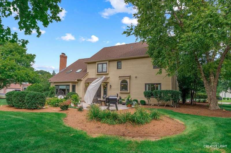 Prestigious River Run Half acre+ corner lot! This elegant 3700+ SF custom built home by Kings Court Builders blends refined luxury with thoughtful updates throughout. Featuring 4 bedrooms, 4.5 baths and a fully finished basement with newer carpeting, this home offers space, sophistication and timeless comfort. Step inside the grand two-story foyer to find stunning hardwood floors and a beautiful staircase with wrought iron spindles. The formal living and dining rooms offer custom white wood work with crown molding and tray ceiling. The 1st floor office has french doors, crown molding and built ins. The beautiful large kitchen with granite counter tops, SS appliances, large island, separate coffee bar and wet bar make this an entertainers dream. The Fanimotion paddle fan and 2 story brick gas log fireplace add to the grandeur of the family room. This central gathering place offers an impressive vaulted ceiling with 2 skylights, amazing views of the beautiful backyard and a rear staircase with wrought iron spindles that mirror the foyer staircase. The 1st floor also has an updated mud room with board & batten, coat closet, separate laundry and updated powder room that has space that can be converted to full bath by adding shower. Stunning cathedral master bedroom with adjacent cathedral master bath with skylight, double sink, soaking tub and walk-in closet with custom Closet Works organizers. Two of the Three additional bedrooms have cathedral ceilings, one w/adjacent full bath and large loft overlooking Fam Rm perfect for an in-law set up. The third 2nd floor bath has double sinks and a compartmentalized toilet and shower room. An additional 1,300+ sq ft of living space in the finished basement w/full bath, wet bar + mini fridge, theater area,rec/game room and unfinished room for storage. The 3 car garage has deep 3rd bay! Step into the serene beautifully landscaped back yard with new stamped concrete patio (2023). Dual zone A/C (new 2021 & 2022), sprinkling system, New Sump Pump Battery Backup (2019), New Roof (2020), New Gutters (2020), New Skylights (2020), New Pella Energy Efficient Maintenance Free Windows (2021), New Pella Patio Door (2021), Two New Furnaces (2022), Two New Hot Water Tanks (2023), New Stamped Concrete Front Walkway and Stoop (2023) Home comes with Equity Membership to River Run Club: includes heated indoor/outdoor pools, tennis and pickle ball courts, state of the art gym, sauna and steam room. Award winning IPSD 204.