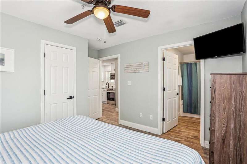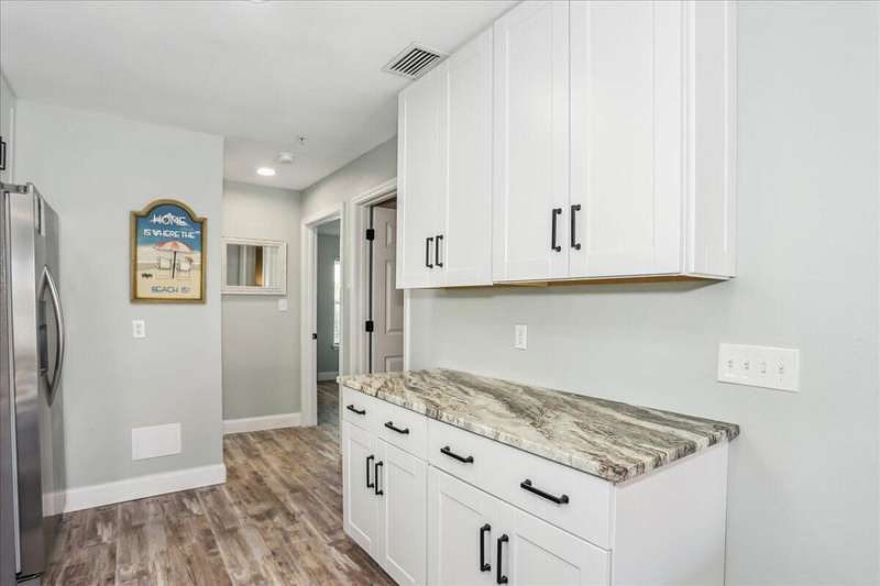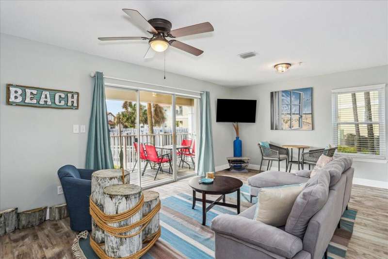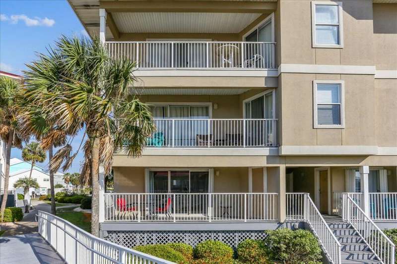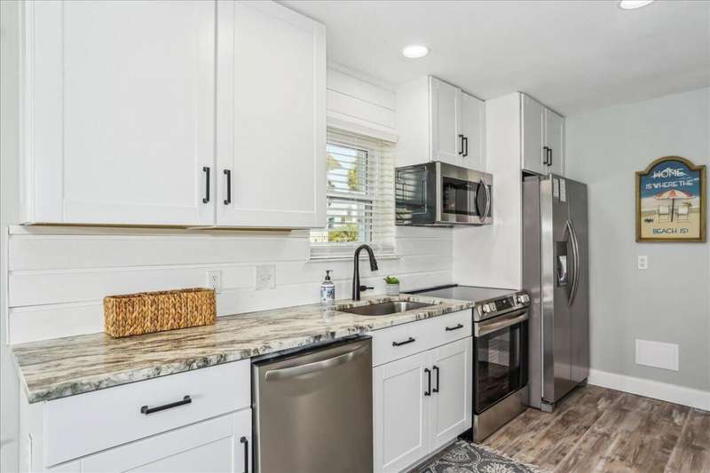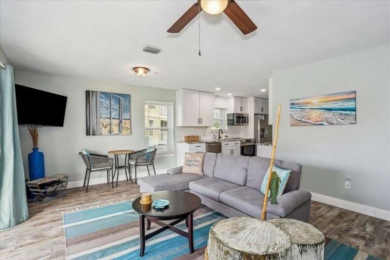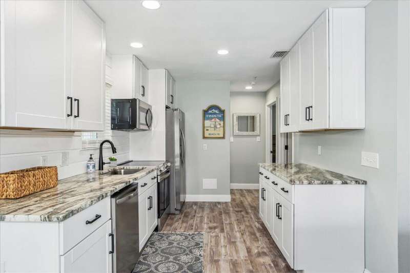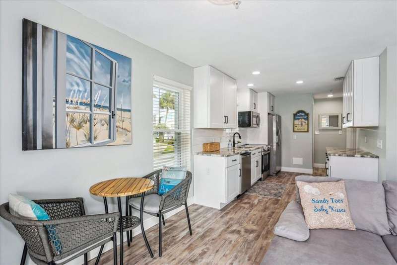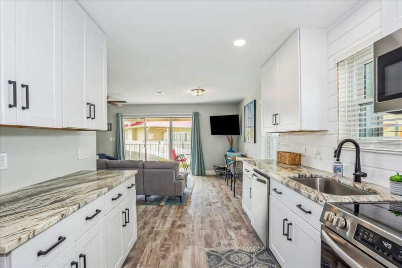 Experience the ease of island life in this completely renovated 2-bedroom, 2-bath, sound front condo--just a 6-minute walk from the white sands of Navarre Beach. With new LVP flooring and fresh paint throughout, this first-floor unit - no stairs! - is turnkey and perfectly blends style, comfort, and functionality. Inside, a bright, open-concept layout welcomes you with coastal charm and effortless flow. The living and dining areas seamlessly connect to the kitchen, making entertaining or relaxing a breeze. Kitchen updates add a fresh, modern flair with white cabinetry, granite countertops, and stainless appliances. The sliding glass doors invite the natural light and lead to a large private balconyyour front-row seat to stunning sunset views over the Santa Rosa Sound. Both bedrooms are spacious with ample closets, offering a serene escape after a day of sun and sand. Both bathrooms have been tastefully updated to reflect a clean, modern coastal aesthetic with new vanities, toilets, and fixtures. Whether you're lounging by the pool, strolling to the beach, or watching the sun set over the Sound, this Navarre Beach gem is your ticket to low-maintenance luxury in one of the Gulf Coast's most desirable destinations.