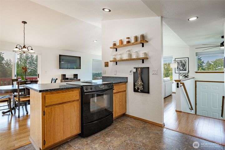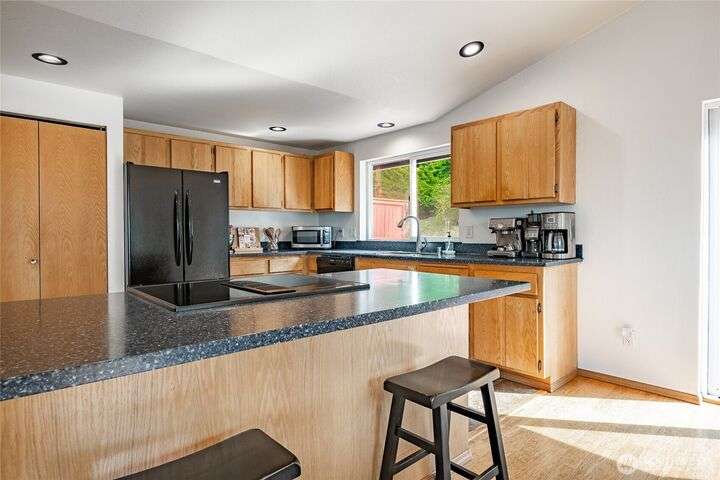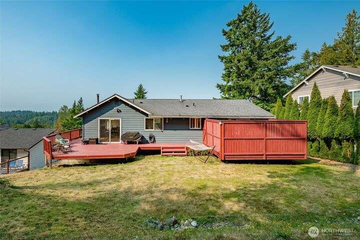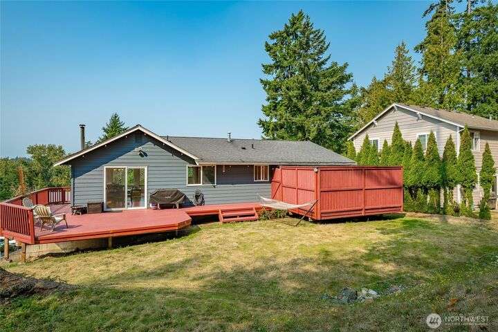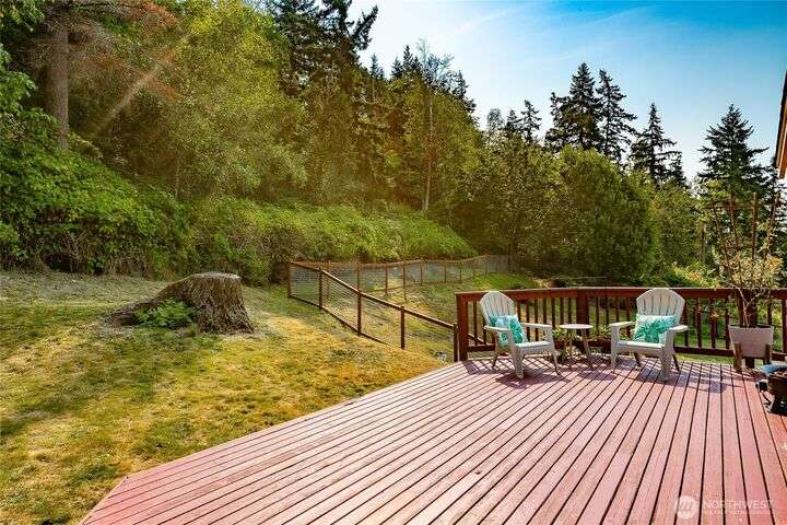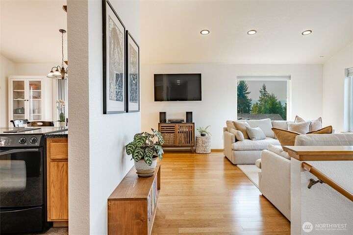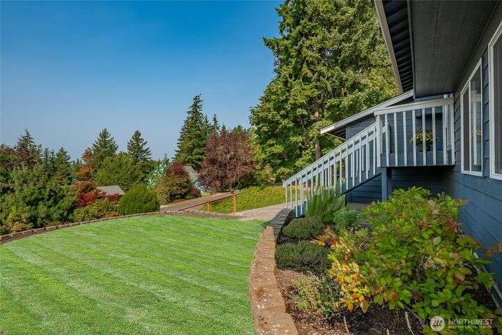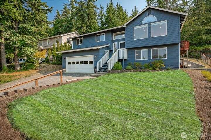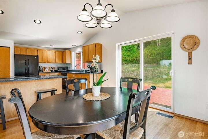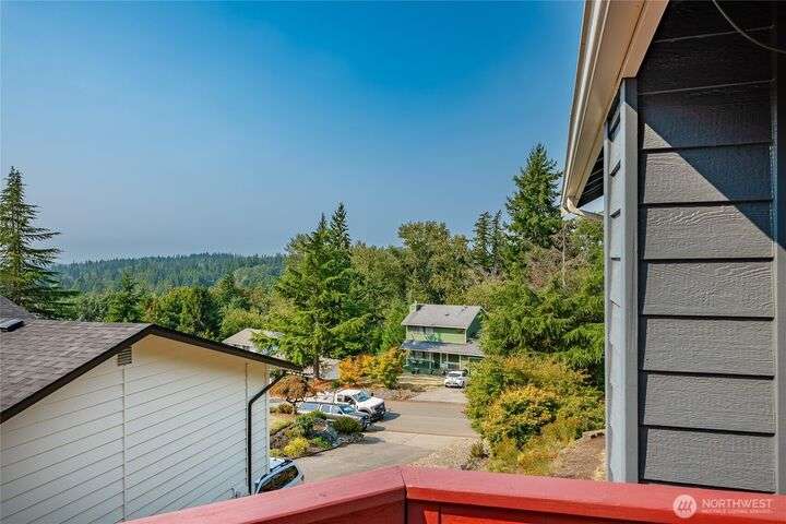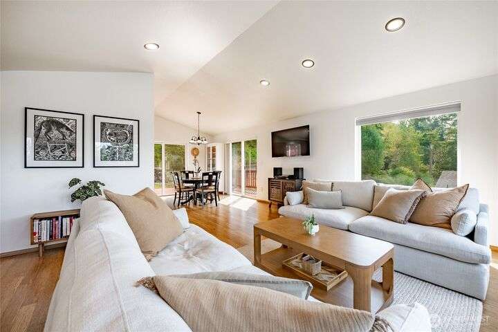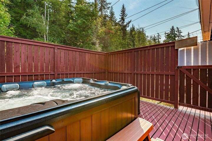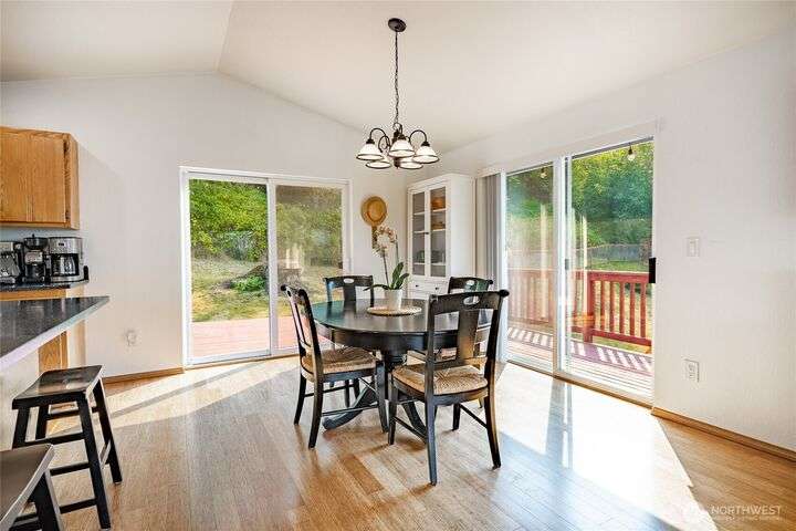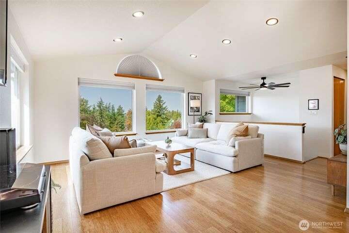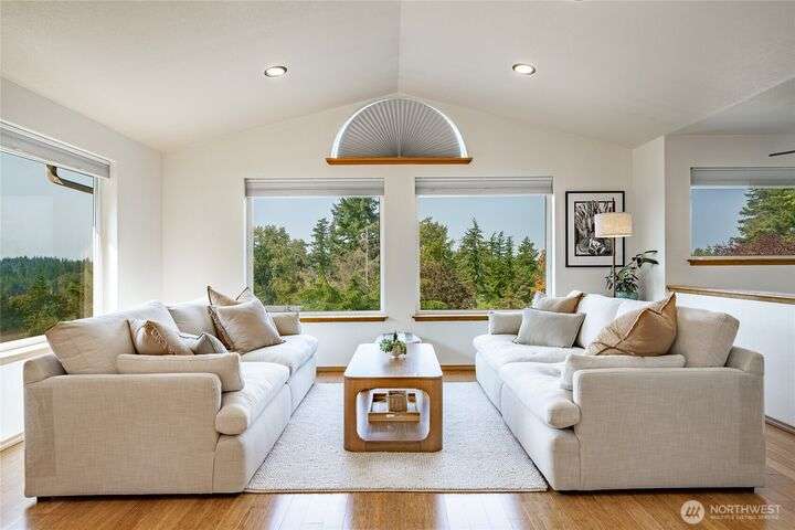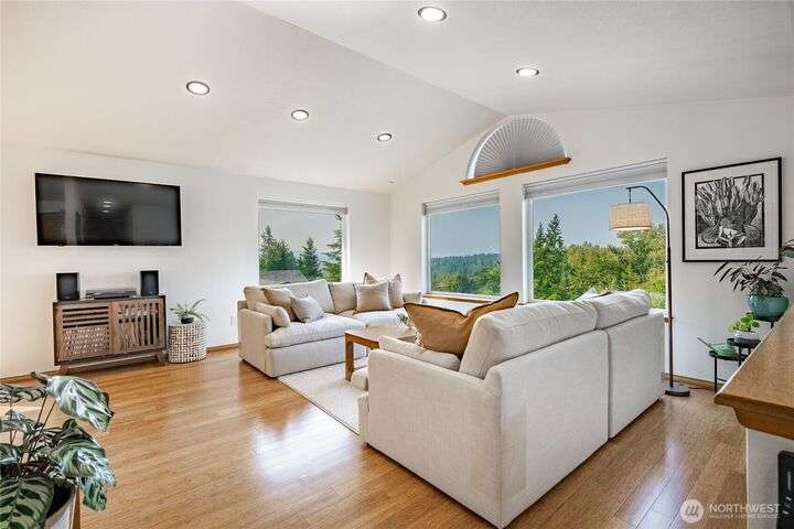 Revel in comfort and peaceful living in this hilltop home with stunning surroundings. The living room’s vaulted ceilings and bamboo flooring create an inviting, light-filled space. The open kitchen features easy-care countertops, and sleek quartz finishes add a touch of elegance to the bathrooms. Just off the primary suite, step into your private hot tub and unwind. Practical updates include a high-end heat pump, hot water heater, and brand-new carpet. Bonus spaces throughout offer flexibility for work and play. Oversized garage has ample space for storage or a workshop. Located minutes from Barkley Village and Bloedel Donovan Park, this home balances serene living with easy access to trails, shops, and dining.
