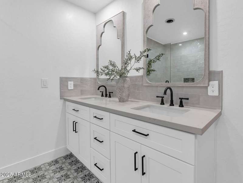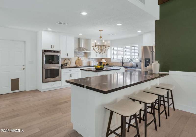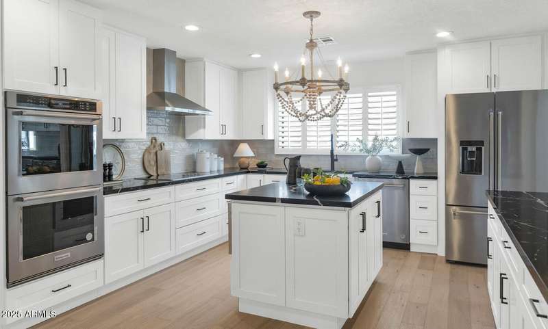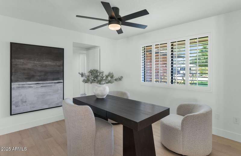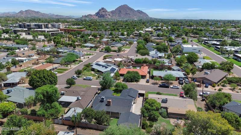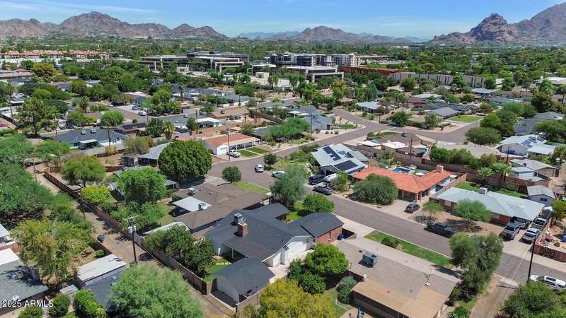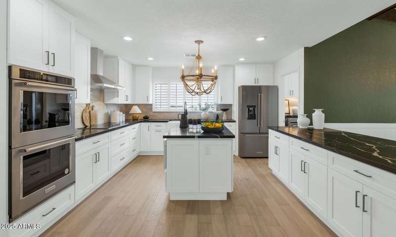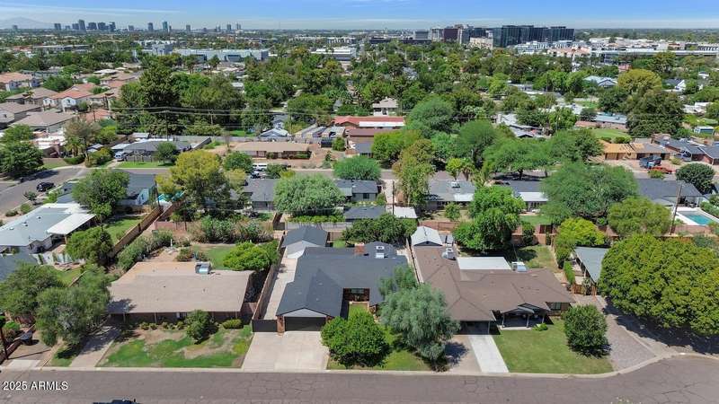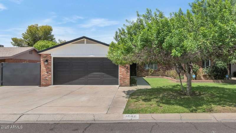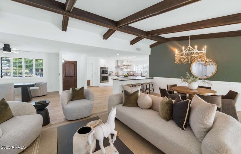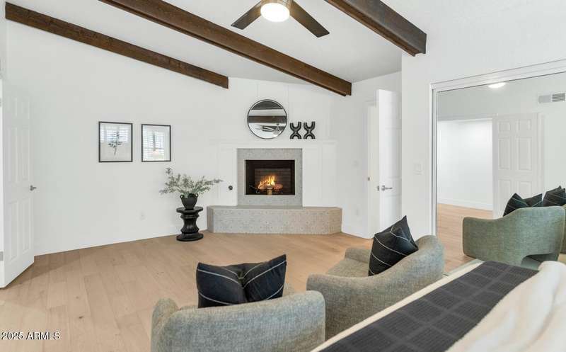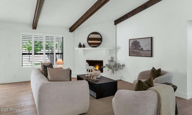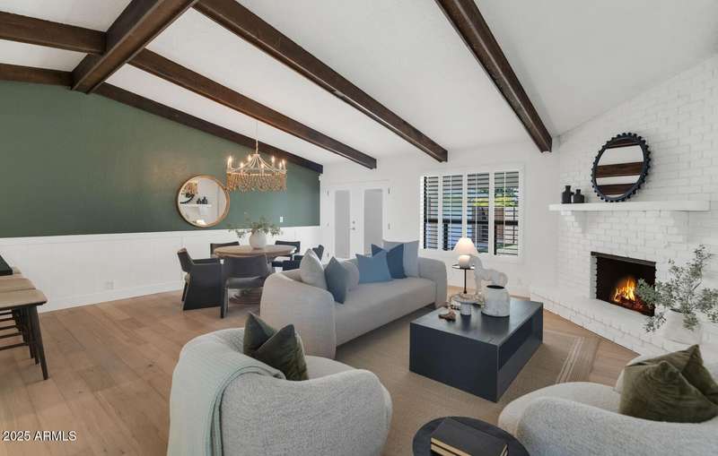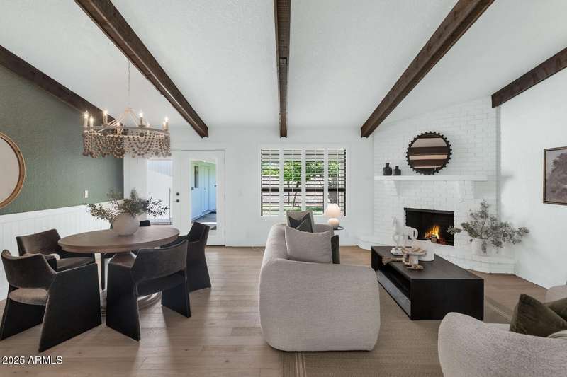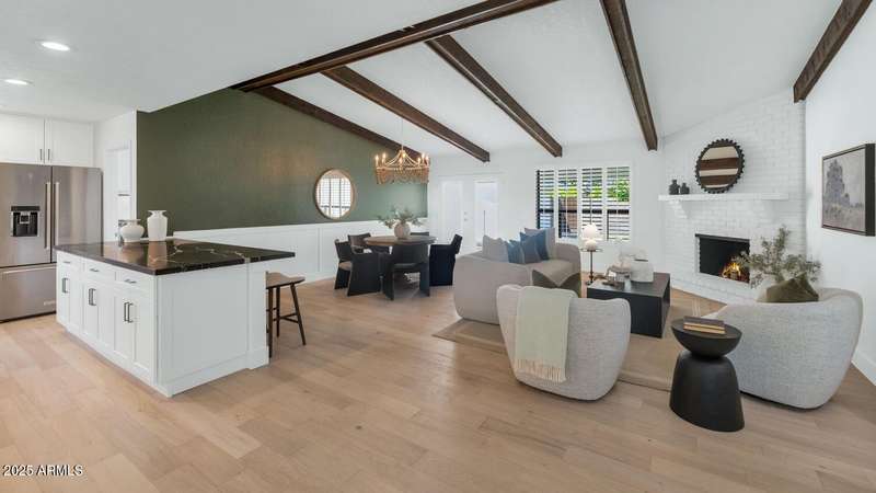 Perfect for first-time buyers or those looking to downsize, this beautifully remodeled home blends style, comfort, convenience, and garage space with room for ALL your toys! The light-filled island kitchen boasts pristine white cabinetry, elegant marble countertops, and stainless-steel appliances—ideal for both everyday living and entertaining. The spacious living room features striking exposed wood beams and a stunning floor-to-ceiling brick fireplace, creating a warm and inviting atmosphere. With three generous bedrooms plus a versatile bonus room perfect for a home office or gym, there's room to live, work, and relax. The serene primary suite offers its own cozy fireplace and an oversized walk-in closet. Third bedroom is shown open to living space but easily returned to a private bedroom. Outside, you'll find a beautifully landscaped yard with lush grass, incredible curb appeal, and a rare four-car garage. Located within walking distance to some of Phoenix's best shopping, dining, hiking trails, and entertainment, this home truly has it all.