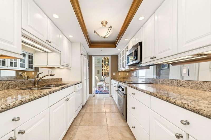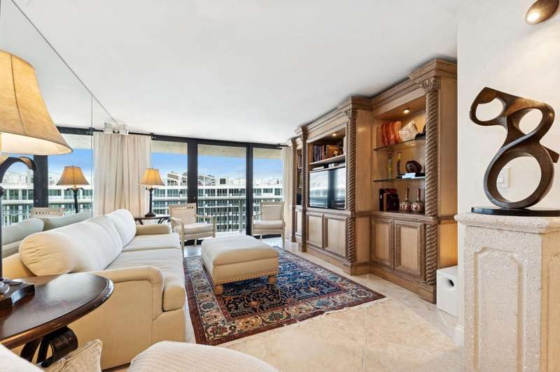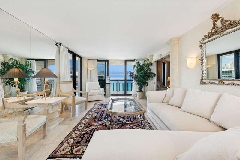 Unique opportunity for a beautifully designed 3BR residence in Tiara. The double unit showcases both ocean and Intracoastal views. Open living areas feature coral-stone columns and flooring. The second bedroom serves as a private guest suite with its own living room, while the third functions as a den easily convertible to a full bedroom. The layout offers an office, laundry room, and custom closets for ample storage. A large, welcoming foyer includes a custom dry bar with a 144-bottle wine cooler. Two garage parking spaces included. Easy to show. 24/7 concierge & staffed gate, valet, pool, jacuzzi, tennis, pickleball, fitness centers w/ steam & sauna, billiards, library, card room, plus dining at the 43rd-fl Marquis Lounge & poolside Gazebo. 15 min to shopping/dining; 25 to PBI.