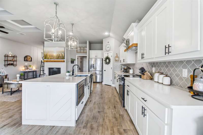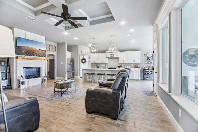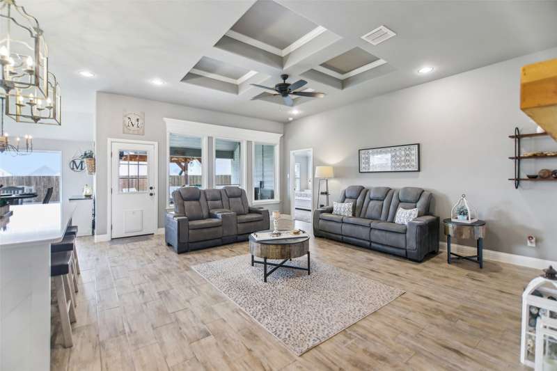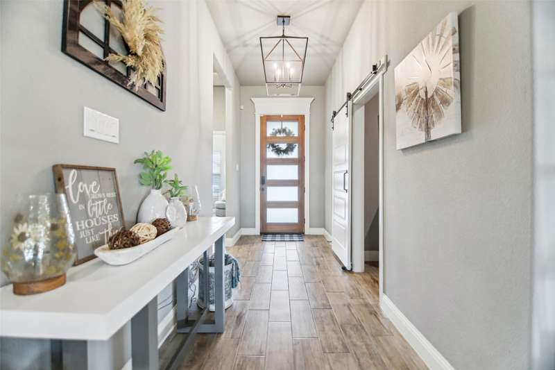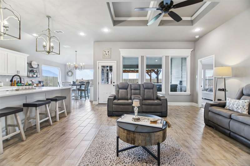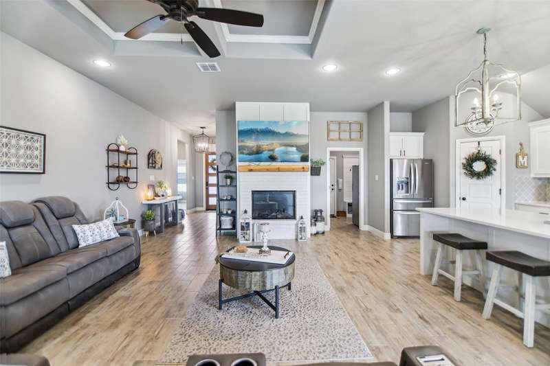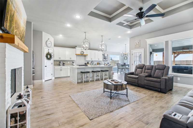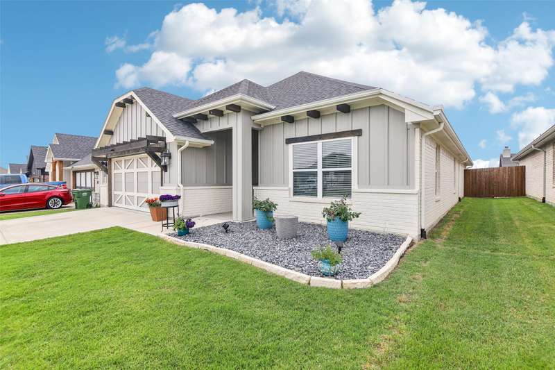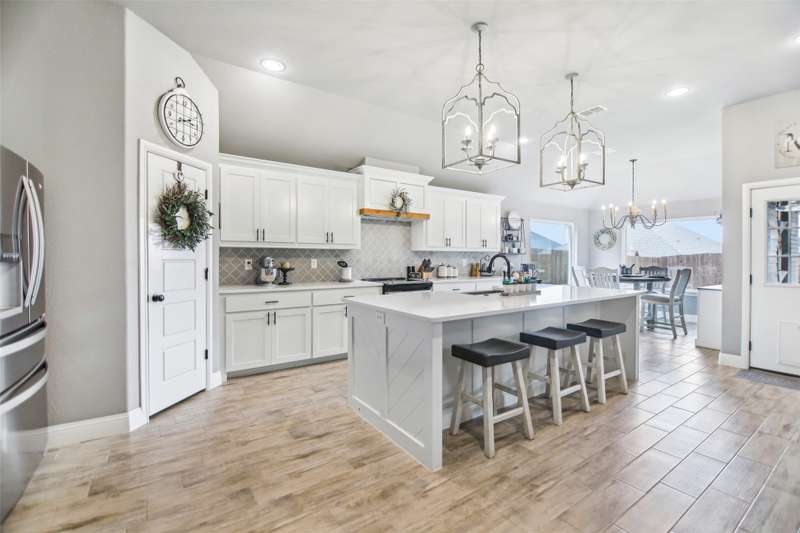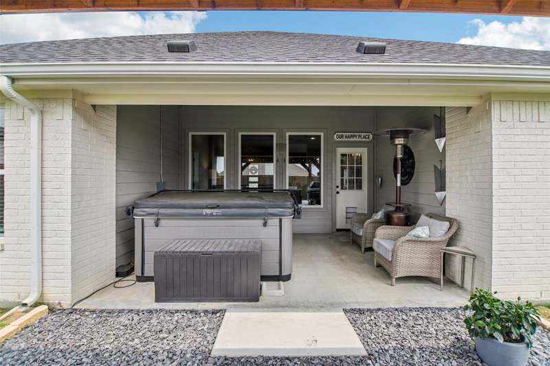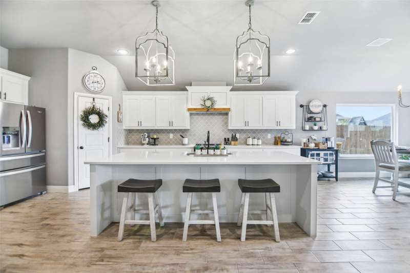 Welcome to this beautifully crafted farmhouse-style home by Double Rock Homes, where modern elegance meets timeless charm. From the moment you arrive, you'll be captivated by the thoughtful details and inviting design that make this home truly special.Step inside to discover warm wood-look tile flooring that flows seamlessly throughout the main living areas, offering the perfect blend of durability and rustic style. A spacious and private home office sits just off the main entry, featuring a barn door that adds both character and function.The heart of the home is the open-concept living, dining, and kitchen areaperfect for entertaining or enjoying quiet family time. The kitchen shines with sleek quartz countertops, abundant cabinetry, and modern fixtures. Exceptional lighting throughout the home creates a bright and welcoming ambiance in every room.The primary suite is a true retreat, complete with a spa-inspired ensuite bath featuring dual sinks, a walk-in shower, and ample closet space. Secondary bedrooms are well-sized and thoughtfully designed to suit a variety of needs.You'll appreciate the convenience of a spacious utility room that includes a built-in mud bench and designated space for a freezerideal for keeping your home organized and efficient.Step outside and enjoy not one, but two covered patios! The main patio provides a great space for relaxing or entertaining, while the additional covered patiocomplete with lightingis perfect for evening gatherings or creating your dream outdoor living area.Every detail in this home reflects Double Rock Homes commitment to quality craftsmanship and stylish design. Whether youre hosting guests, working from home, or enjoying a quiet evening on the patio, this farmhouse-style gem offers comfort, function, and beauty in every square foot.