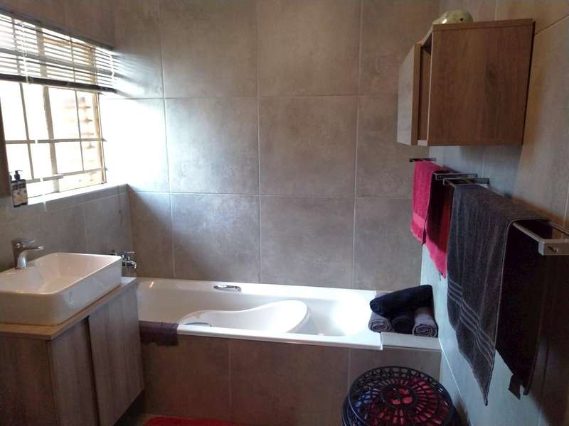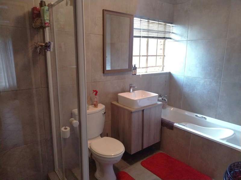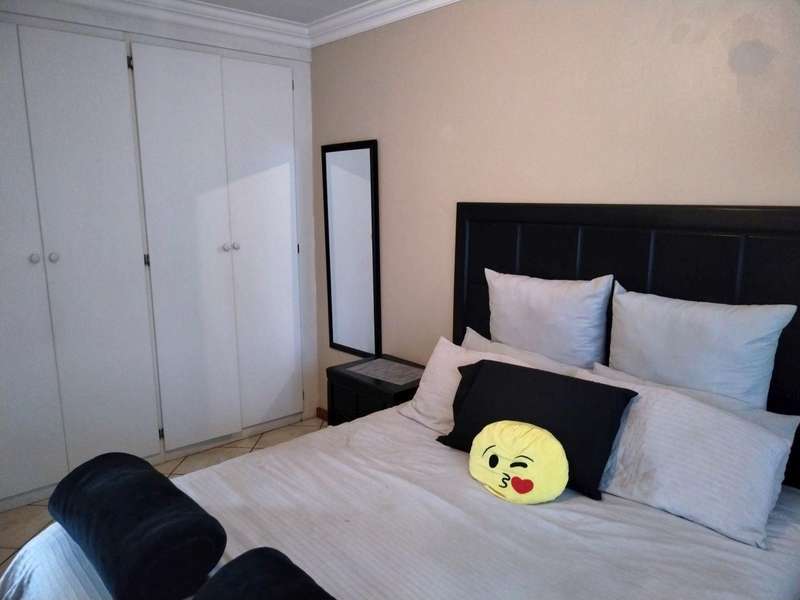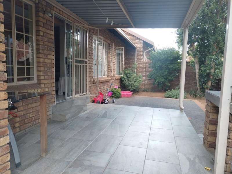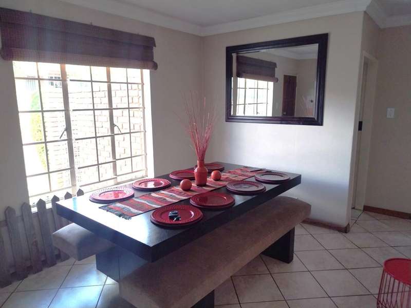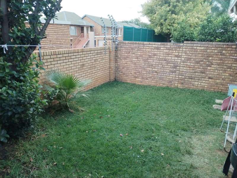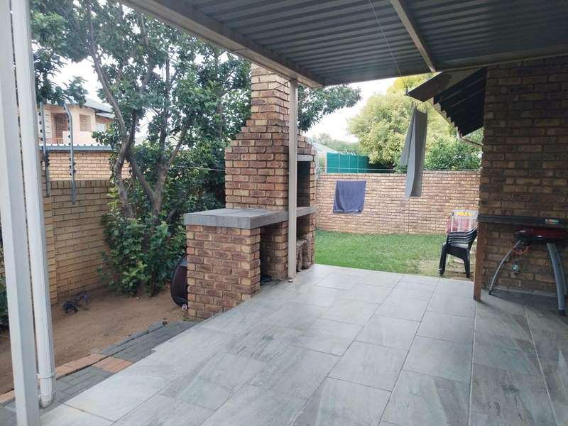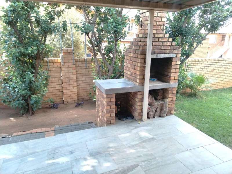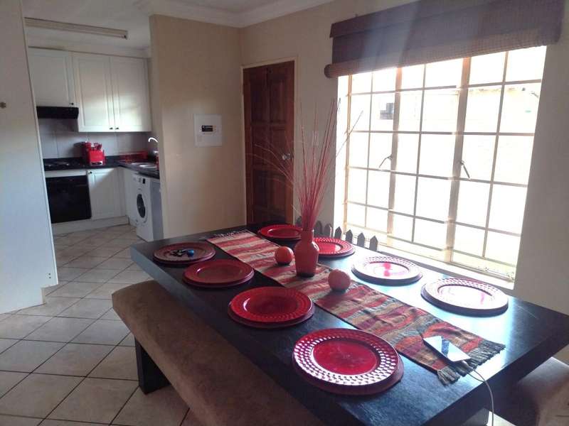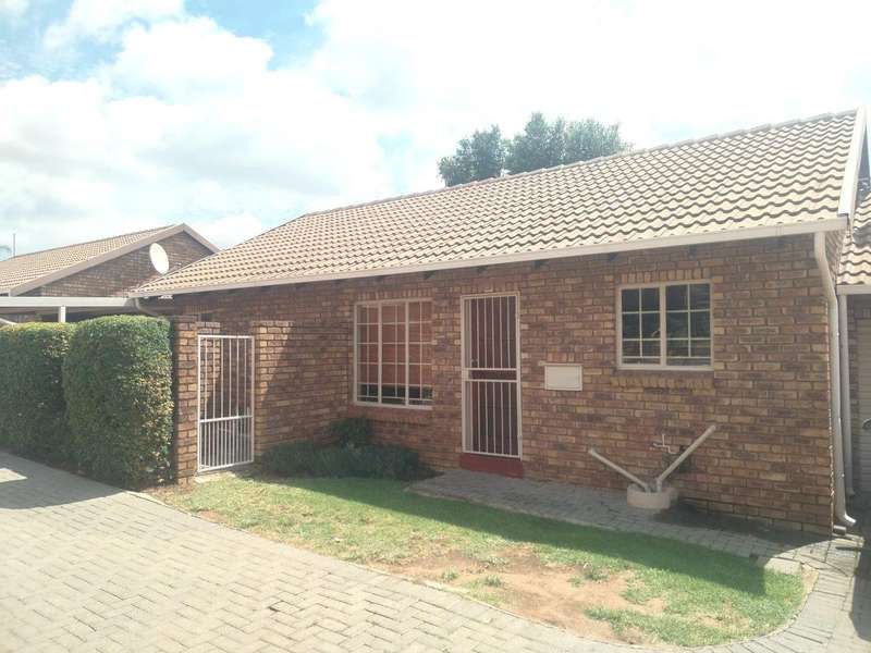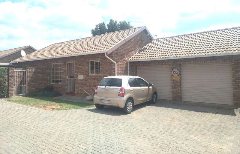 Modern 2-bedroom townhouse for sale in Amberfield Crest Security Estate. Open-plan lounge, dining room with modern kitchen, 1 full bathroom, and double garages. Private patio with built-in braai and established garden.