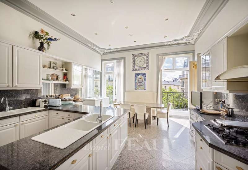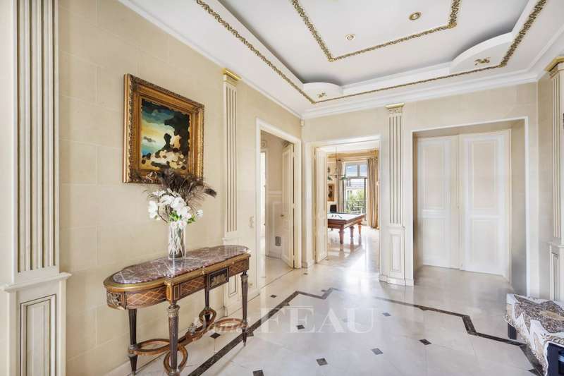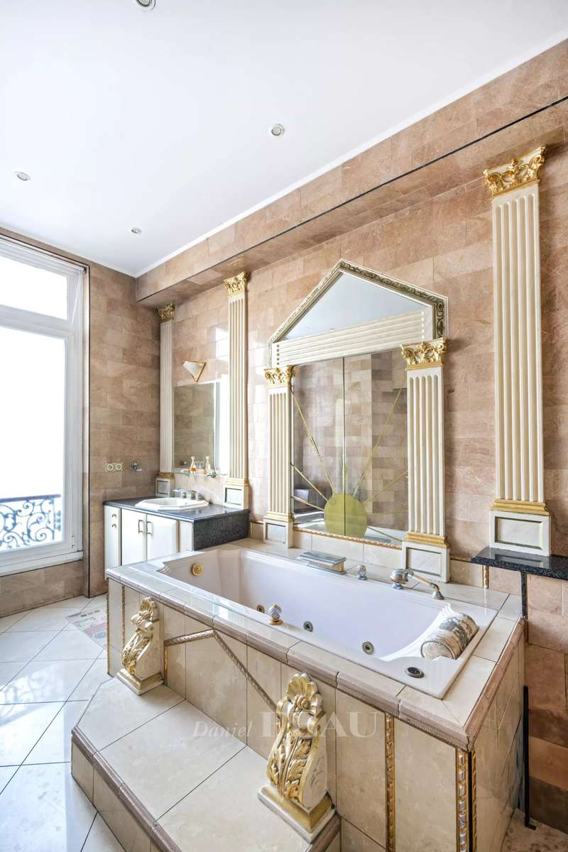 Boulevard de Magenta. This elegant 258 sqm apartment on the 3rd floor of a fine freestone building with a lift features 3.60 metre high ceilings. An entrance hall leads to a double living/reception room benefiting from wide floor-to-ceiling windows opening onto a balcony, a dining room, a kitchen with dining facilities, five bedrooms (four overlooking a courtyard), four bathrooms and a separate wc. Ample fitted storage space. With two cellars and a double lock-up courtyard garage at extra cost. Possible premises for a self-employed professional.