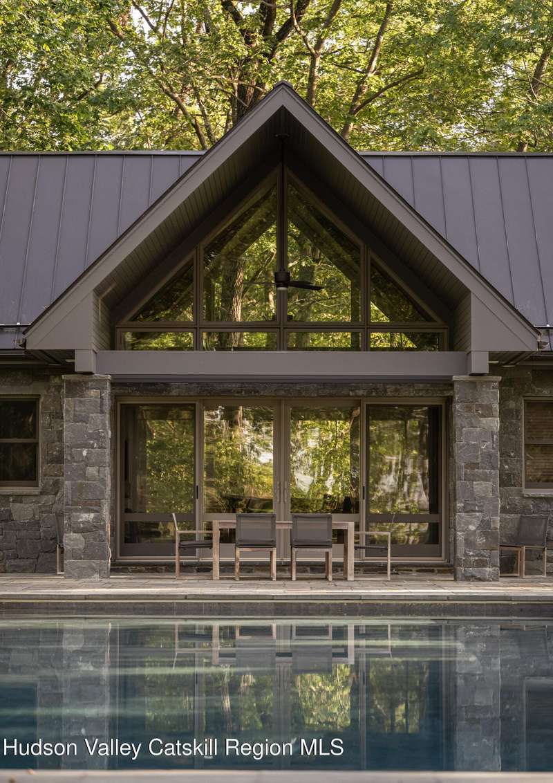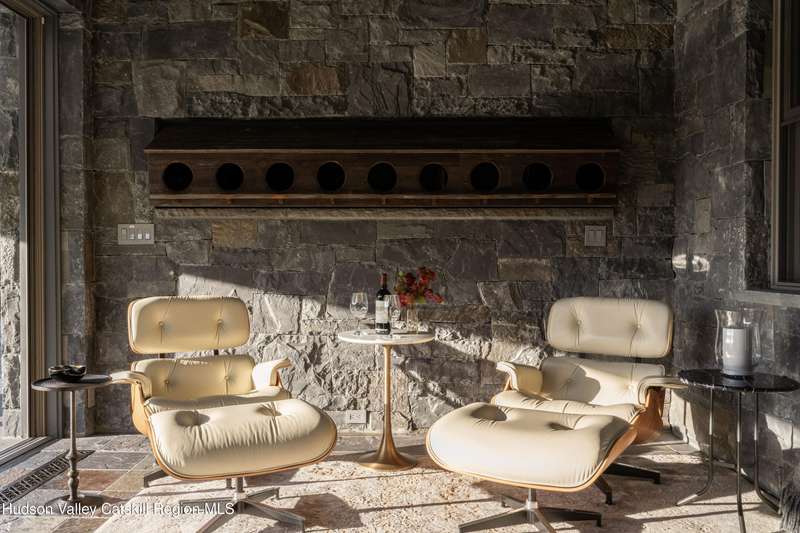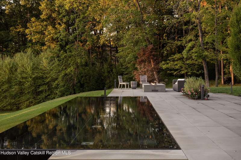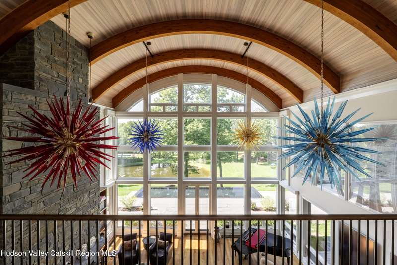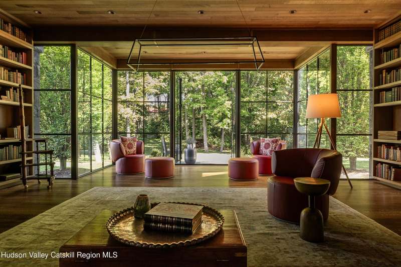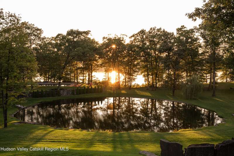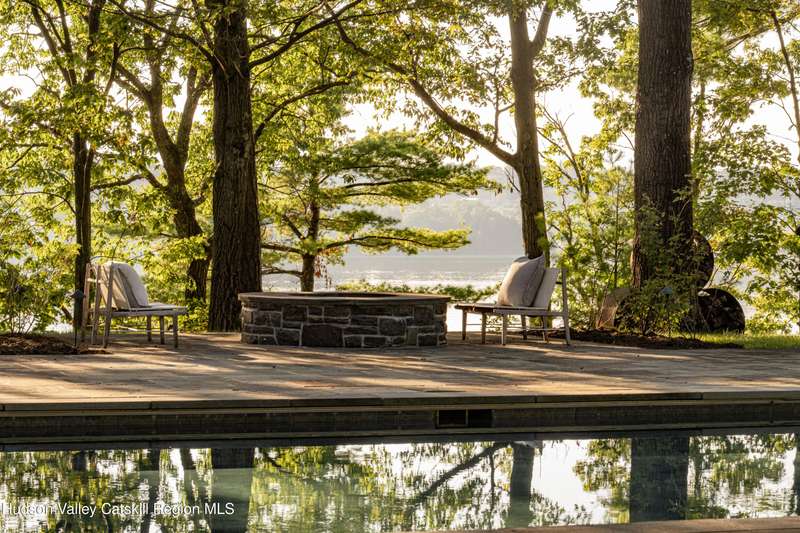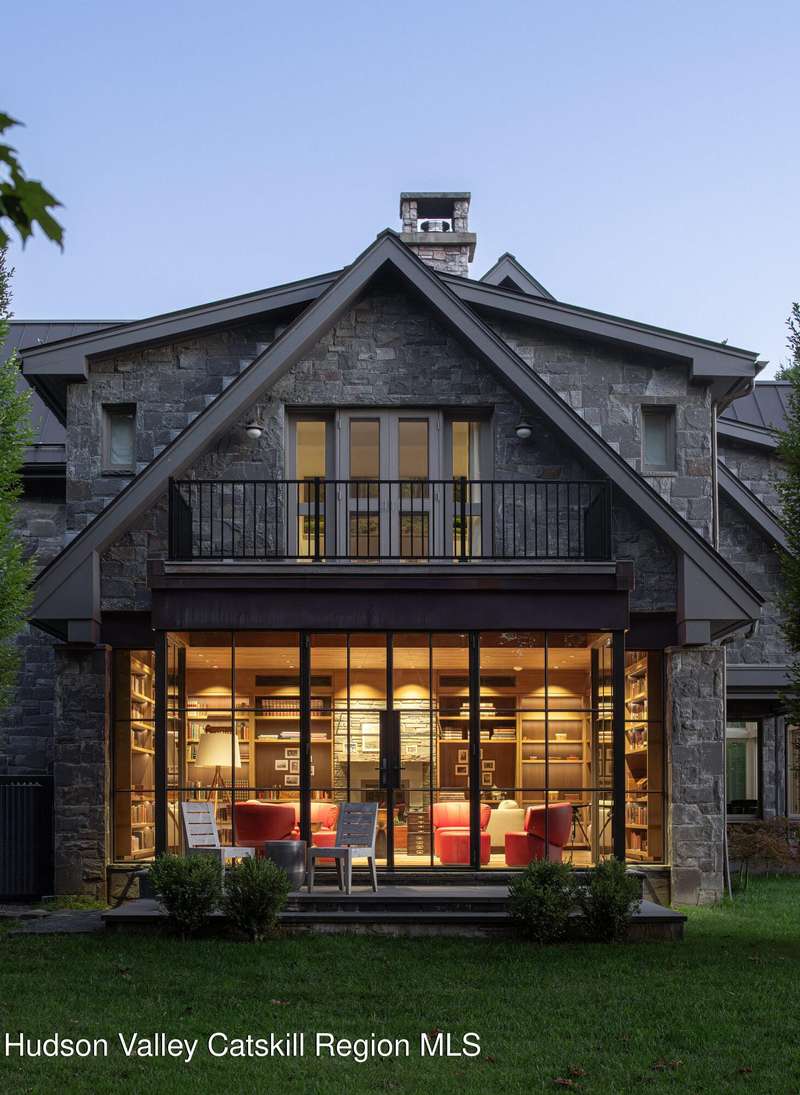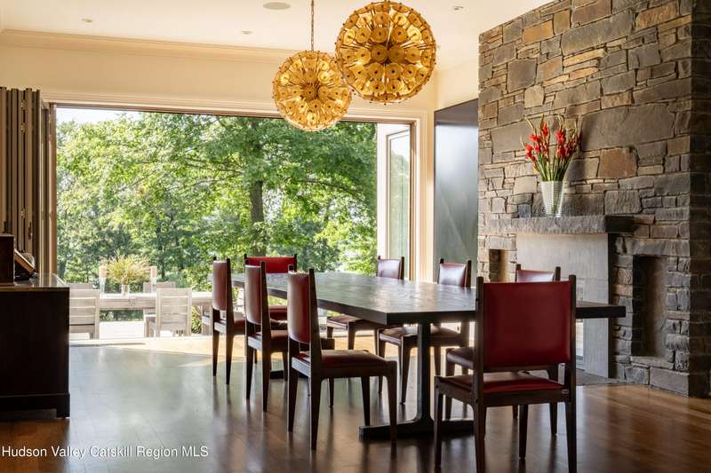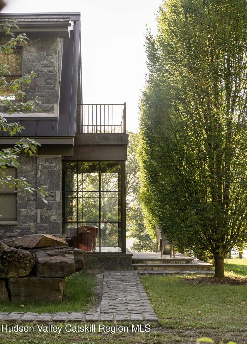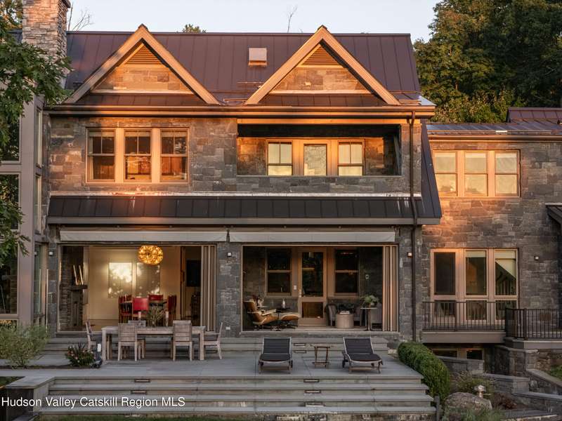 Stonecrest on the Hudson is a stunningly designed home on 16 inspiringly landscaped acres with extensive views of the river and the Catskills. A creation of stone, metal, and glass, the home, though imposing, inhabits its environment with seamless grace and is curated for comfort and meditative living. Many exquisite features make Stonecrest one-of-a-kind, impossible to duplicate. Upon approach, visitors notice the striking geometric roof lines and large portico. Inside, the home is open to light and nature through windows and soaring walls of glass. In the great room, forty-foot ceilings, a floor-to-ceiling stone fireplace surround, and curved transoms atop doors and windows make entry into Stonecrest a breathtaking experience. At the same time, there are many private spots for contemplation and quiet reflection that balance the grandeur of this remarkable home.In the south wing are a chef's kitchen with butler's pantry and a formal dining room that opens to a bluestone terrace. Top of the line appliances, honed granite countertops, and double sinks and dishwashers ensure that anything can happen in this room, from an afternoon snack to a formal dinner for 30 people. The butler's pantry has a second subzero refrigerator, a wine cooler, and sink. Also on this side of the house is an all-season sitting room and a mud room with its own covered portico for deliveries and access to the 3-car garage.On the north end of the home is a hallway art gallery, a private deck, an en suite guest bedroom, and best of all, a hidden library awaiting behind a secret door, with floor to ceiling windows, a fireplace, access to a private bluestone patio, and views of the river.The second floor can be reached by one of two gracious open stairways. A wide walkway that overlooks the great room extends the length of this second level. At one end is the primary suite that includes a private deck, a walk-through closet with separate dressing rooms and vanity space, and a spacious bathroom with jacuzzi and glass-bricked shower. The primary bedroom has windows on both sides with views of the river and sloping lawns. Next door is a second en suite bedroom that could also serve as a sitting room, den, or office.At the south side of the second story are two more en suite bedrooms, a media room, and entrance to an apartment annex with an open concept kitchen and living space, bedroom, and full bath. Perfect for employees or guests, this cozy space can be accessed from the back staircase for added privacy.On the lowest floor, a walk-out basement, an enormous space for creative pursuits, has easy access from inside or outside the home. Ample windows, a surround-sound system, and generous storage make this area versatile and convenient. Also on this level is a theater room and a second laundry/utility room.This property as it exists today cannot be recreated. For example, directly above the Hudson River, there is a resort-style saltwater swimming pool with stone pool house that includes a full kitchen and gathering space. Current zoning laws do not permit this kind of design nowadays.Countless stunning gems throughout the property include a reflecting pool with firepit and river views, an amphitheater facing the Hudson, a quarter-mile spiral labyrinth with stone paths divided by wild thyme, and a Koi-stocked pond with falling water. Seating areas dot the edge of the property above the river where spending hours watching the ships go by becomes a tranquil act of meditation.Though the home is an easy distance from charming Hudson Valley towns like Rhinebeck and a one-minute drive to the Rhinecliff Amtrak station, Stonecrest on the Hudson is as private and lost to time as an enchanted kingdom.