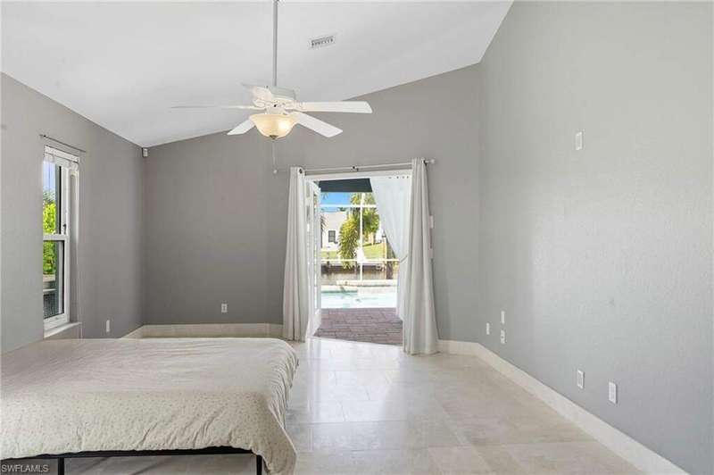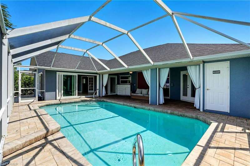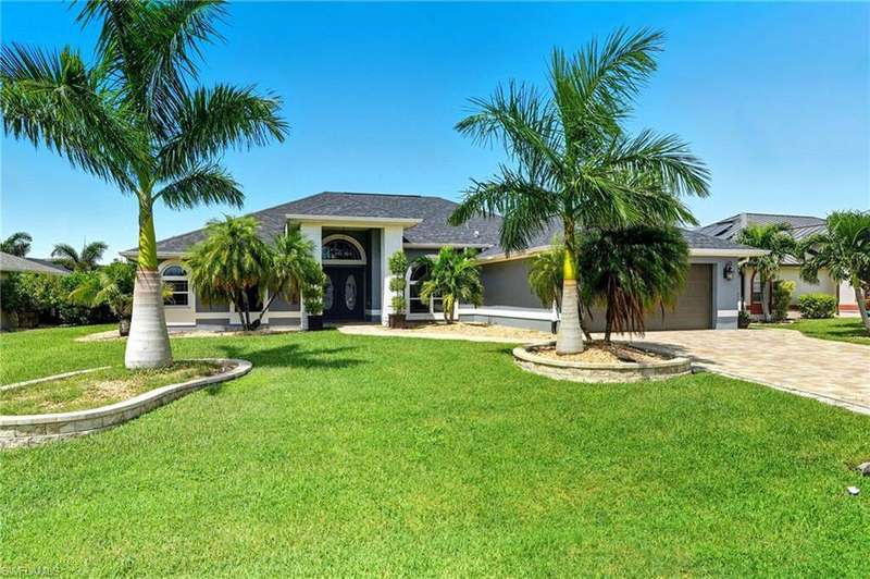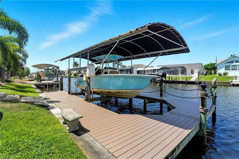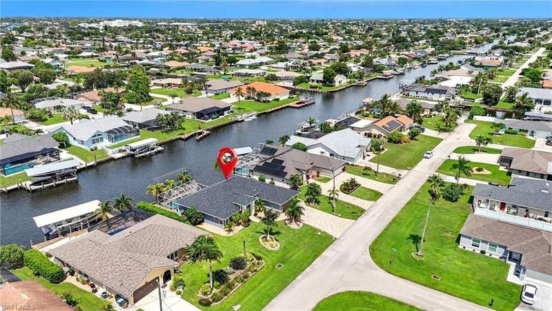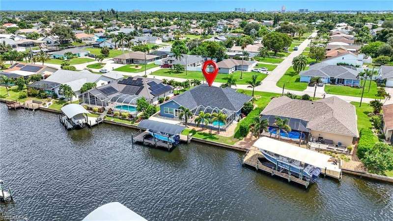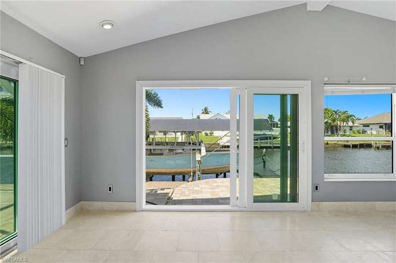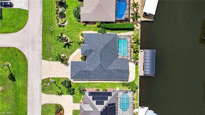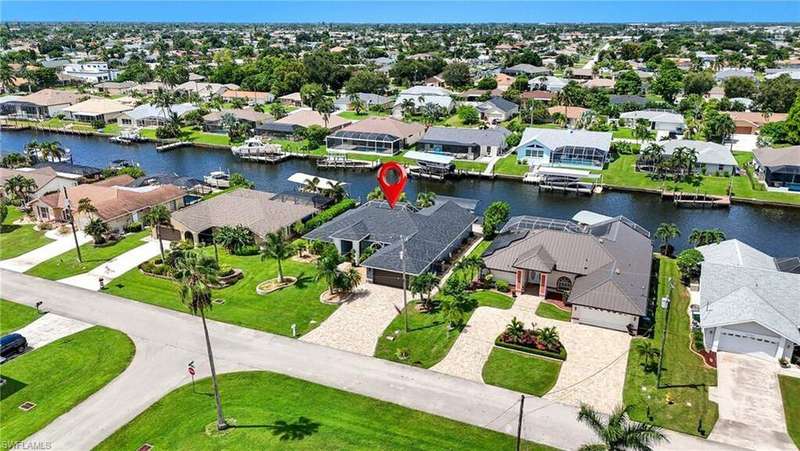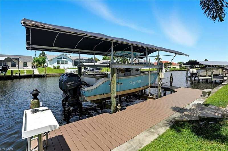 WATERFRONT LIVING AWAITS IN THIS STUNNING, NEVER FLOODED, SAILBOAT ACCESS CAPE CORAL POOL HOME. Set on a sailboat access canal with a quick 15 minute ride to the Caloosahatchee River, this 4 bedroom, 2.5 bath retreat blends comfort and elegance. Nearly every room offers water views, and the screened lanai, expanded captain's walk, and 10,000 lb covered lift make boating and outdoor entertaining effortless. Inside, travertine floors flow wall to wall, accented by granite counters, tile backsplash, and custom sliders that open wide to the outdoors. Major upgrades provide peace of mind: roof 2023, AC and ductwork 2022, hurricane windows and shutters, epoxy garage flooring, whole home water softener, Rainsoft filtration, hot water tank 2021, and pool pump 2020. Freshly painted exterior, paver driveway, extended patios, updated landscaping, and lanai screens complete the polished feel. Every detail has been enhanced for lasting quality and style, from retaining walls and sprinkler system to the boat lift canopy with electric and water access. Schedule your private showing today before this rare waterfront gem is gone.