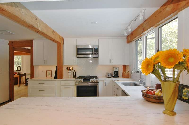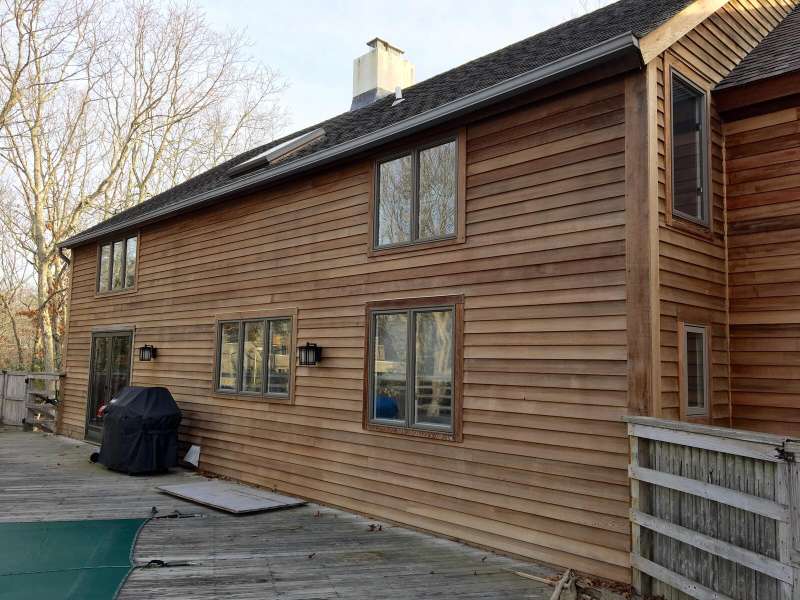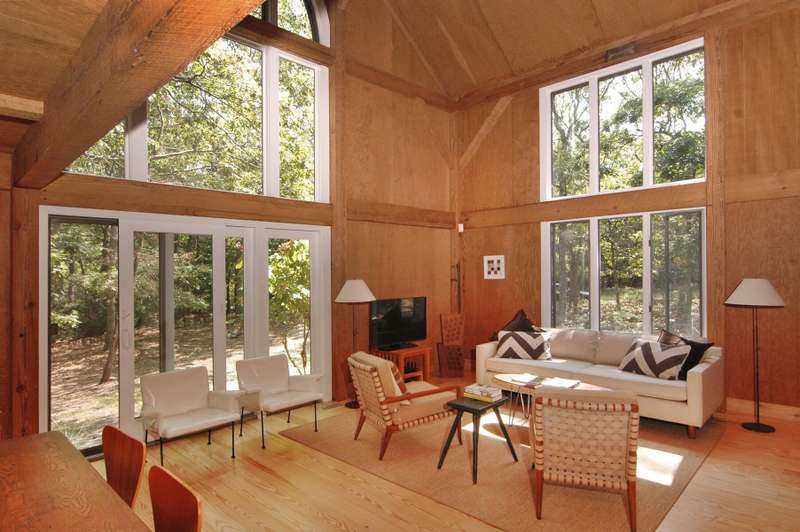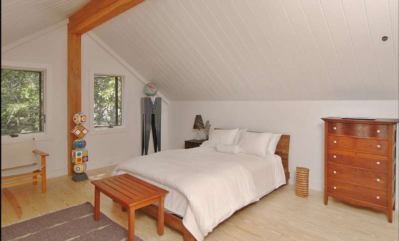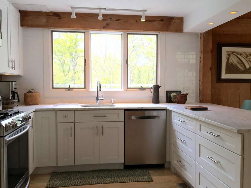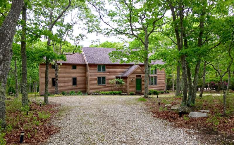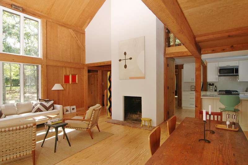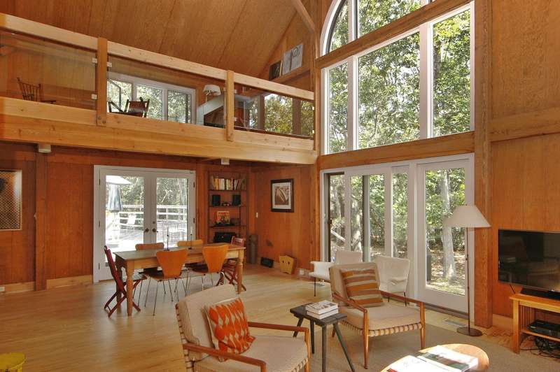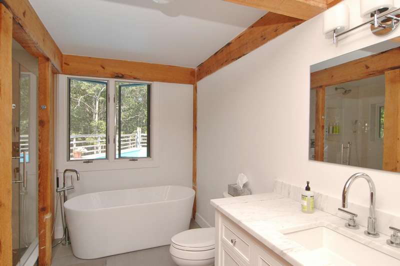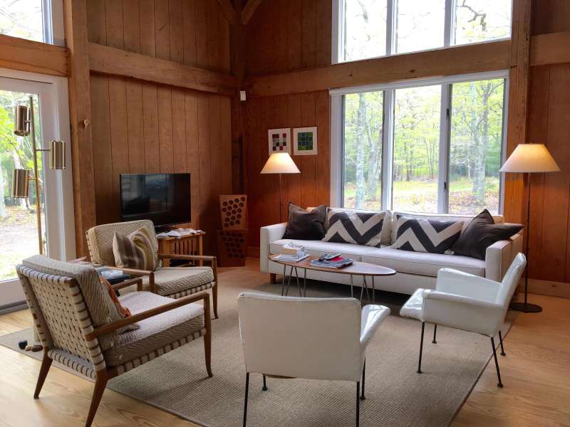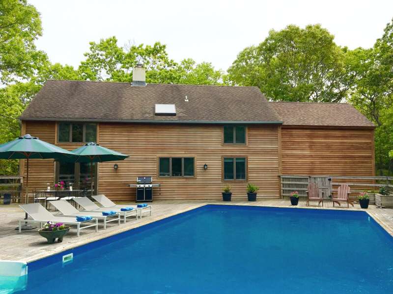Rental Registration #: 25-3 This is a completely renovated three bedroom/2.5 bathrooms, additional rooms, den, on .67 acres very close to East Hampton Village. The house features a soaring, double height living room, floor to ceiling windows, open living area. Three zones central air-conditioning. New kitchen, high end stainless appliances, all counter tops are white calatrava marble , finely equipped, perfect for entertaining indoors or out. The master suite is on the ground floor with a luxurious en-suite bath, huge glassed shower and a soaking tub, gray Italian porcelain tile and marble cabinet tops. The master suite includes a windowed sitting room. The second floor has two bedrooms with queen beds, additional large open loft area with skylight overlooking the living room and a separate den/tv room. The second floor bath includes a large walk in shower, skylight. There is a 20 x 40' saltwater swimming pool which is surrounded by a 1200 square foot wood deck with lounge furniture, dining table and umbrellas, vegetable and herb garden for guests to enjoy. The house is on a gentle winding, dead end street which backs on a large preserve. The house is fully stocked with everything needed in the kitchen for cooking, serving, entertaining, a new Weber gas grill, all new linens, bath and beach towels, a sound system with speakers, WiFi, cable included. The setting is private, grounds have substantial trees. Just north of East Hampton Village, three miles to ocean or bay beaches.