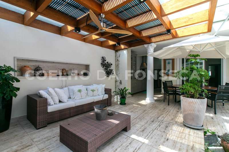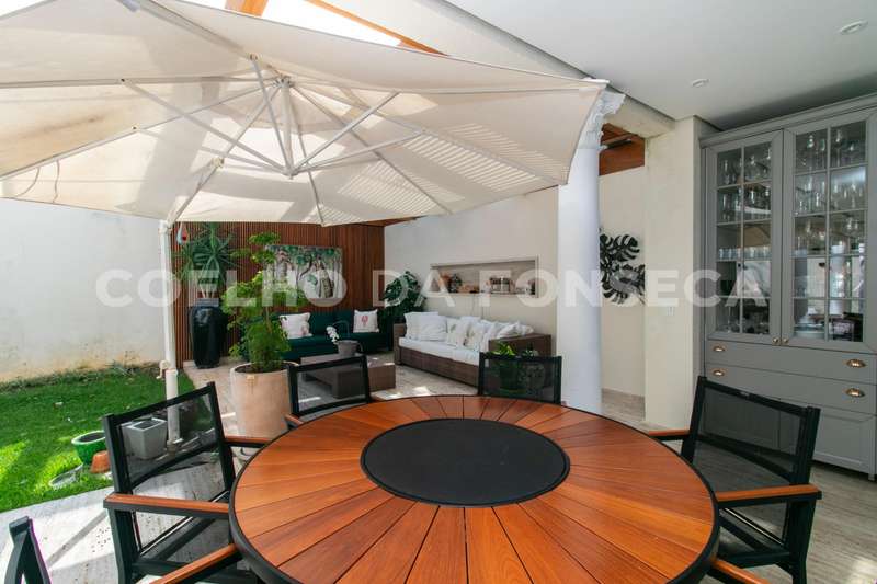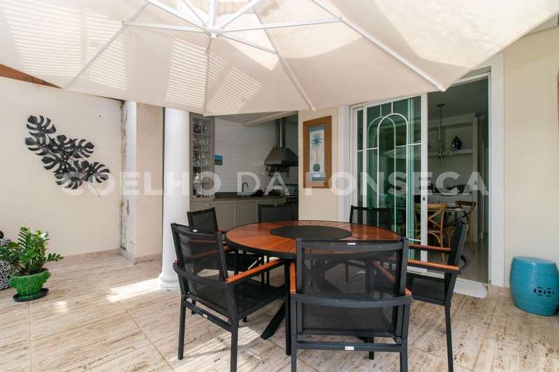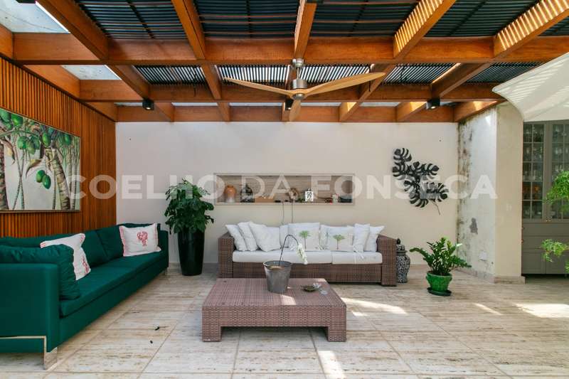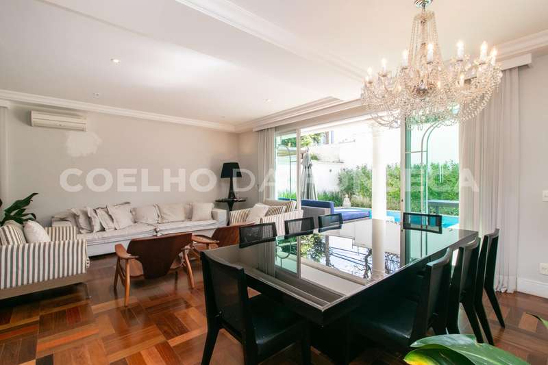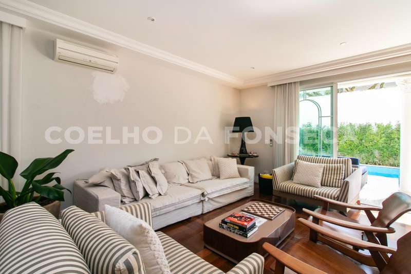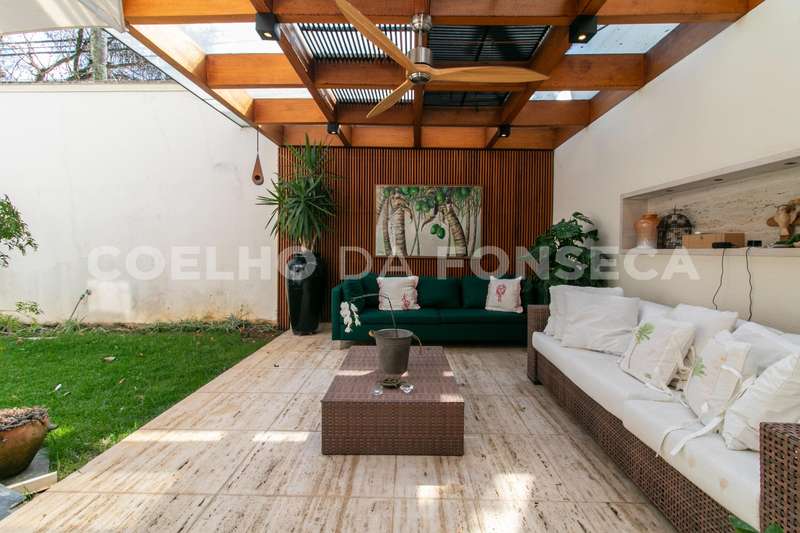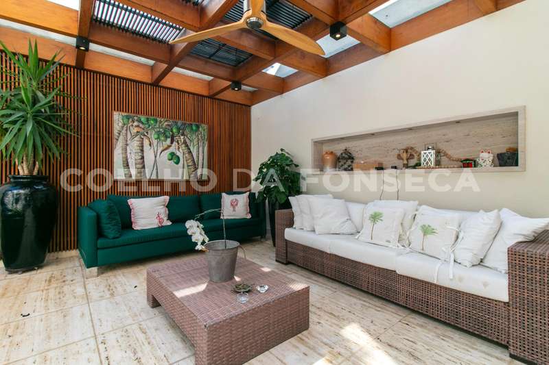 Living para vários ambientes integrado ao belo jardim com piscina, espaço gourmet e amplo ambiente para descanso, coberto.