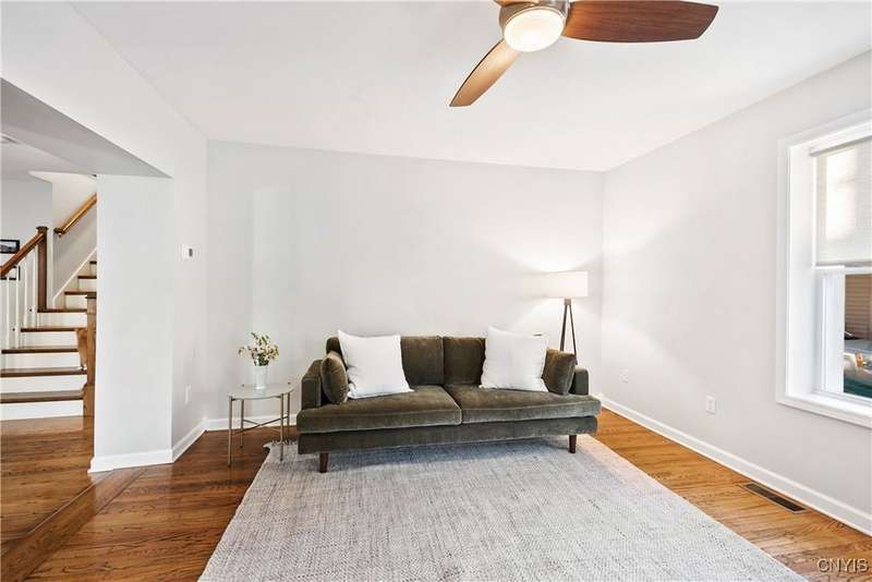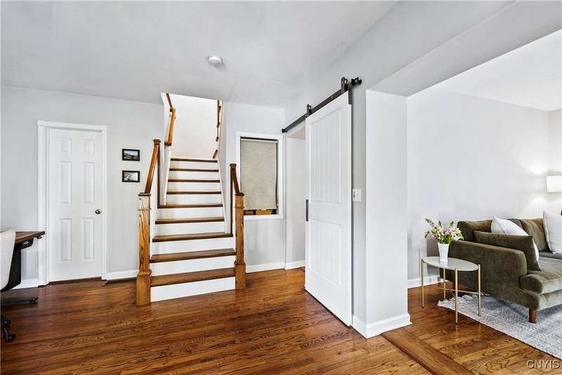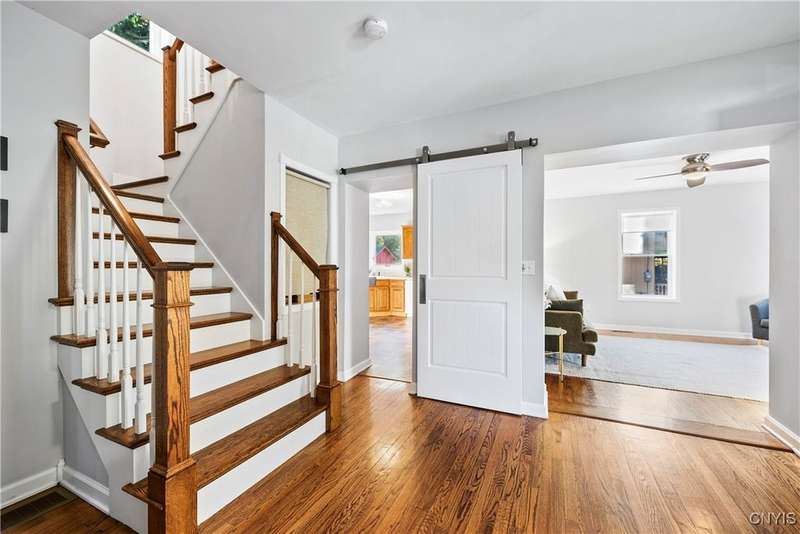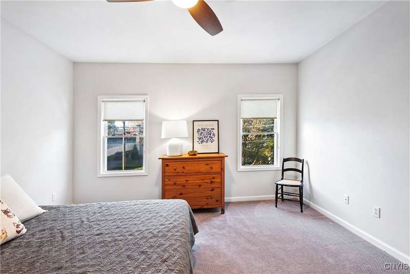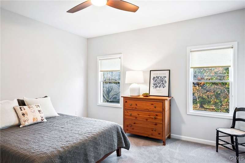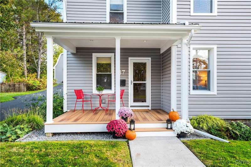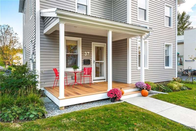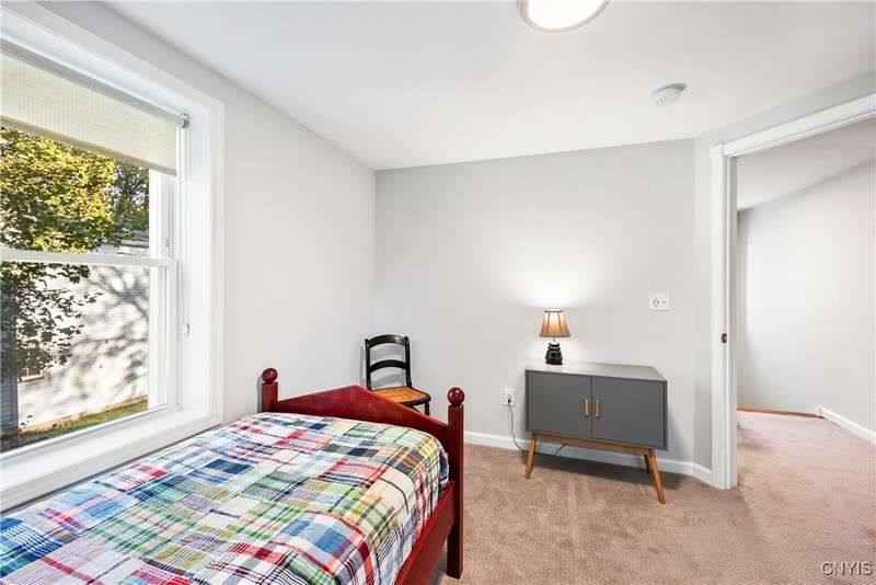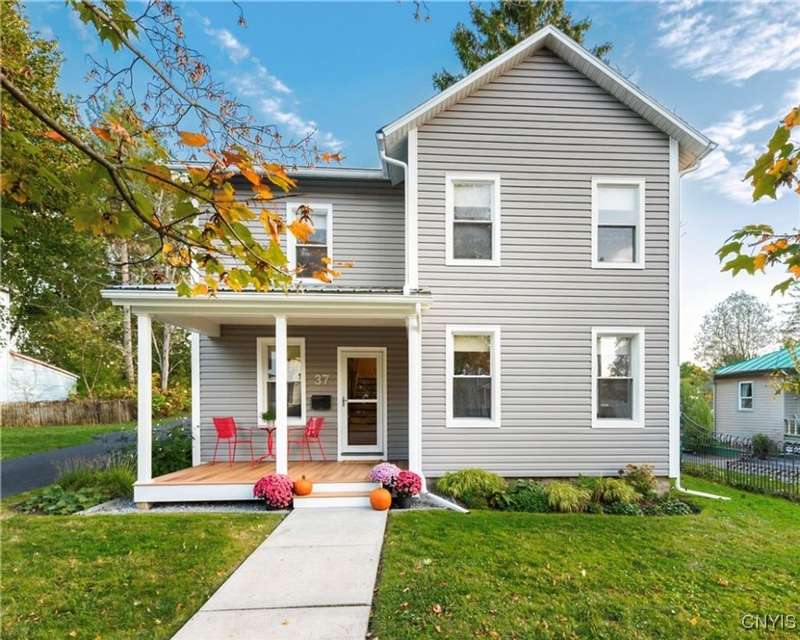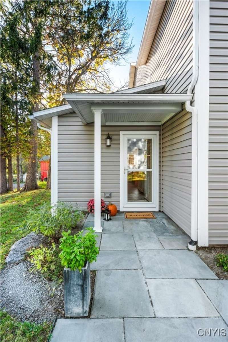 This beautiful Skaneateles Village home sits in an unbeatable location where you can walk to all of Skaneateles' shops, restaurants, and the lake, with the grocery store and local pharmacies just around the corner. Situated in the award-winning Skaneateles School District within walking distance of the school campus, this residence showcases high ceilings that fill the spaces with natural light, three generously sized bedrooms, a recently renovated full bathroom, and abundant closet space throughout. The large combined kitchen and dining room overlooks a stunning backyard complete with raspberry bushes and a bluestone paver patio, while the barn out back provides one-car garage parking, storage, and a versatile bonus space currently used as a gym that would make an ideal home office. With brick construction beneath the vinyl siding for exceptional insulation, a newer furnace that keeps utility costs remarkably low, a convenient first-floor laundry and half bath, and a private backyard retreat enhanced by dramatic stone terracing, this home perfectly balances village convenience with comfortable, efficient living.