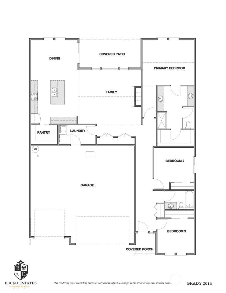 Welcome to Bucko Estates a new legacy community! This home is the Grady plan with 3 bed/1.75 bath & a 3 car garage all on one level! The great room w/gas fireplace has LVP flooring and is open to the kitchen & dining room. The kitchen has 36" upper Alabaster cabinets with an Ember on Maple colored island, a gas range, and a walk in pantry There are double closets for extra storage off of the great room. The home has quartz countertops throughout the home! The carpet and lights are all upgraded. Laundry room. The primary bedroom has a vaulted ceiling. The ensuite bath has a tile floor & tile shower, double sinks, & a walk in closet. There is a covered patio out back. The yard is fully landscaped & the backyard is fenced.