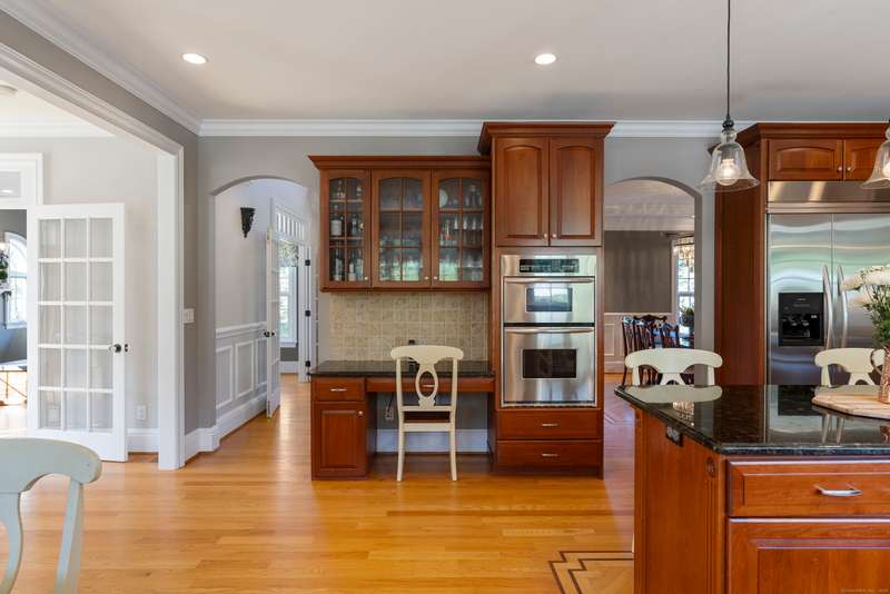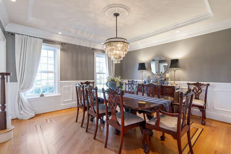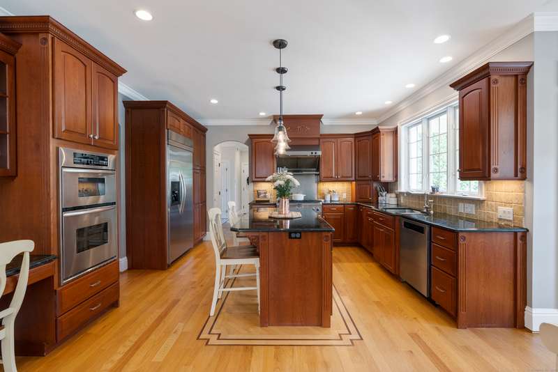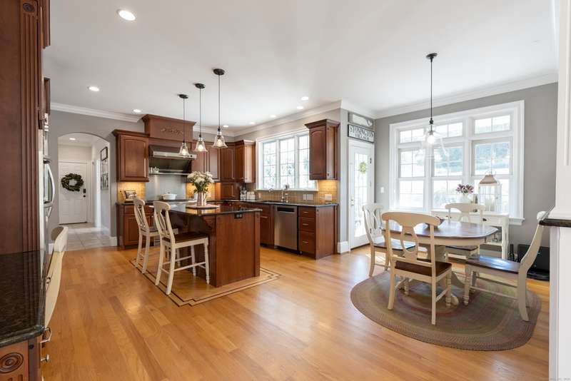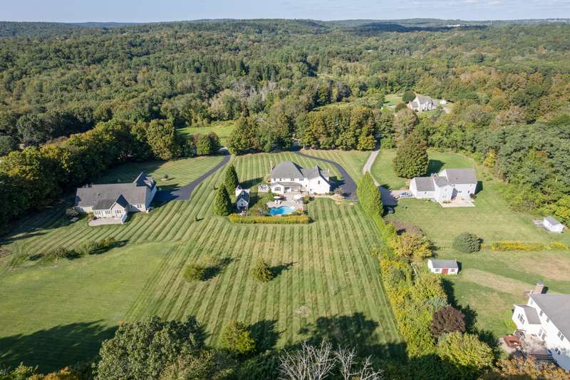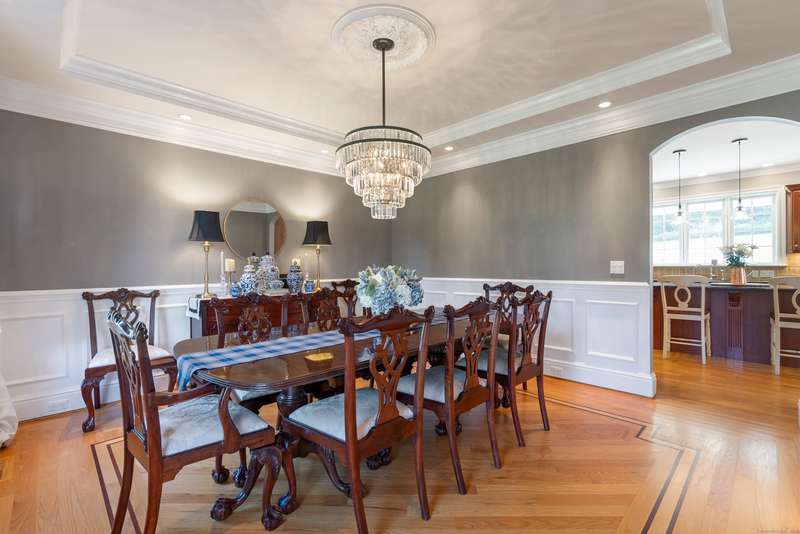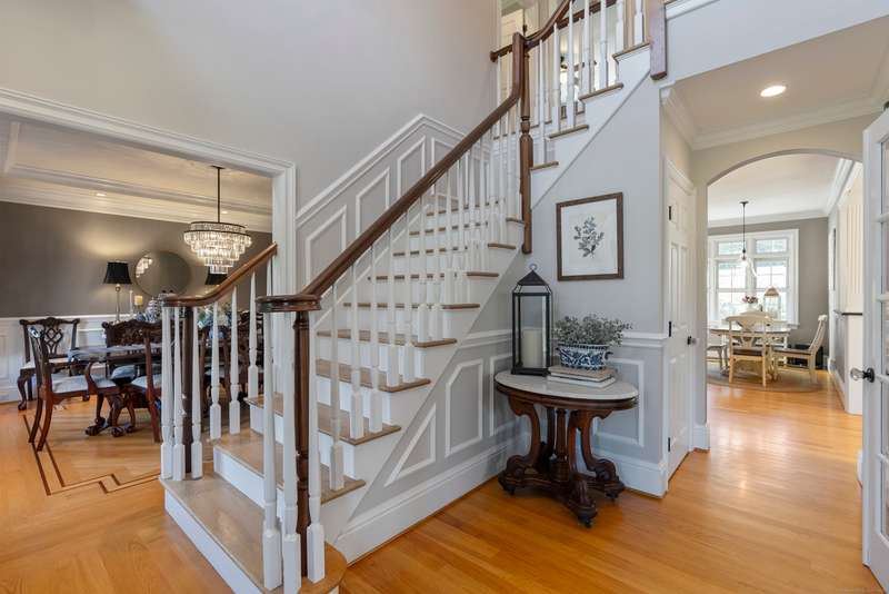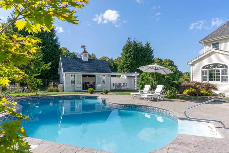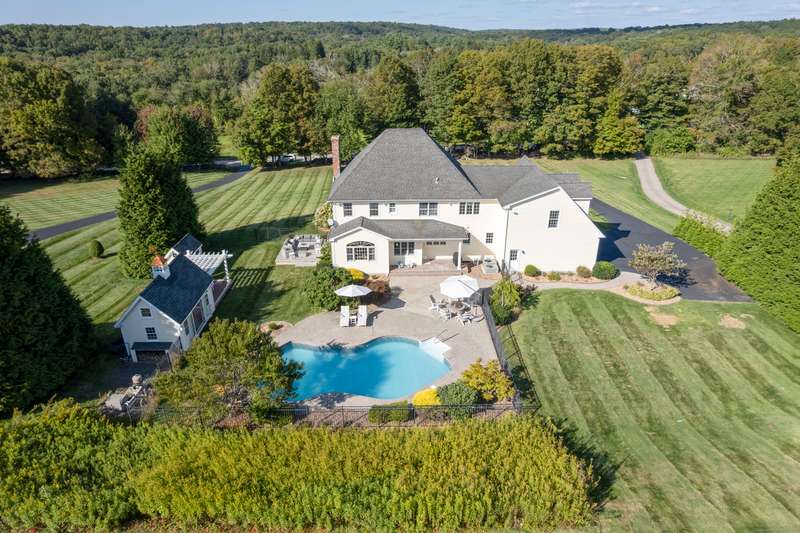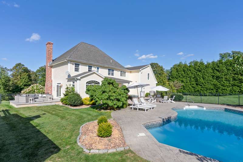 Prominently set on 2.6 acres of manicured grounds, this highly appointed Colonial exudes elegance, while offering a layout designed for everyday living. From the moment you arrive, the setting impresses-lush greenery, striking curb appeal, and an outdoor oasis designed for both relaxation and entertaining. The resort-style outdoor living is nothing short of spectacular..in-ground pool framed by two expansive patios, beautifully crafted cabana with detailed trim, and pergola-topped deck make every day feel like you are vacationing at a luxury resort. Custom designed with no details spared; the home is a showcase of unparalleled craftsmanship featuring multi-tiered crown moldings, shadow-boxing, tray ceilings, transom windows, and gleaming hardwood floors throughout. At the heart of the home, is the chef's kitchen featuring custom cabinetry, intricate millwork, professional-grade appliances, large center island, pantry. The floorplan was designed to naturally and seamlessly blend togethe