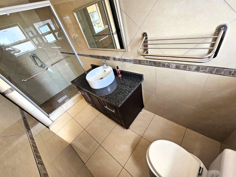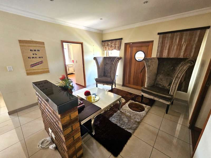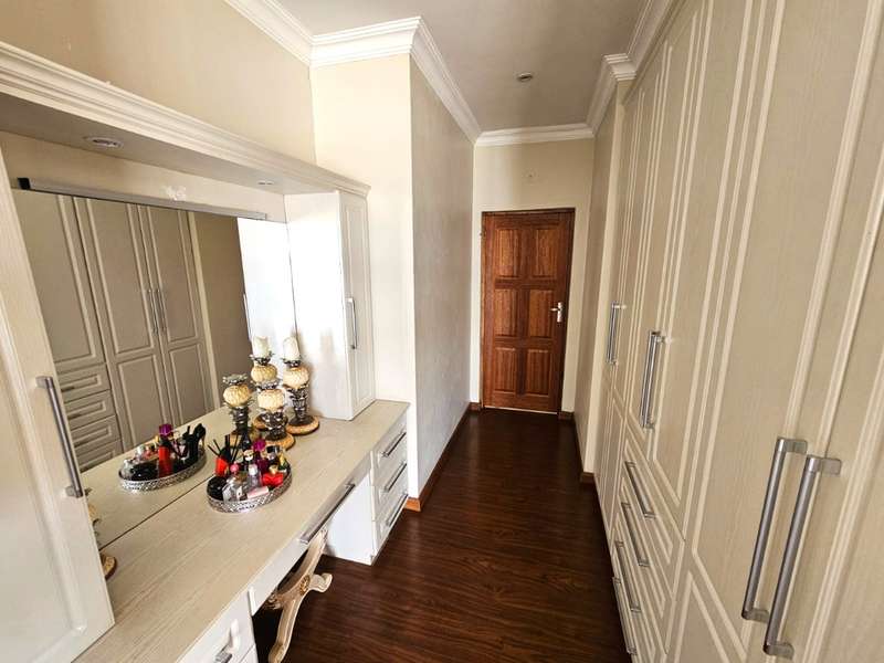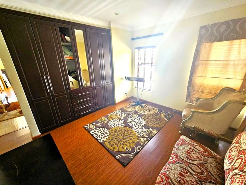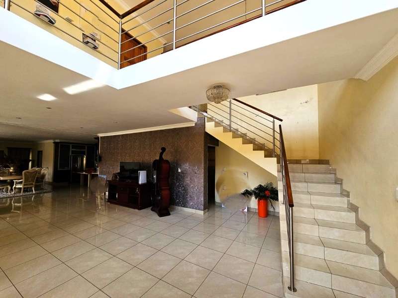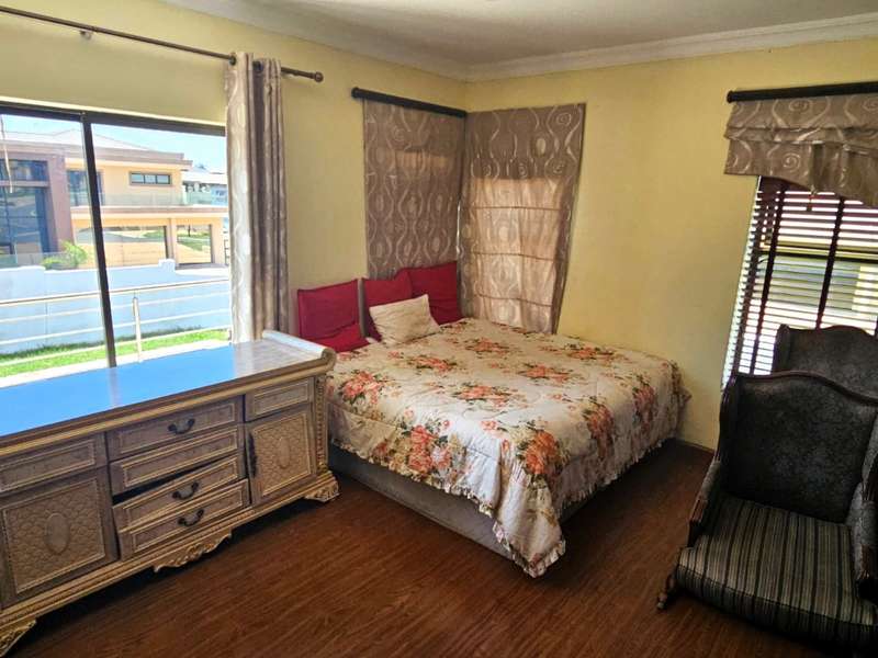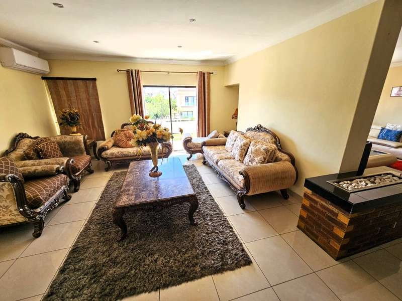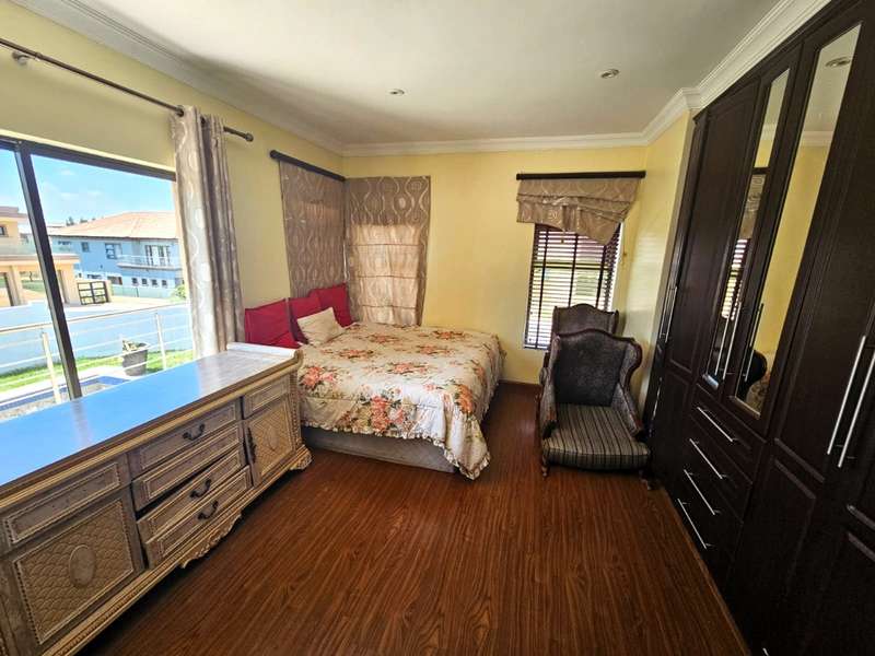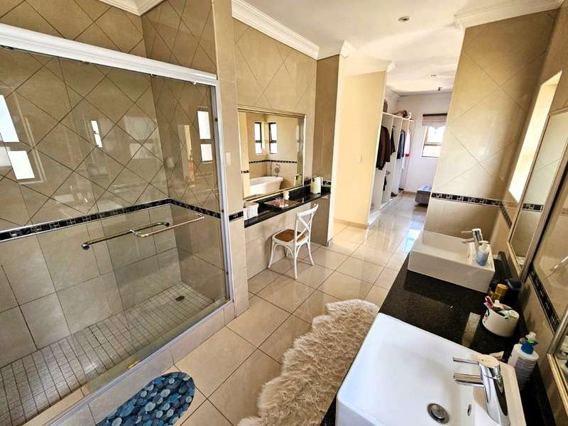 Imagine coming home to this gorgeous five-bedroom, five-bathroom house in Blue Valley Golf Estates. Set on a spacious corner lot, this property features two entrances that lead to a spacious open plan area that houses the kitchen, dining room, family room, and formal living room that features an attractive contrasting brick fireplace. This ergonomic kitchen includes a sink, a garbage disposal unit, and a pop-out power socket, just across from the gas stove, as well as space for a side by side fridge and an abundance of cabinets all around. On the right side, there is a scullery with plenty of cupboard space and enough room for three undercounter appliances. There is a toilet, basin, and shower in the staff accommodation. Two bedrooms are located on the ground floor and three bedrooms are located on the first floor. Each of the spacious bedrooms has an en-suite bathroom and ample storage space. The fourth bedroom has a toilet and a separate sink as well as a shower. A walk-in closet, a freestanding bath, his and hers sinks, a big shower and a separate toilet can all be found in the main bedroom. The room features plenty of cupboard space, two dressing tables (one at the entrance and one in the bathroom), and plenty of cupboard space. The main bedroom is very spacious and opens onto a balcony with beautiful views of the estate. The balcony extends to the 3rd bedroom and the passage leading to the staircase. A separate room, next to the main bedroom, was originally designed for a jacuzzi, but it became a sauna room instead. It is currently being used as a storage room, but could also operate as a small office. The owner has submitted plans for the installation of a pool, braai area, and wall around the property and is awaiting approval. Easy access to Samarand Rd which joins the N1 highway, close to Blue valley mall, fuel stations, Jacaranda college & Pre-primary, Coccolino's early childhood center, Uitsig high school, Medi clinic, and many more