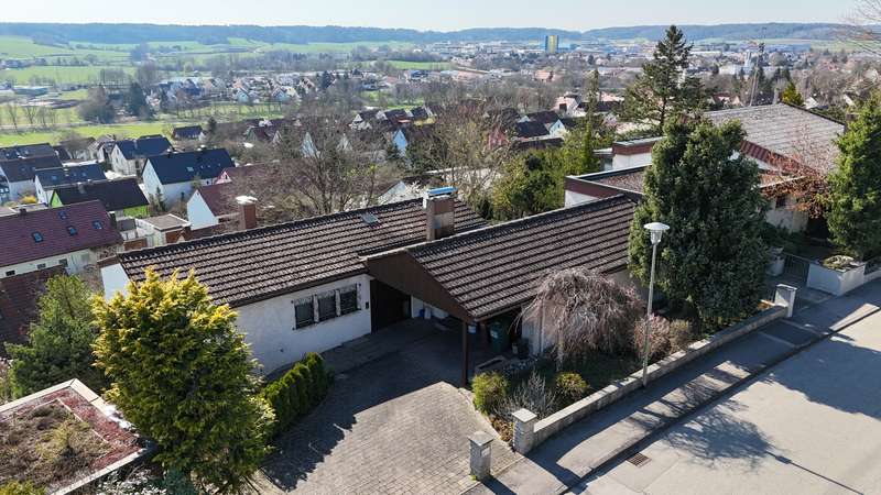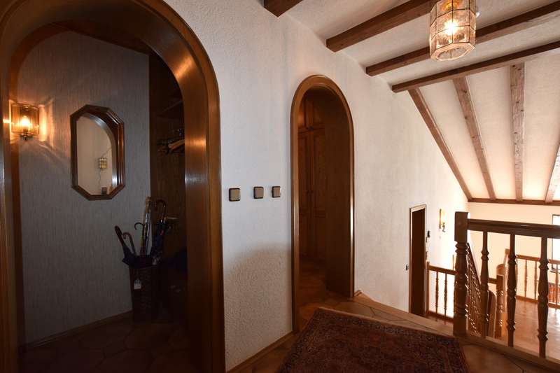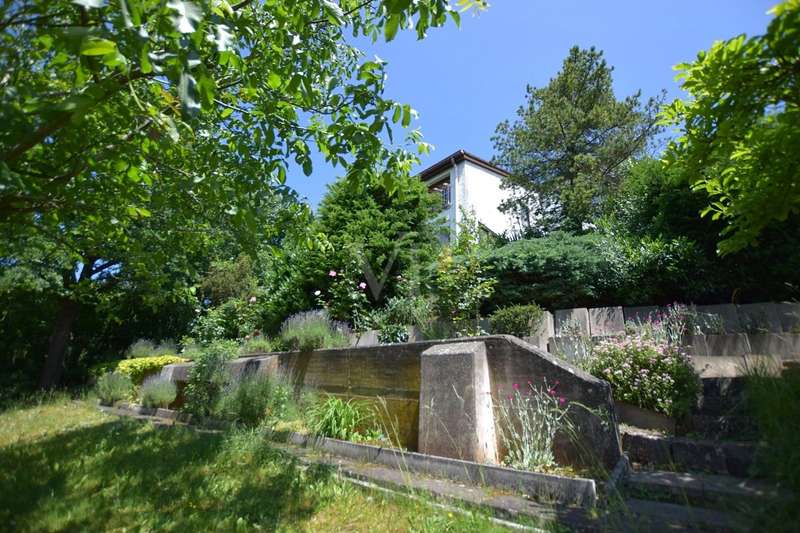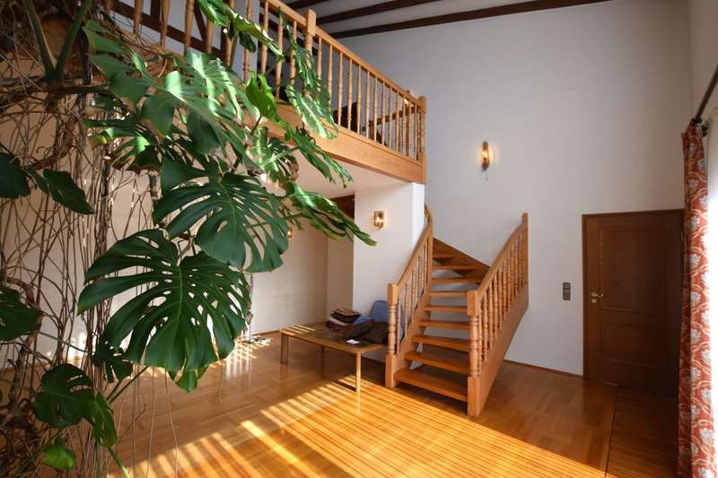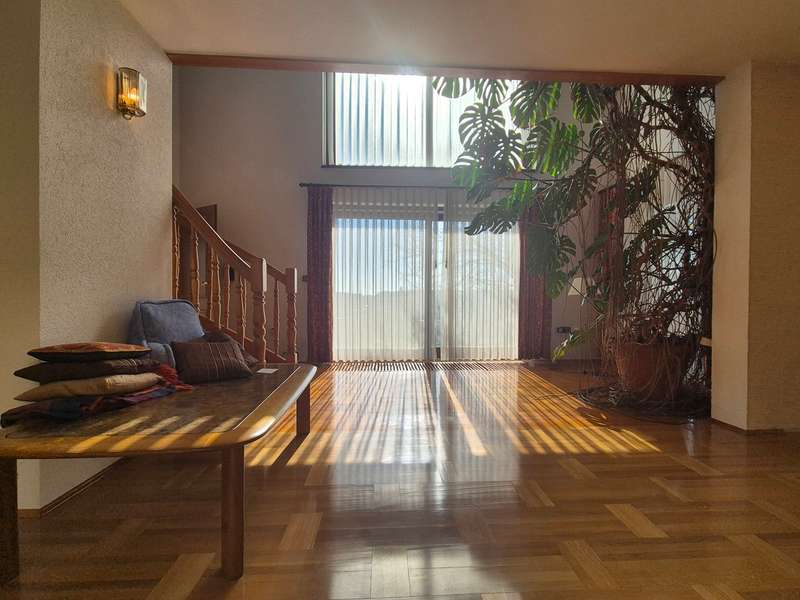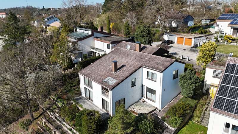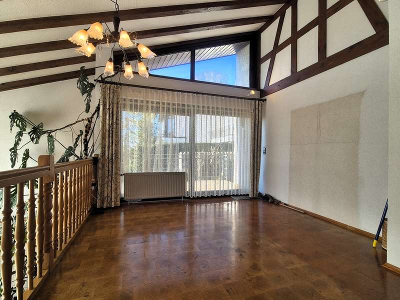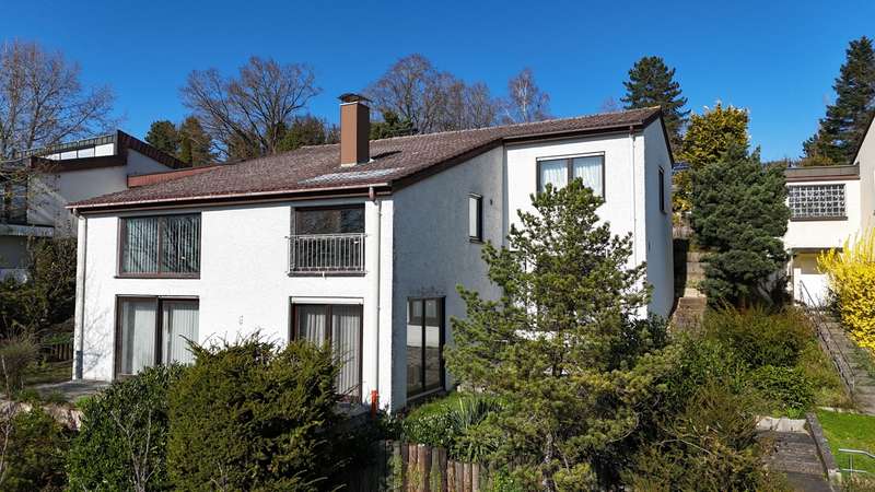 For sale is a well-kept architect's house, built in solid construction and completed in 1984 for first occupancy. The property is in a sought-after location in Feuchtwangen and offers a living space of approx. 180 m² on a generous plot of approx. 831 m². The house boasts an ingenious room layout and numerous special features that will make life in your new home particularly pleasant. The property has a total of 7 rooms that can be used flexibly. The light-flooded living concept is emphasized, among other things, by large window fronts that offer a panoramic view over the city and access to the balcony and the three terraces. A tiled stove also ensures cozy evenings, spreading warmth and a comfortable ambience on the first floor. Another special highlight is the fireplace room, which adjoins the open-plan living area and enhances living comfort. The fitted kitchen is directly connected to a small conservatory, which offers additional space for socializing or relaxing. The kitchen solution is practically designed and leads to more efficient use of the house in everyday life. A daylight bathroom and a separate guest WC provide the necessary functionality and comfort. The room layout also includes a balcony that offers an uninterrupted view into the distance. A swimming pool is located in the shell of the building and leaves room for individual design and development. In addition to the generous living space, there is approx. 140 m² of usable space available, which offers further possibilities for individual usage concepts. An oversized double garage is also located on the property and offers sufficient space for vehicles and two-wheelers as well as additional storage space in the attic. The covered entrance protects you from the weather and you can enter the house with your shopping in the dry. The architecture of the house is exceptional and blends seamlessly into the familiar urban landscape. The location of the property combines central proximity with a feeling of privacy and tranquillity. With its many terraces, the house offers plenty of opportunities to enjoy the outdoor areas of the beautifully landscaped garden to the full. The existing trees provide pleasant shade in hot summers. Potential buyers can expect a property that offers a harmonious combination of comfort, functionality and charming surroundings. Experience the numerous advantages of this detached house during a personal viewing, be it the generous room layout or the well thought-out fittings. Please contact us for more information or to arrange a viewing. We look forward to presenting this special property to you in more detail and answering any questions you may have.