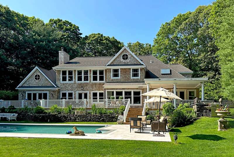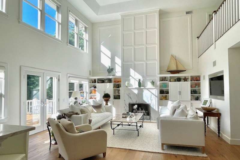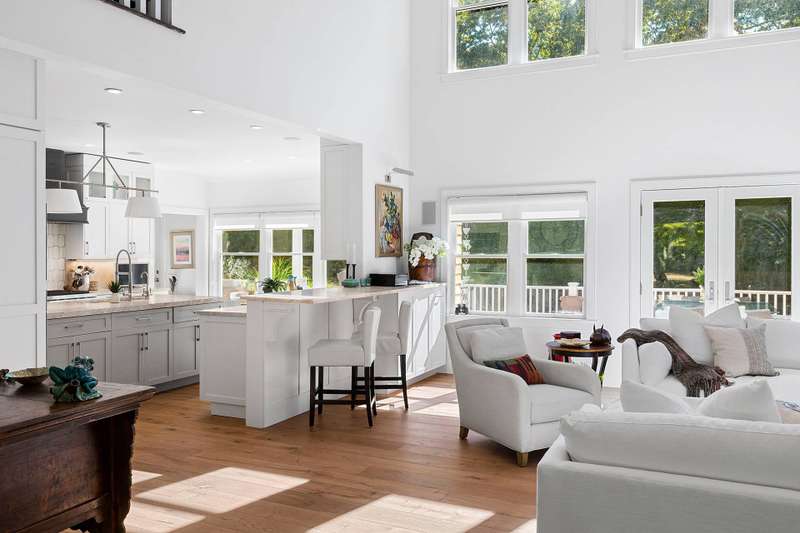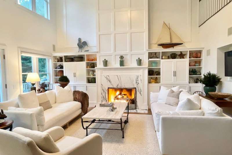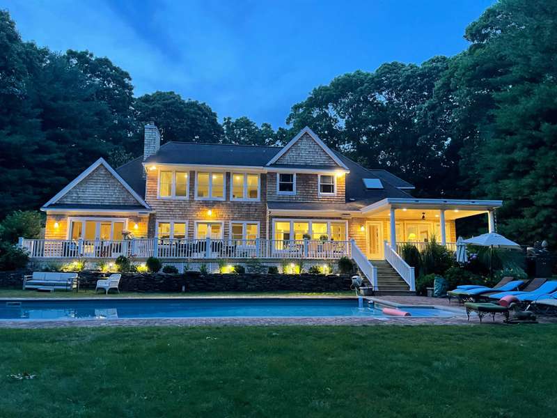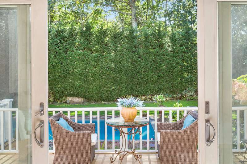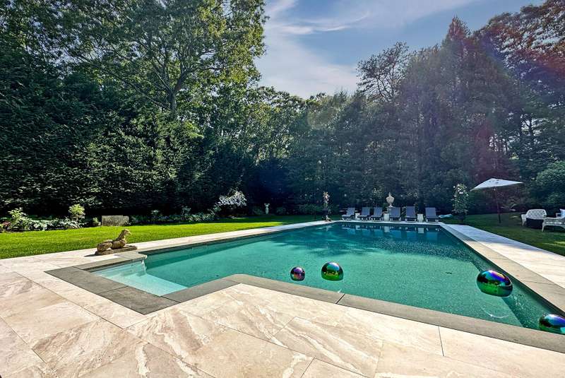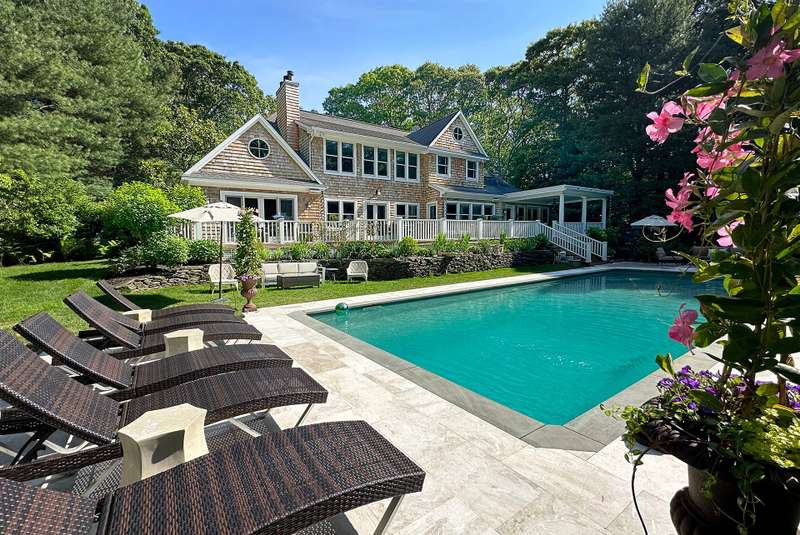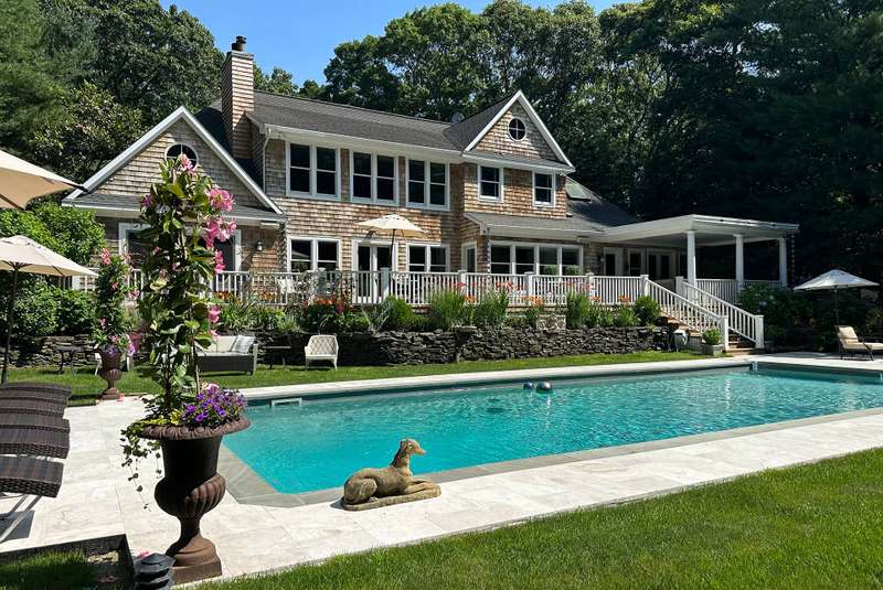 RR#:22-1534 Beautifully appointed, this 4500 sq/ft traditional contemporary situated down a meandering driveway, offers soaring double height ceilings with an open concept interior and cascading southern natural light. This two-story gem is located just minutes from East Hampton Village with world class beaches, designer shops and boating marinas. A welcoming foyer opens into a designer finished living room with a stately full height fireplace hearth and numerous oversized windows and glass doors. All flow into a brand new 'state of the art' chef's eat-in kitchen featuring a Wolf stove, microwave and oven, a Miele column refrigerator, and a Thermador column freezer completed with Quartzite countertops. In addition, on the first level there is a formal dining room and an inviting family and media room that opens out to spacious decking with a large, covered porch for indoor-outdoor living at its very best. Wide plank white oak floors enhance this newly designed modern decor. You will also enjoy a luxurious, newly renovated primary bedroom suite with marble bath and soaking tub. The bedroom is complimented with a linear glass jewel fireplace, all located on the first floor. The primary wing overlooks park-like towering mature trees with flowering gardens and a heated pool with built-in grill and entertainment areas. The second floor offers a 2-bedroom private wing with bath and an additional 2 bedrooms with a shared bath. This thoughtfully landscaped property in an upscale neighborhood also offers a basketball court and all-weather community tennis courts for the family enjoyment. Minutes from local farm stands, biking and hiking trails and LongHouse Reserve, a sculpture museum with indoor and outdoor living art featuring numerous events and tours. The iconic, world class 'Main Beach' is just a 5-minute ride away with boardwalk dining and evening beach concerts all season. This is your summer oasis with every amenity and luxury desired to enjoy a Hampton's summer vacation. Listing ID: 895685