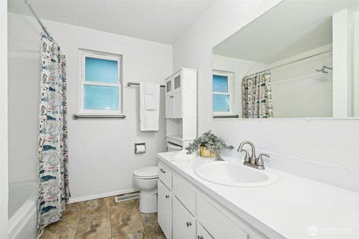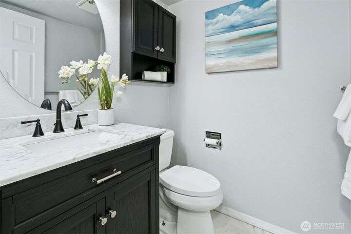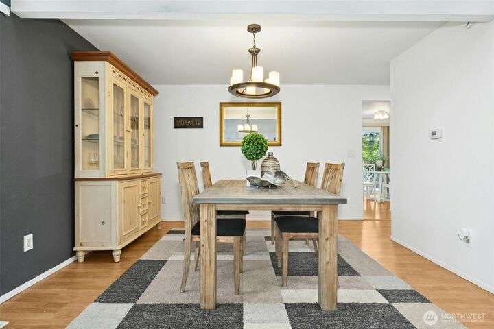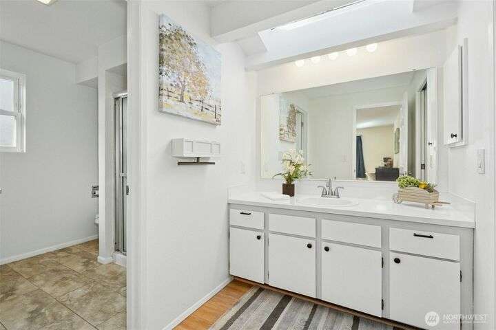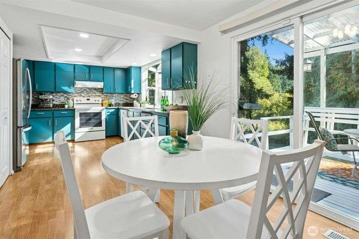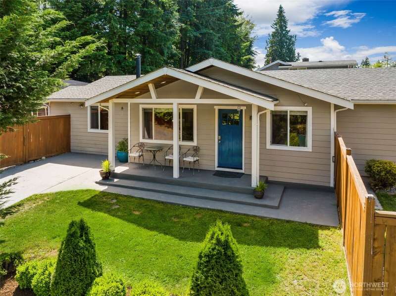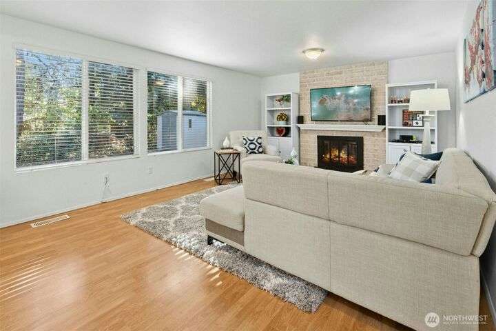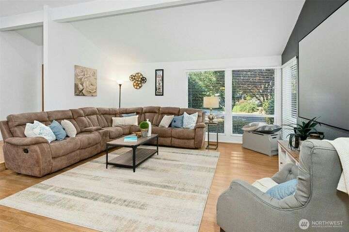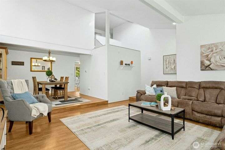 Welcome to a quiet cul-de-sac retreat that feels fresh, modern, and move-in ready! An open floorplan with vaulted ceilings and skylights brightens the living area, while a wood-burning fireplace adds warmth. A versatile wall fits a large-screen TV or home-theater setup. Fresh interior paint (2025) sets a crisp tone. The spacious kitchen features new 2023 appliances and updated 2025 lighting. Upstairs, a wide hallway improves flow & adds a sense of openness. Systems cared for: tankless water heater & furnace replaced in 2019. Out back, a fully fenced yard & large covered deck feel private amid surrounding greenery—ideal for year-round enjoyment. Close to parks, trails and shops, with quick I-405 access; pre-inspected for peace of mind.