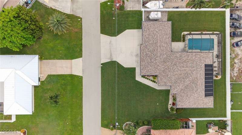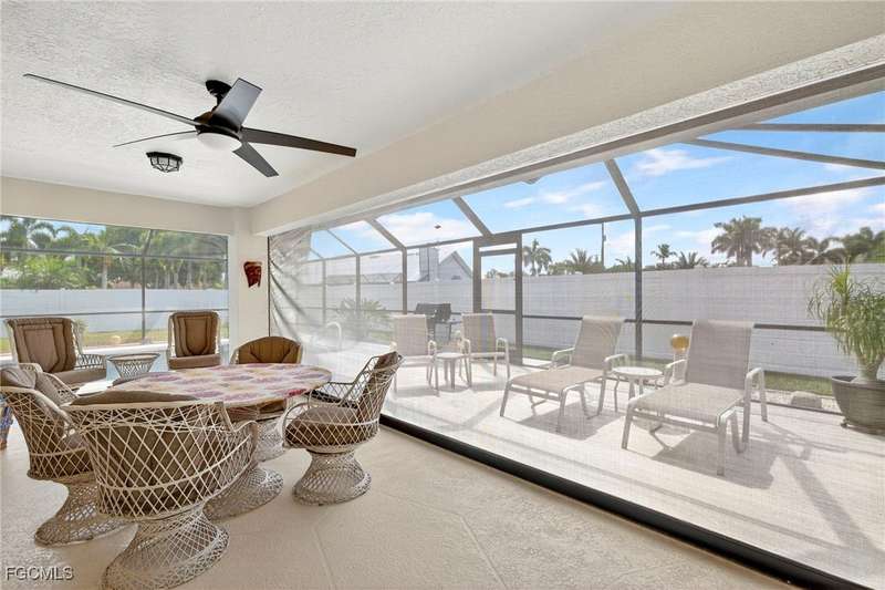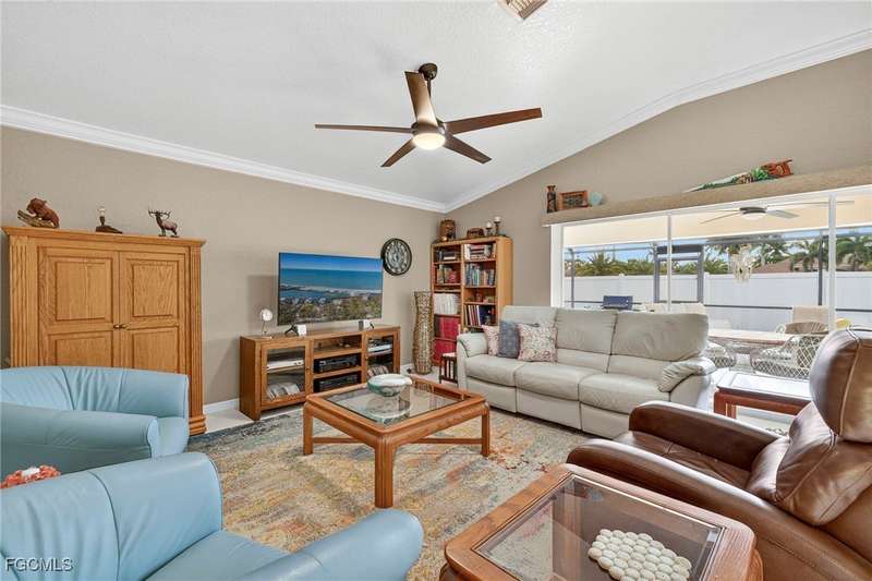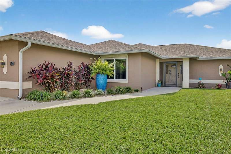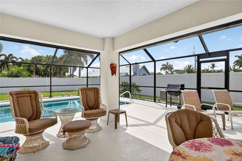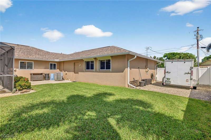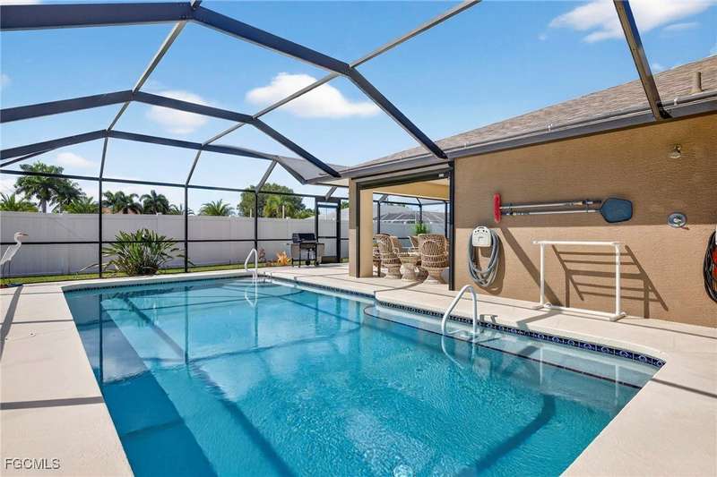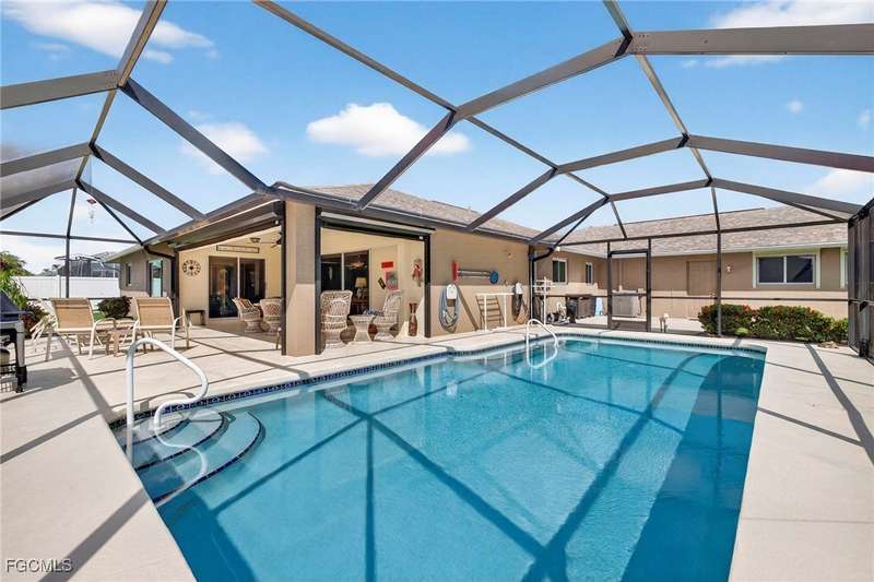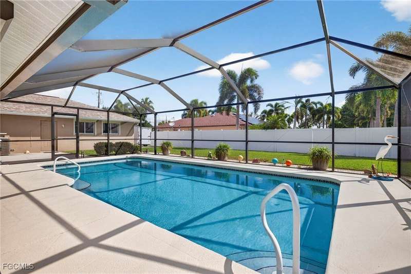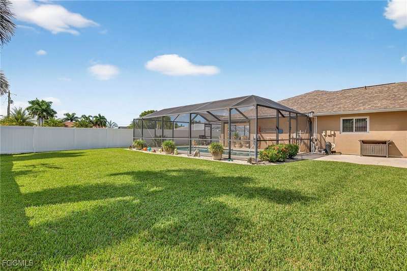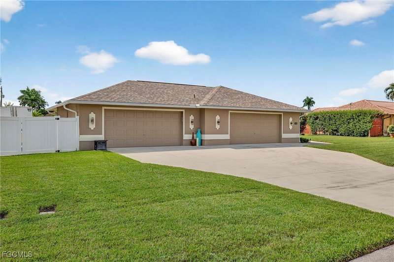 SE Cape Coral FOUR Car Pool Home with Spacious Amenities: Nestled in the heart of SE Cape Coral, this beautifully maintained home has been lovingly cared for by diligent homeowners. As you step inside from the Covered Screened Porch and into the Foyer, you are immediately welcomed by the warm and inviting Great Room. Perfect for entertaining, gathering with friends and family, or simply relaxing, the Great Room offers year-round enjoyment and overlooks the southern-facing lanai and pool area. This spacious split-bedroom floor plan boasts a large kitchen with abundant countertops & cabinets, and a convenient corner pantry. Oversized picture windows and sliding glass doors illuminate the home with natural light, creating an inviting atmosphere throughout. The Primary Suite is tucked away behind the kitchen at the far right side of the home, while the two additional bedrooms are positioned at the front and left side, providing balance between shared gathering spaces and quiet personal retreats. Step outside to discover a generous outdoor living area complete with a crystal-clear sparkling pool and meticulously landscaped yard, adding a greater sense of tranquility to your outdoor oasis. Car enthusiasts will appreciate the expansive four-car garage, offering plenty of space to store mobile toys or set up a workshop. This HUGE Triple Lot includes a privacy fence with a double gate on the left side leading to a gravel parking space, ideal for trailer storage. Roof Shingles & Lanai Pool Cage replaced in 2020, AC changed out in 2017, Pool is Solar Heated and the Home is pre-wired for Generator. Additional features include Storm-Rated Windows, Electronic Shutters, and Impact-Resistant Garage Doors for added peace of mind. To top that off, the property is situated in an X-500 Flood Zone ~ NO Flood Insurance required Here! Centrally located in South Cape, you'll enjoy convenient access to Veterans Parkway between Country Club and Santa Barbara. This home seamlessly combines comfort, style, and functionality in a prime location. Don't miss the opportunity to make it yours!