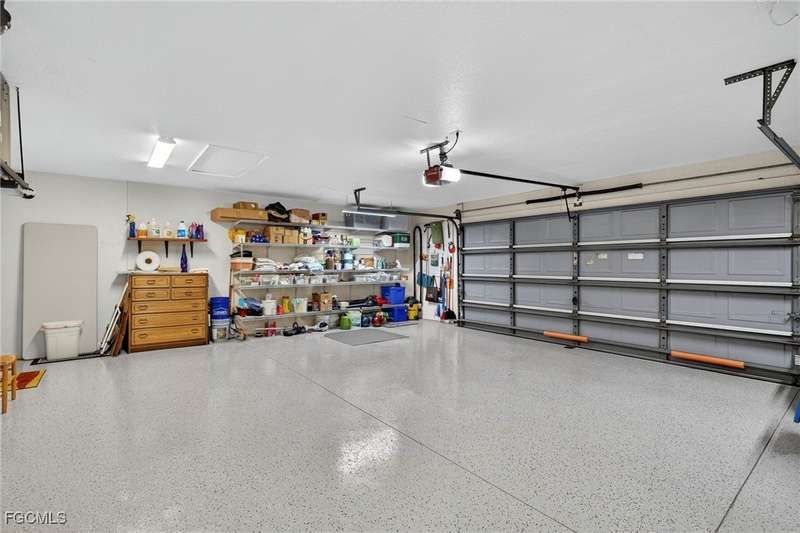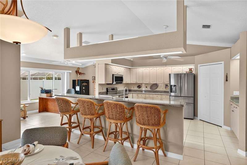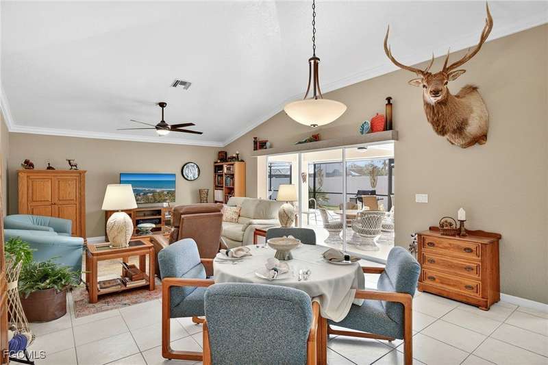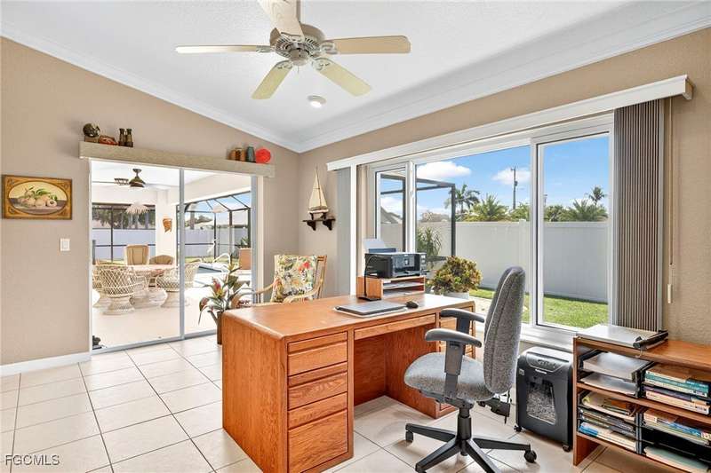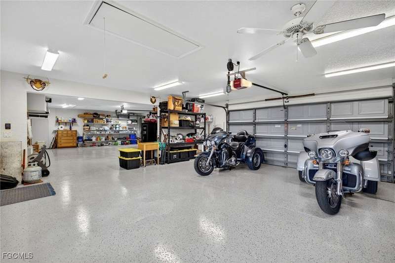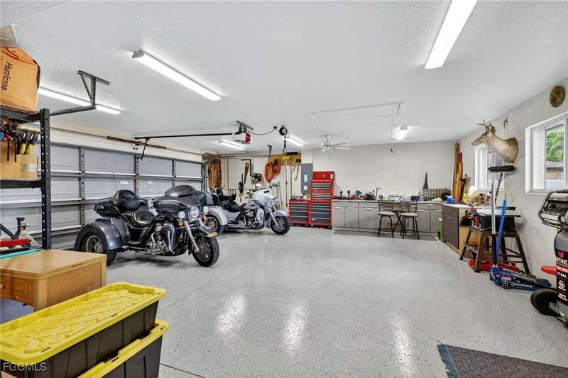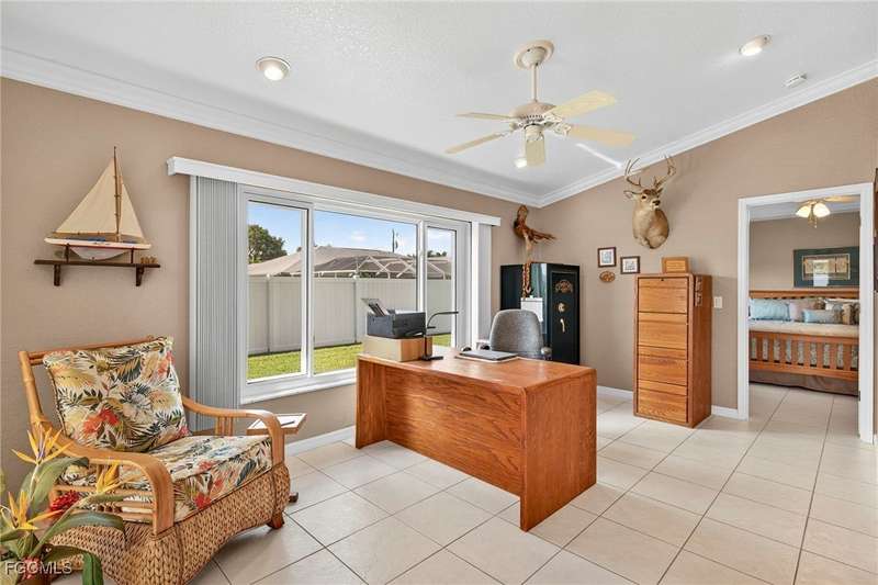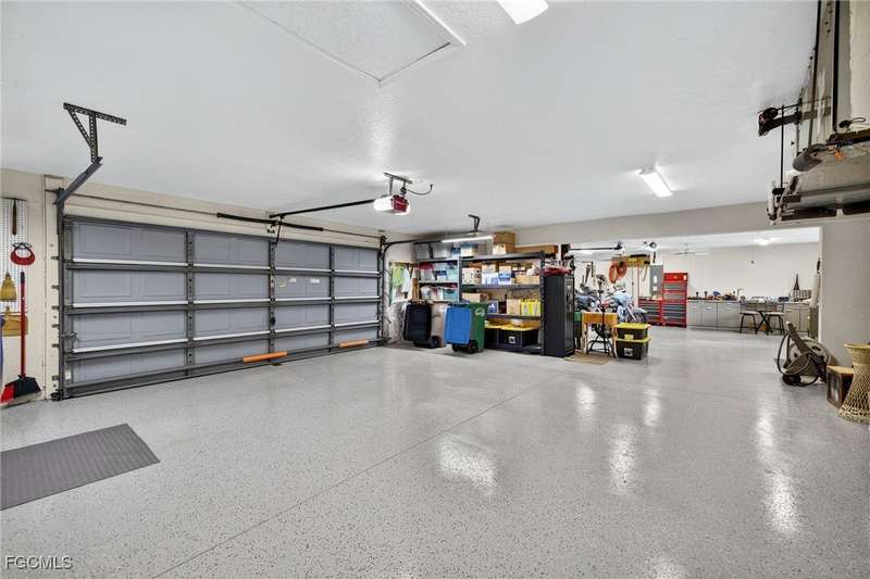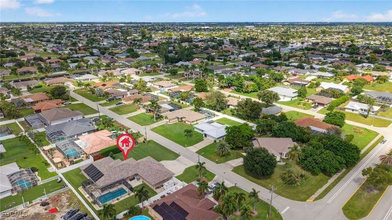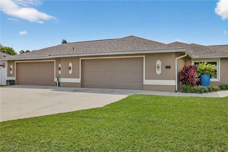 SE Cape Coral FOUR Car Pool Home with Spacious Amenities: Nestled in the heart of SE Cape Coral, this beautifully maintained home has been lovingly cared for by diligent homeowners. As you step inside from the Covered Screened Porch and into the Foyer, you are immediately welcomed by the warm and inviting Great Room. Perfect for entertaining, gathering with friends and family, or simply relaxing, the Great Room offers year-round enjoyment and overlooks the southern-facing lanai and pool area. This spacious split-bedroom floor plan boasts a large kitchen with abundant countertops & cabinets, and a convenient corner pantry. Oversized picture windows and sliding glass doors illuminate the home with natural light, creating an inviting atmosphere throughout. The Primary Suite is tucked away behind the kitchen at the far right side of the home, while the two additional bedrooms are positioned at the front and left side, providing balance between shared gathering spaces and quiet personal retreats. Step outside to discover a generous outdoor living area complete with a crystal-clear sparkling pool and meticulously landscaped yard, adding a greater sense of tranquility to your outdoor oasis. Car enthusiasts will appreciate the expansive four-car garage, offering plenty of space to store mobile toys or set up a workshop. This HUGE Triple Lot includes a privacy fence with a double gate on the left side leading to a gravel parking space, ideal for trailer storage. Roof Shingles & Lanai Pool Cage replaced in 2020, AC changed out in 2017, Pool is Solar Heated and the Home is pre-wired for Generator. Additional features include Storm-Rated Windows, Electronic Shutters, and Impact-Resistant Garage Doors for added peace of mind. To top that off, the property is situated in an X-500 Flood Zone ~ NO Flood Insurance required Here! Centrally located in South Cape, you'll enjoy convenient access to Veterans Parkway between Country Club and Santa Barbara. This home seamlessly combines comfort, style, and functionality in a prime location. Don't miss the opportunity to make it yours!
