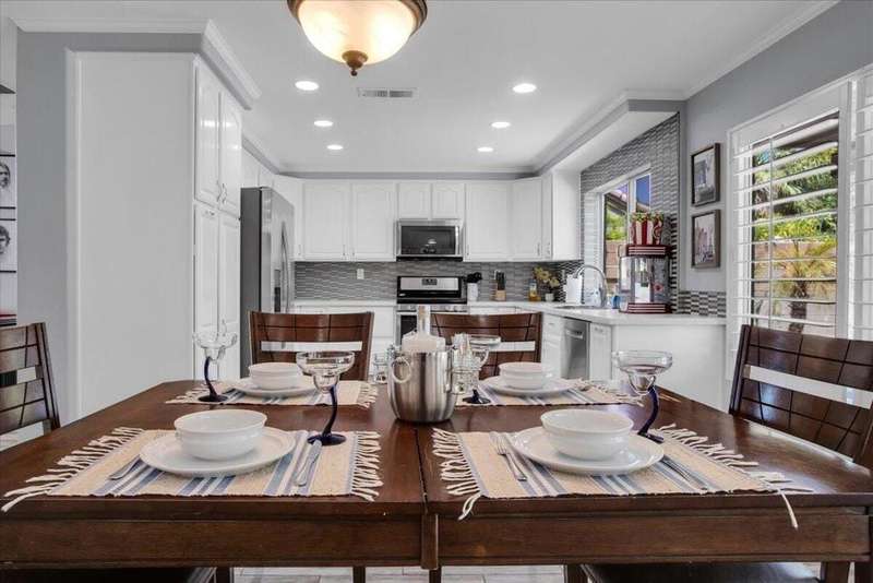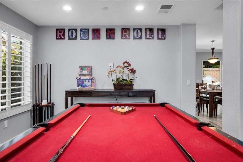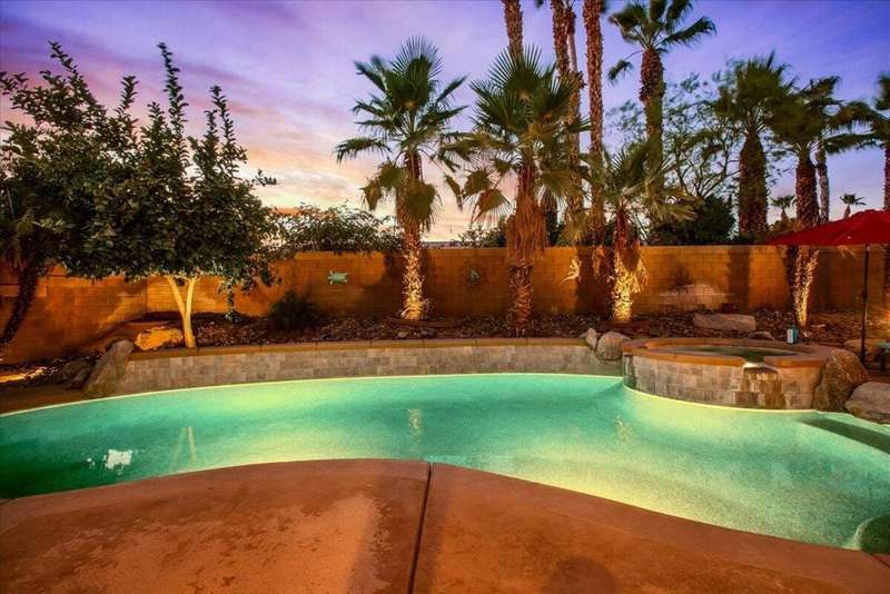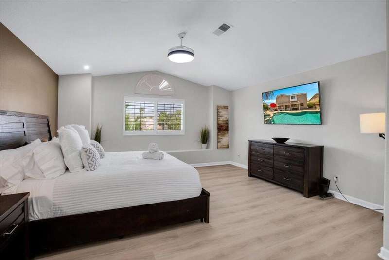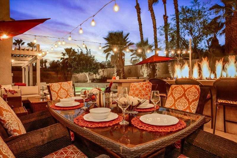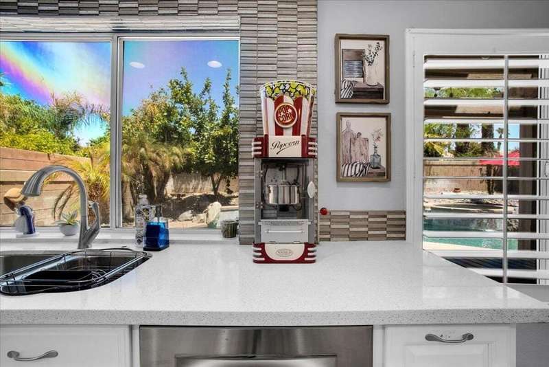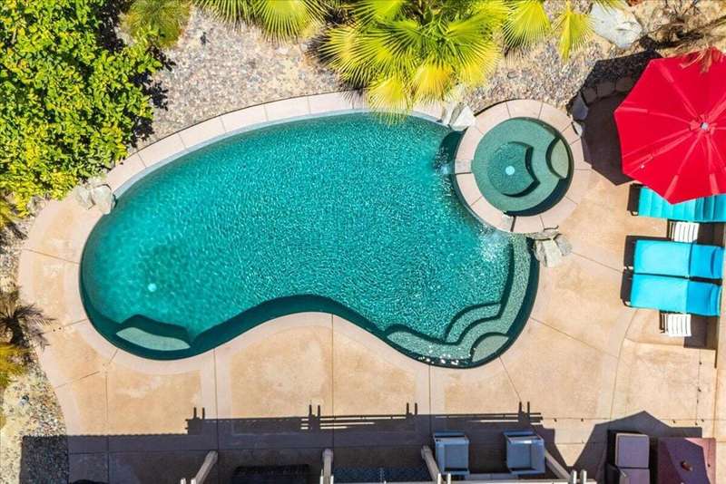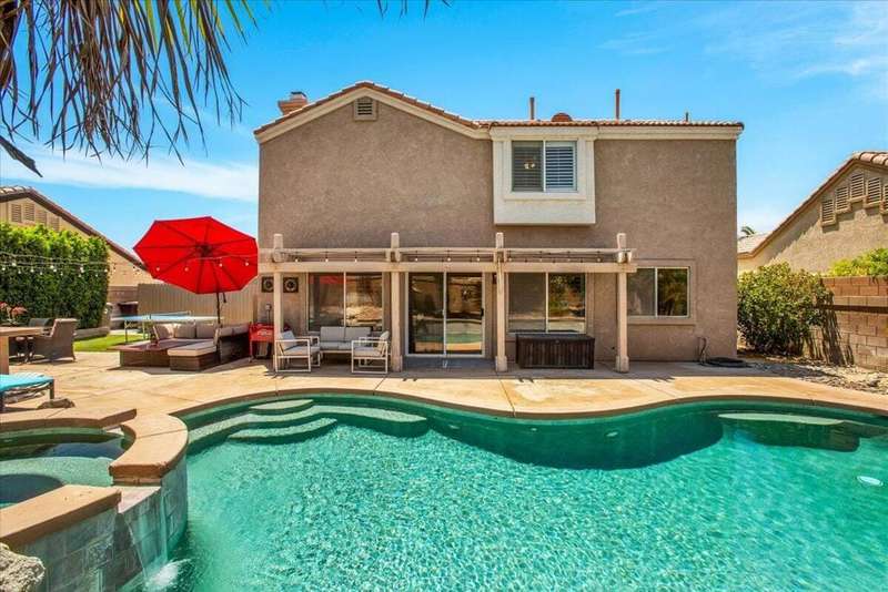 Vacation Rental. Minimum 30 days booking required. Escape to your perfect seasonal retreat in the tranquil Topaz neighborhood of La Quinta. This fully furnished 4-bedroom, 3-bathroom home, including one bed/bath downstairs, is located in a quiet cul-de-sac. Relax by the luxurious saline-pebble tech pool and spa in the expansive backyard, complete with a lush lawn, ping-pong, outdoor games, a built-in BBQ, fire pit, and multiple seating areas.Inside, enjoy the updated kitchen with modern appliances and elegant plantation shutters. Utilities are included, with a cap on pool and gas usage.Monthly Rates: Jan-March: $9500/month, Inquire for April/Coachella. May-Dec: $7500/month. Special Rate: June-Sept 2025 $5000/month. Inquire about annual/unfurnished rates.Additional fees: $495 cleaning, $188 property fee, and a $100 monthly gas cap for pool use (spa complimentary). $8500 refundable security deposit. Booked March 2026. All other dates open.