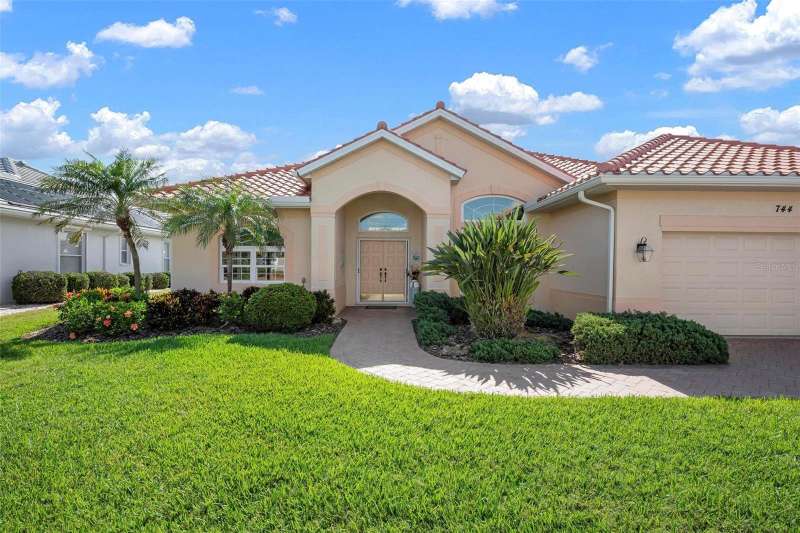 Welcome to 744 Fringed Orchid Trail, a meticulously maintained 3-bedroom, 2-bathroom home nestled in the serene Lakes of Jacaranda community in Venice, Florida. This residence offers a harmonious blend of comfort and elegance, featuring high ceilings that enhance the spaciousness of the living areas. The open floor plan seamlessly connects the living room, dining area, and kitchen, creating an ideal space for both entertaining and everyday living. The master suite serves as a private retreat, complete with a generously sized bedroom, walk-in closet, and an en-suite bathroom featuring dual vanities, a soaking tub, private toilet and a separate shower. Two additional bedrooms and private bath provide ample space for family or guests, and versatile den can serve as a home office or study. Step outside to the screened-in lanai, where you can enjoy Florida's beautiful weather year-round. The outdoor space overlooks a lake and a beautifully landscaped yard, offering a tranquil setting for relaxation or gathering. Residents of the Lakes of Jacaranda community enjoy access to a range of amenities, including a clubhouse, large swimming pool, tennis and pickleball courts, and scenic walking and biking paths that wind around the community's sparkling lakes. The neighborhood is conveniently located near world-renowned golf courses, pristine Gulf beaches, and the charming shops and restaurants of Historic Venice. House has a new: Roof, Epoxy Floor in Garage, Impact Resistant Windows all installed in 2023.