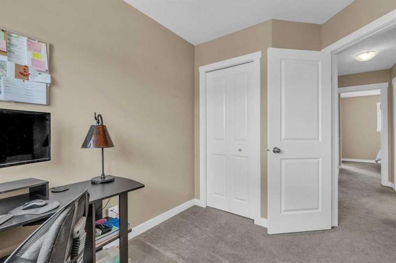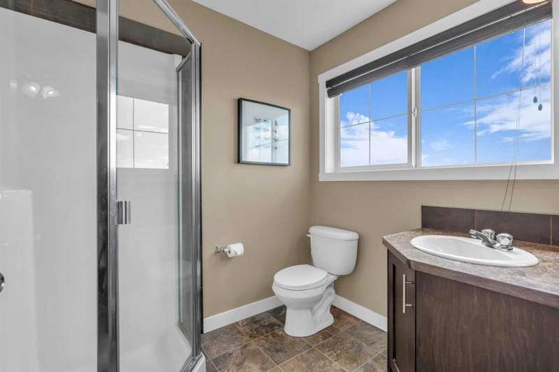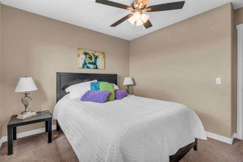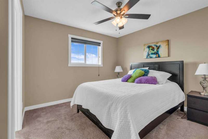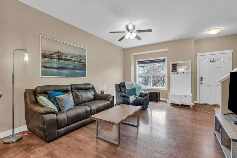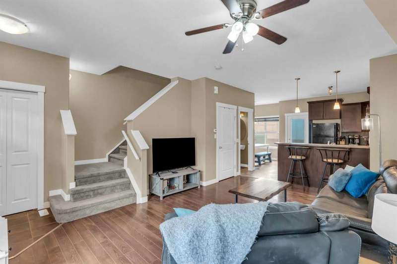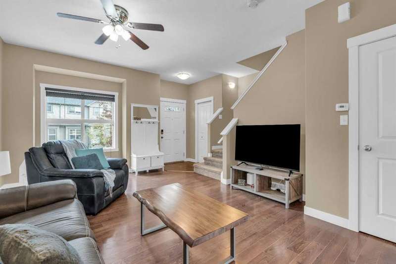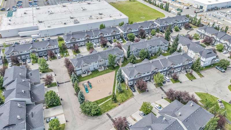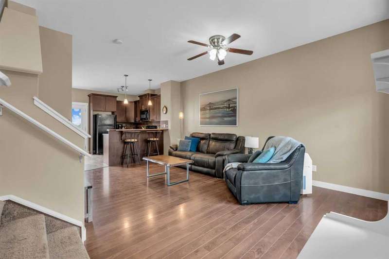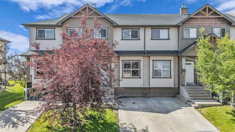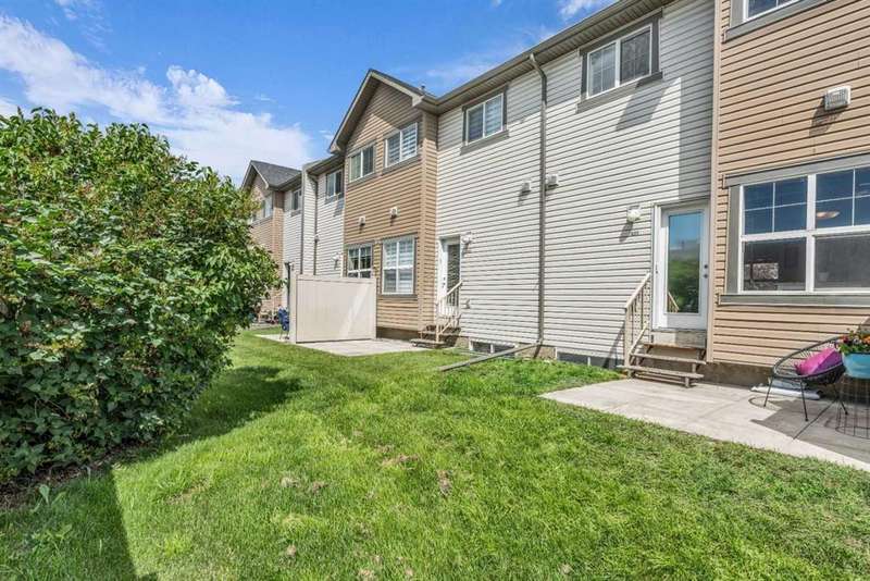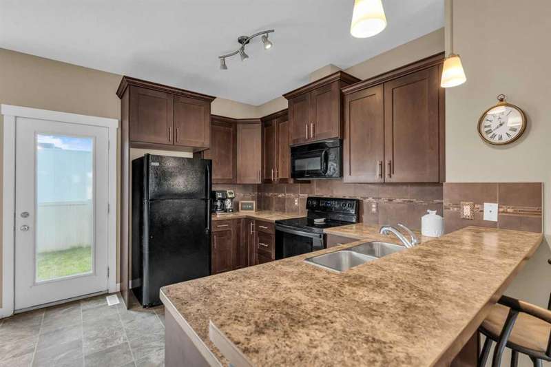 BEST VALUE IN THE COMPLEX FOR THREE BEDROOMS | Welcome home to the quiet end of the complex (limited vehicle traffic, and no pedestrians walking through your yard!) - a place that feels both inviting and full of possibility. From the moment you walk in, you’ll notice how open and welcoming the main floor feels. The expansive living room is more than just a space - it’s a place where life happens. Picture a glowing Christmas tree in the front window, a cozy movie night with loved ones, or filling the room with greenery to create your own indoor oasis. The kitchen is truly the heart of this home, with rich espresso cabinets, plenty of storage, and a perfect little breakfast bar for quick bites or heartfelt conversations over morning coffee. The newer Whirlpool range makes cooking a joy, while the warm backsplash and durable counters add both charm and function. Just off the kitchen, a sunny dining nook is the perfect spot for family meals or lingering with friends over dessert. Step outside to your private, south-facing patio and yard - a quiet retreat for summer BBQs, peaceful evenings under the stars, or afternoons with a good book. With no homes directly behind you, you’ll appreciate the calm, quiet, and sense of extra privacy.? Upstairs, three bedrooms provide room for everyone - or a little flexibility for a home office or creative space. The primary suite is a true retreat with its walk-in closet and a rare 3-piece ensuite filled with natural light. Two additional bedrooms, a full bath, and a linen closet complete this level, keeping everything you need close at hand. The unfinished basement is brimming with opportunity - whether you dream of a cozy family room, a teen’s private getaway, or just the perfect spot for storage, the choice is yours (and it’s already roughed in for a bathroom). Outside, the curb appeal is just as welcoming, with charming peaked rooflines, a covered front porch, and your own private, extended-length parking stall right at your front door. Guests will always find plenty of street parking nearby too. This pet-friendly, well-kept complex even offers a little play park, and the location couldn’t be better - schools, shopping, parks, and amenities are just minutes away. And when you want a bigger-city vibe, Calgary is only a 30-minute drive. Whether you’re a first-time buyer ready to settle in, an investor looking for the right property, or someone who’s downsizing without wanting to give up comfort, this home offers a little bit of everything. Warm, practical, and full of possibility - it’s more than just a townhouse, it’s the next chapter in your story.