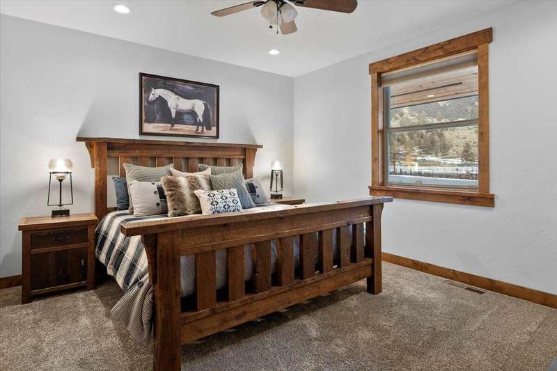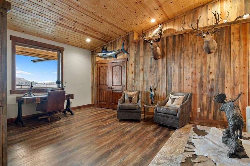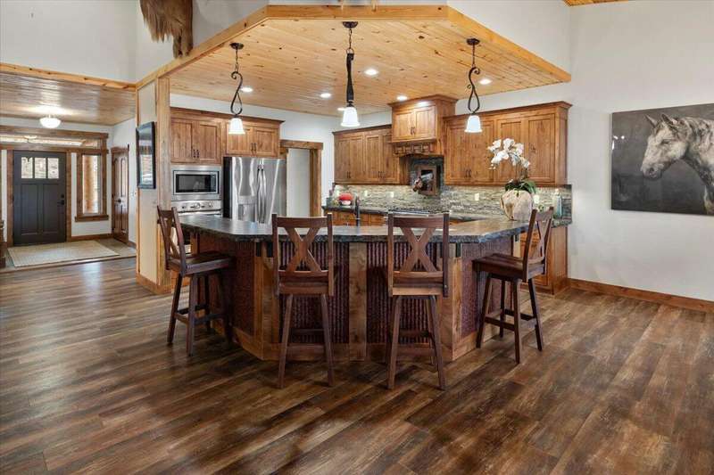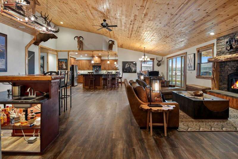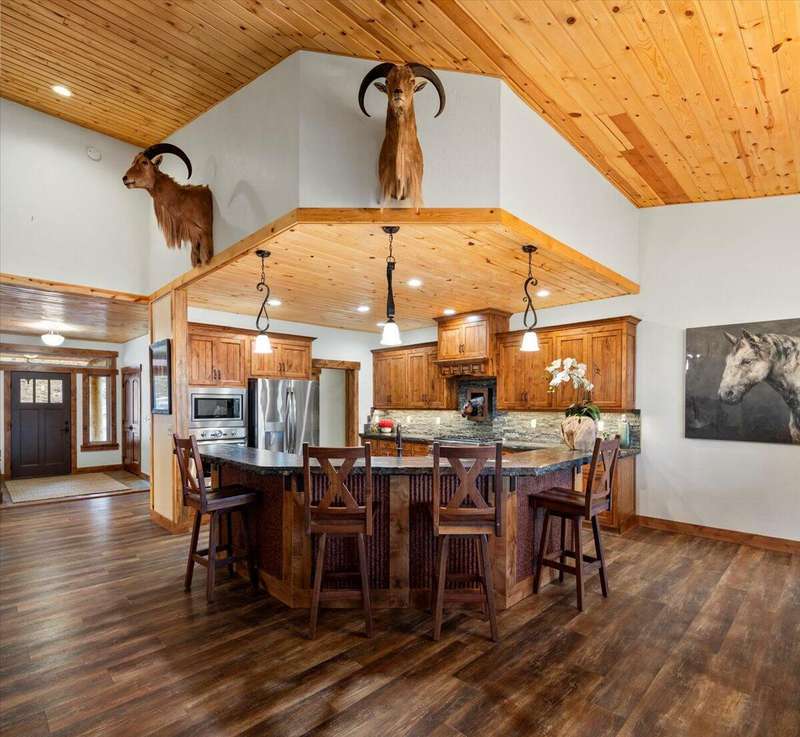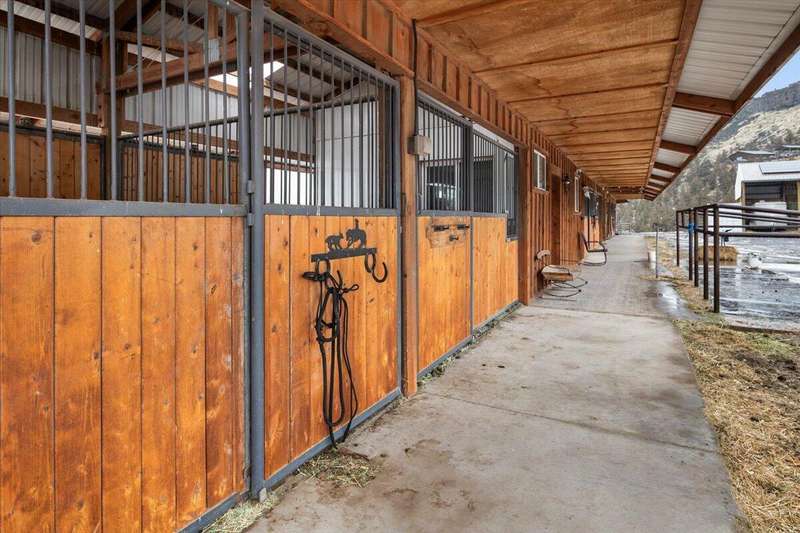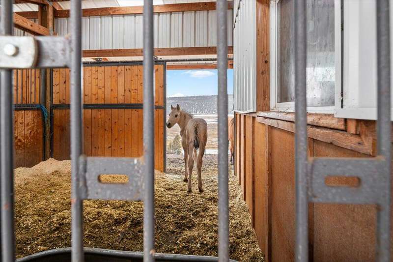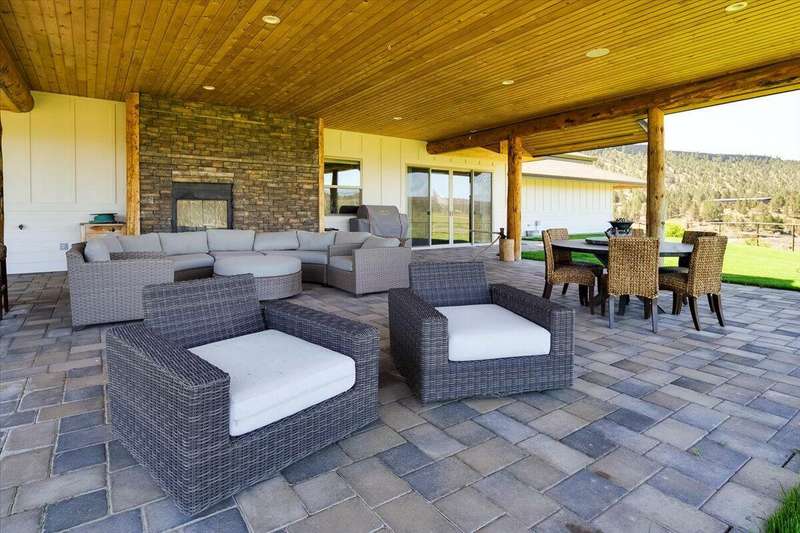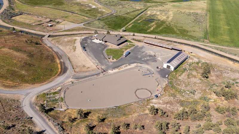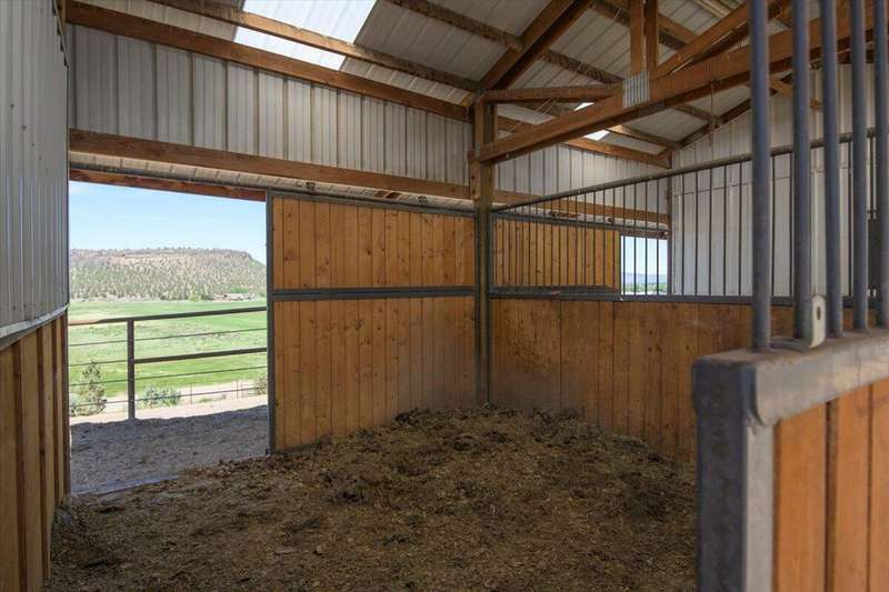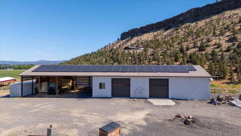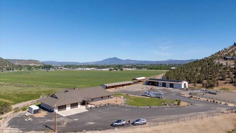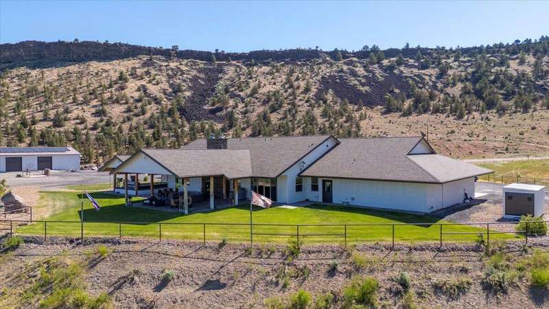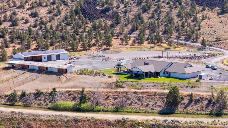 This exceptional custom ranch blends modern elegance with rural charm, just minutes from Prineville. Enjoy breathtaking views of the Crooked River Valley from the beautifully designed single-level home, featuring hardwood floors, granite countertops, a copper farmhouse sink, and a chef's kitchen with a spacious island, stainless steel appliances, and the butlers pantry provides ample storage. The great room and expansive covered back patio with a fireplace, swim spa, and lush landscaping create an entertainer's dream. The private primary suite boasts a spa-like bath, a huge walk-in closet, and peaceful views. A generous den offers flexibility as an office or extra bedroom. Equestrian enthusiasts will love the six-stall barn with large runs, tack room, roping arena, and cattle turnouts. A 3-bay shop provides abundant storage and workspace, and guest quarter. Whether you're seeking a working ranch or a private retreat, this property offers the perfect blend of comfort and functionality.