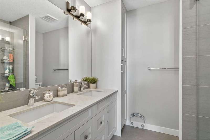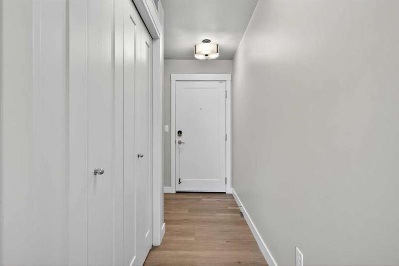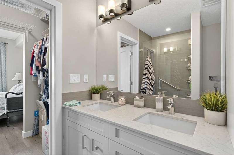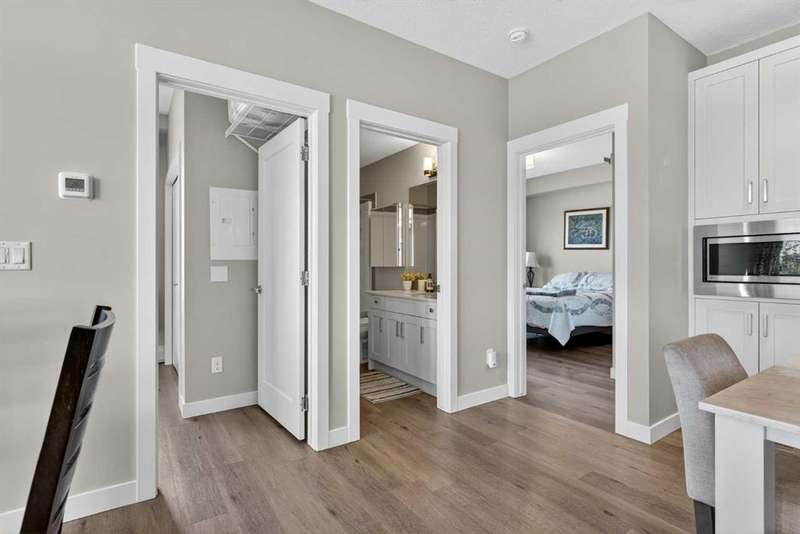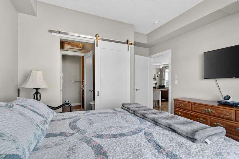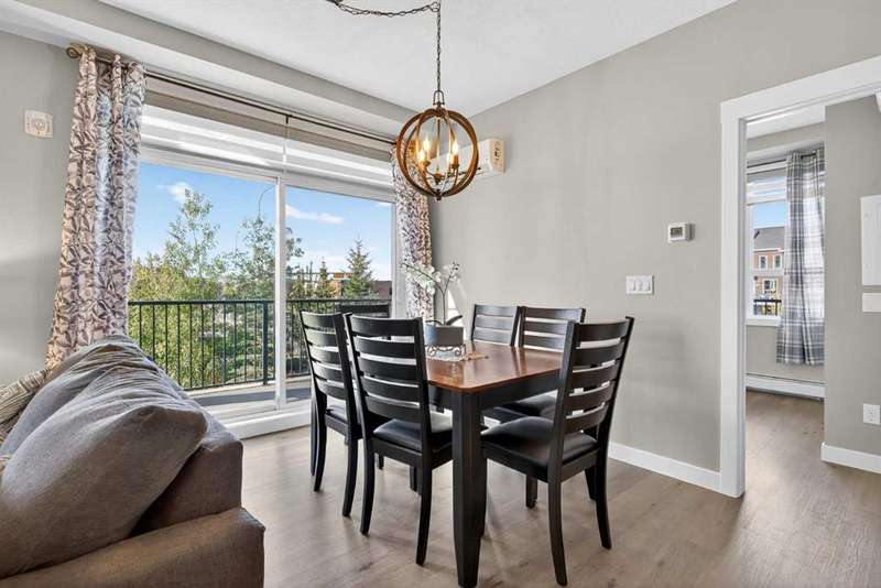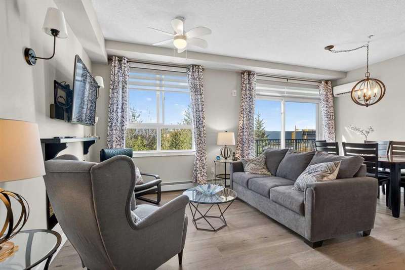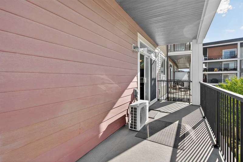 Beautifully designed End-Unit Bungalow apartment (original owner, many builder upgrades) with Air Conditioning, South-West-East exposed wrap-around Corner Balcony (over 20' in each direction!), gorgeous views, and incredible features - see iGuide virtual Tour and Floor Plans, then visit with your agent ASAP! ~900 square feet of space includes luxury plank and tile floors through the open gallery-style layout, with a stunning full-height contemporary white Kitchen with quartz counters, as the central focus. Stainless appliance package includes a chimney hood fan, built-in microwave, french-door fridge (bottom freezer), glass-top range and dishwasher, PLUS a lowered slab table, that expands the use from personal cooking, to full-entertainment capacity. Cabinet style pantry, pot-and-pan drawers and wine rack further enhance the thoughtful details. The Living and Dining areas are both full sized, and set up to enjoy relaxing, reading or watching movies in style, around the electric ribbon-burner fireplace. Higher ceilings, and being surrounded by huge windows and patio door across the back wall create a lofty, bright atmosphere, and increase the sense of privacy with nothing in the way of the views, nor any people to be seen! Both Bedrooms are adult-furniture-spaces, offering either Walk-through or wider Closets, plus storage shelving over doorways - brilliant! In each of the two full Bathrooms, either dual-sink or dual drawer-and-cabinets (plus medicine cabinet) are set off by more stone counters, and shower-or-tubs give choice and flexibility for different needs. Walden Place has a spacious secure Foyer, mail and package inside, underground Titled Parking with adjacent large Storage Unit in the same location, so incredibly convenient for seasonal and hobby requirements too. Located walking distance to Legacy's Township (larger and more comprehensive than Walden Gate) and Walden Pond/Paths, the building is wonderfully managed with 2024 Reserve Fund Study Report, pet-friendly Bylaws (both available to your agent or on demand), and responsive Simco staff. Nothing left out, but to move on this opportunity immediately.