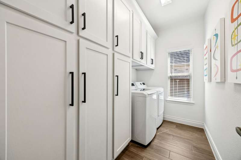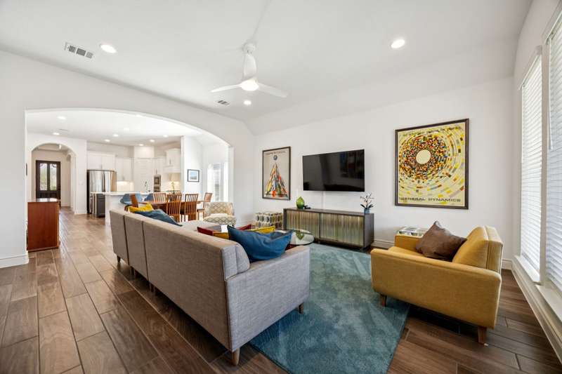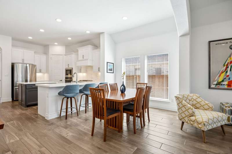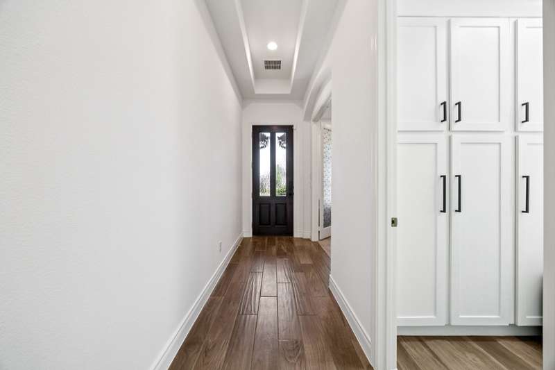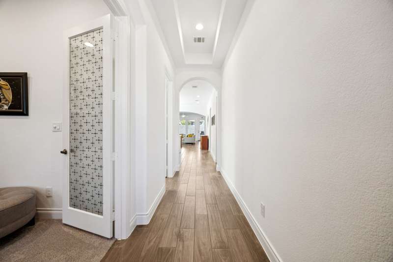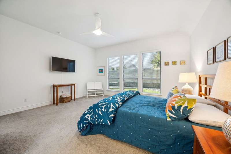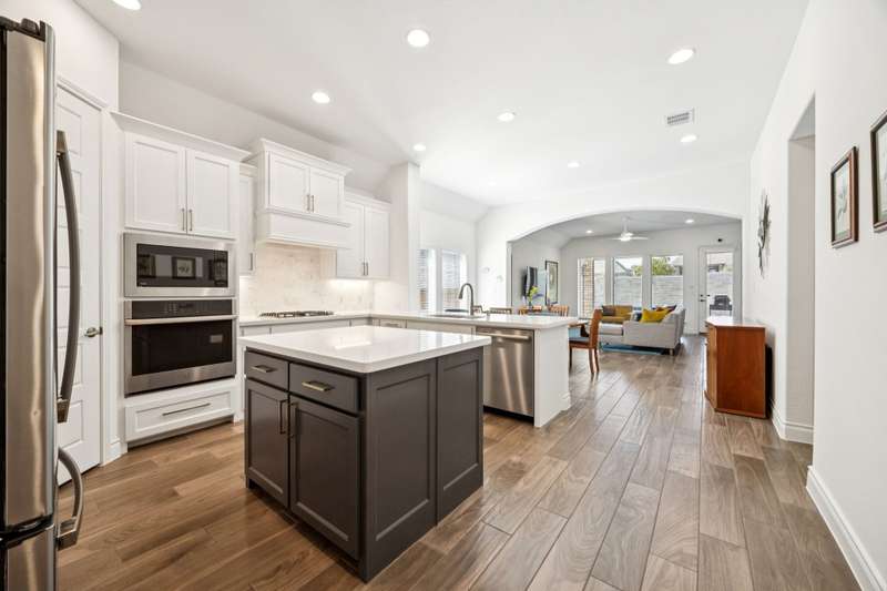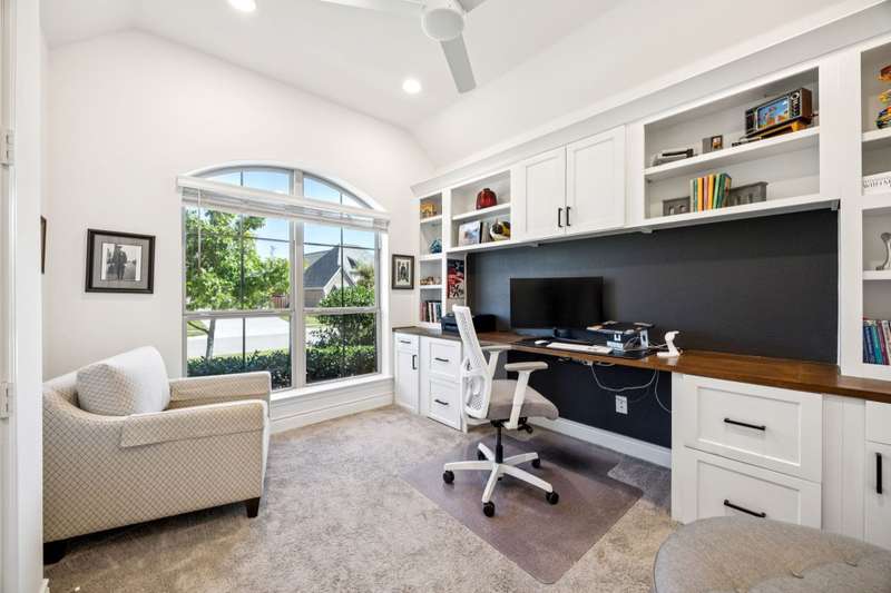 Welcome to 8817 Navidad Falls, a beautifully designed Perry home located in the sought-after master-planned community of Trinity Falls. This thoughtfully crafted residence combines modern elegance, functionality and comfort throughout every space. A private office with French doors provides the perfect setting for work or study, complete with built-in cabinets and desk for added convenience. The gourmet kitchen is a true centerpiece, featuring a spacious island, quartz countertops, stainless steel appliances, gas cooktop, under-cabinet lighting and a large walk-in pantry that ensures plenty of storage and prep space. The open-concept family room is bright and inviting, highlighted by a wall of windows that fill the space with natural light and offer seamless views of the backyard. The primary suite is a relaxing retreat with a spacious bedroom and a luxurious bath that includes a garden tub, separate glass-enclosed shower and a walk-in closet. Secondary bedrooms each feature their own walk-in closets, providing ample storage for family and guests alike. Additional highlights include Jellyfish lighting, a mud room located off the two-car garage, a utility room with built-in cabinets and covered patio with retractable screens - perfect for relaxing or entertaining year-round. Living in Trinity Falls means enjoying an exceptional lifestyle surrounded by nature and top-tier amenities. Residents have access to The Club, featuring a beach-entry pool, splash pad, pavilion with fireplace and grills, multiple play areas and parks. The Lodge offers a resort-style pool, fitness center, event lawn and coworking spaces. Miles of scenic trails, tranquil lakes and sprawling 350-acre natural park create the perfect setting for outdoor recreation and community connection. Ideally situated just minutes from shopping, dining and entertainment along the Highway 380 corridor, this home perfectly blends luxury, convenience and community in one of McKinneys most desirable neighborhoods.