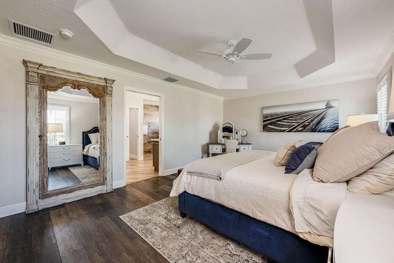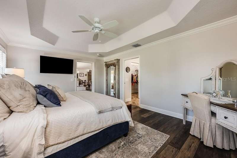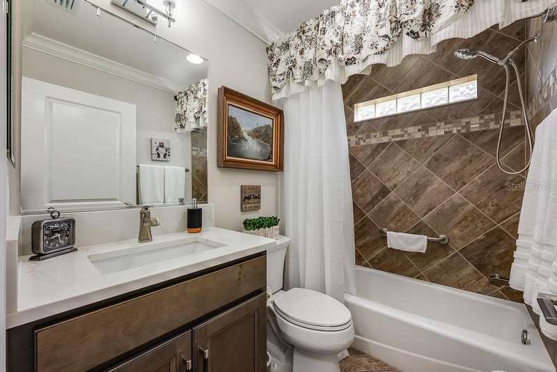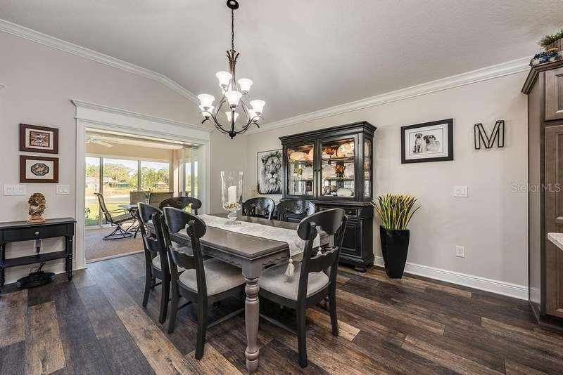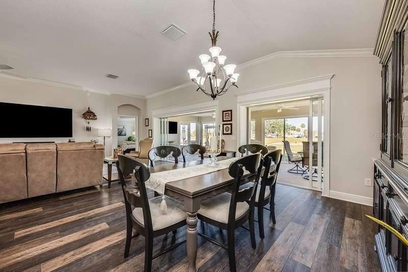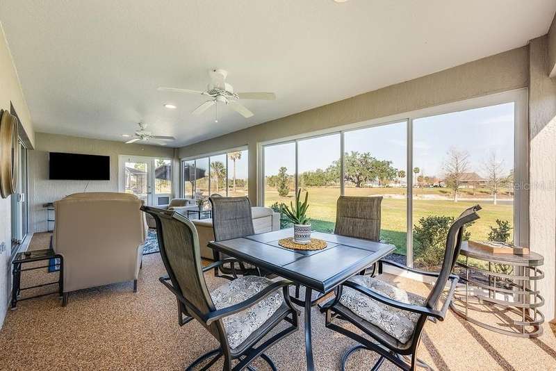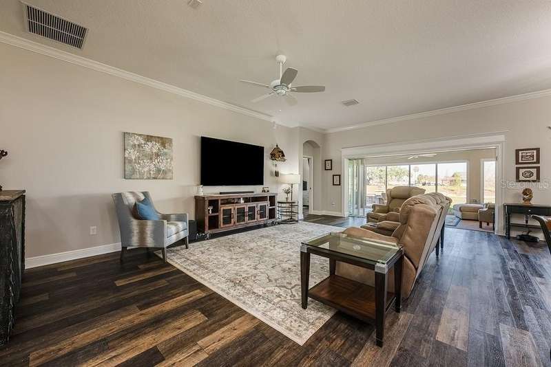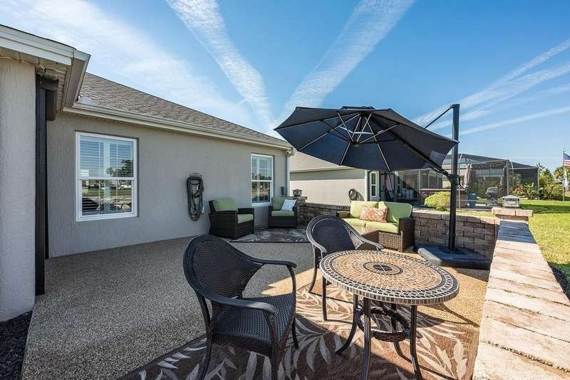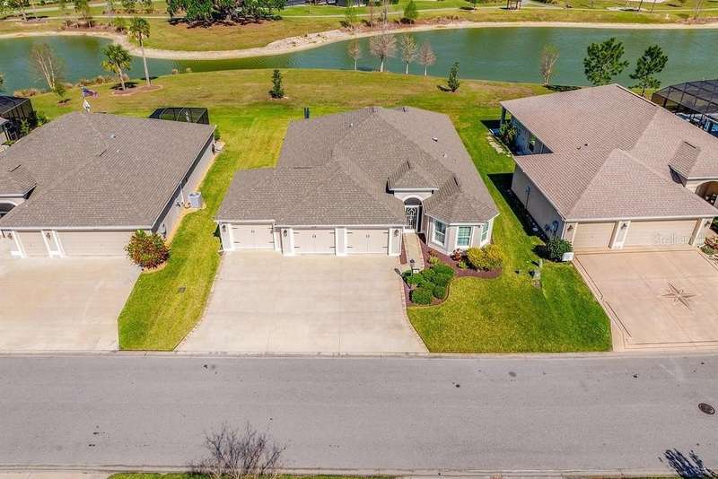 Seller may consider buyer concessions if made in an offer ~ Stunning Upgraded Home in The Village of Monarch – A Must-See! Welcome to your dream home in the highly desirable Village of Monarch! This beautifully updated and meticulously maintained residence offers the perfect blend of elegance, comfort, and functionality – truly a one-of-a-kind find in The Villages. Step inside and immediately notice the attention to detail: custom door and window casings, stunning crown moldings, and tile floors throughout that provide both beauty and durability. The open-concept living area flows seamlessly into the chef’s kitchen, complete with high-end finishes and designed for entertaining and everyday comfort. One of the true highlights of this home is the expansive 28x12 fully enclosed Florida room, featuring tranquil views of the pond and Riverbend Recreation Facility. Outfitted with new power roller shades, this space offers the perfect balance of privacy and natural light, making it ideal for year-round relaxation. Designed with a three-way split floorplan, the home offers optimal privacy and versatility. The spacious primary suite boasts a tray ceiling, water views, and a luxurious en suite bathroom with double sink vanity, a large tiled walk-in shower, walk-in closet, and its own dedicated tankless water heater. The second bedroom is bright and welcoming with bay windows that fill the room with natural light and also includes its own private en suite bath—perfect for guests or extended family. The third bedroom, located on the opposite side of the home, serves as an ideal guest suite, office, or flex space to suit your needs. And there’s more—this home features one of the largest garages in the area at 37x24 ft, offering plenty of space for vehicles, storage, and of course, your golf cart! Step outside and enjoy the oversized patio overlooking the serene pond and recreation facilities—perfect for evening sunsets or entertaining friends. There's even room to add a private pool if desired. This modified version of the popular Dove Model is loaded with upgrades and custom touches throughout. Don't miss your opportunity to own this unique, move-in ready home—schedule your private tour today!