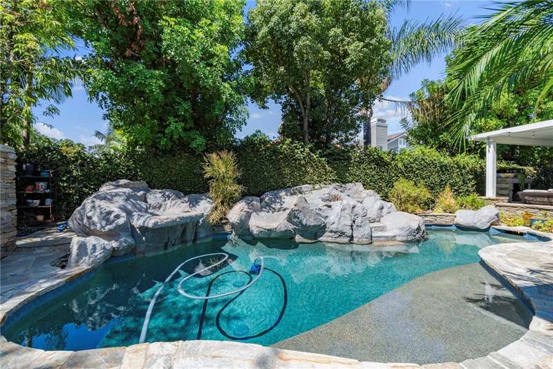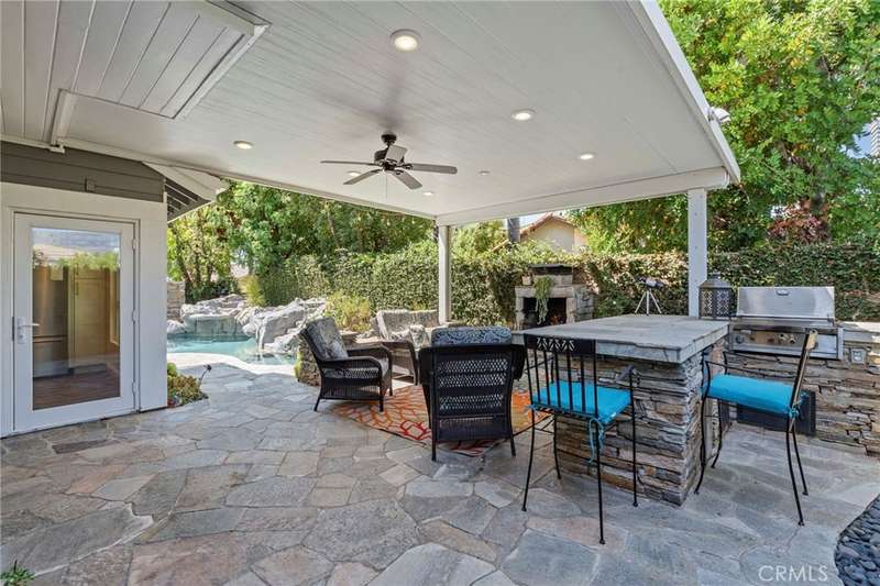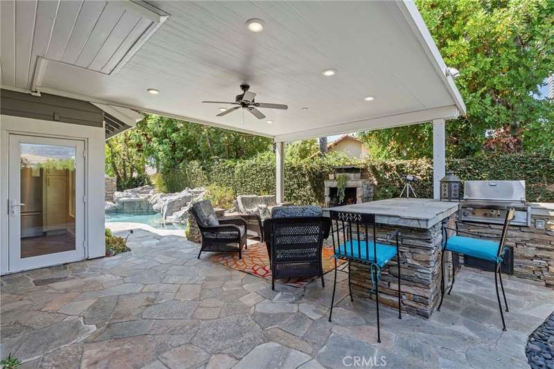 Step outside to your private backyard retreat, complete with a covered patio, outdoor fireplace, built-in BBQ with mini fridge, and a sparkling rock pool and spa with slide and waterfall--perfect for year-round enjoyment.