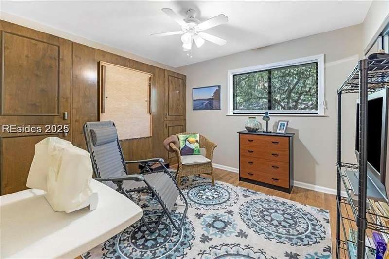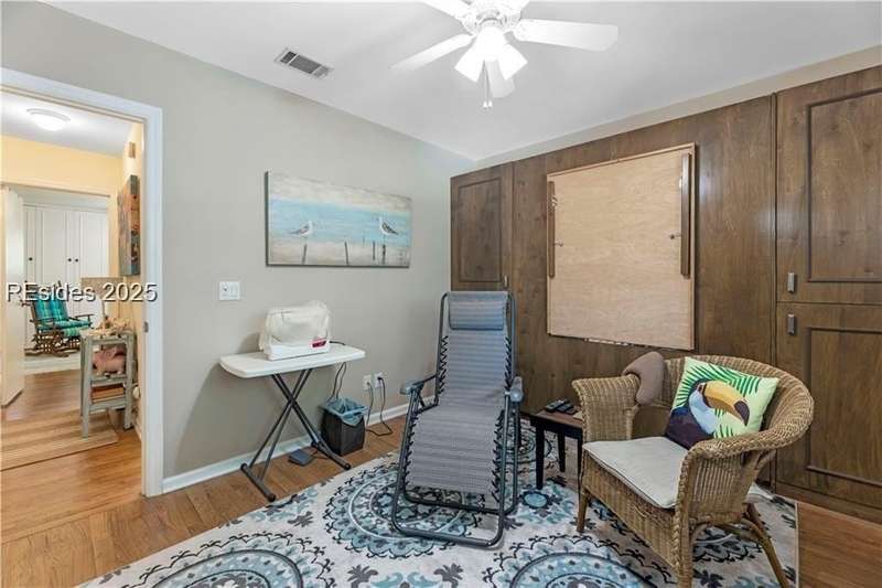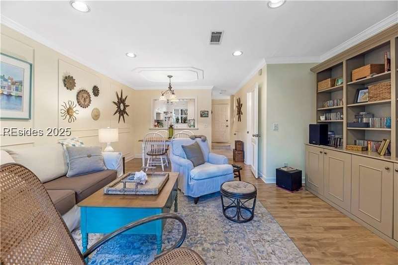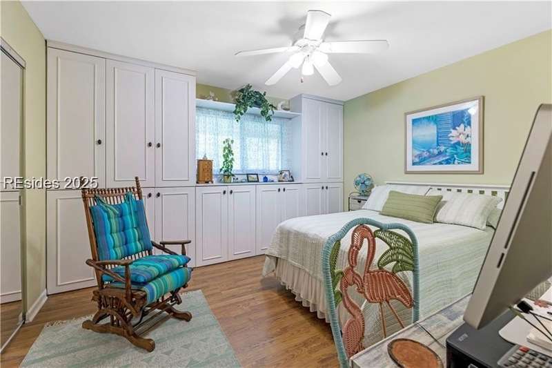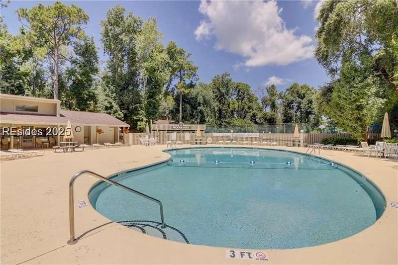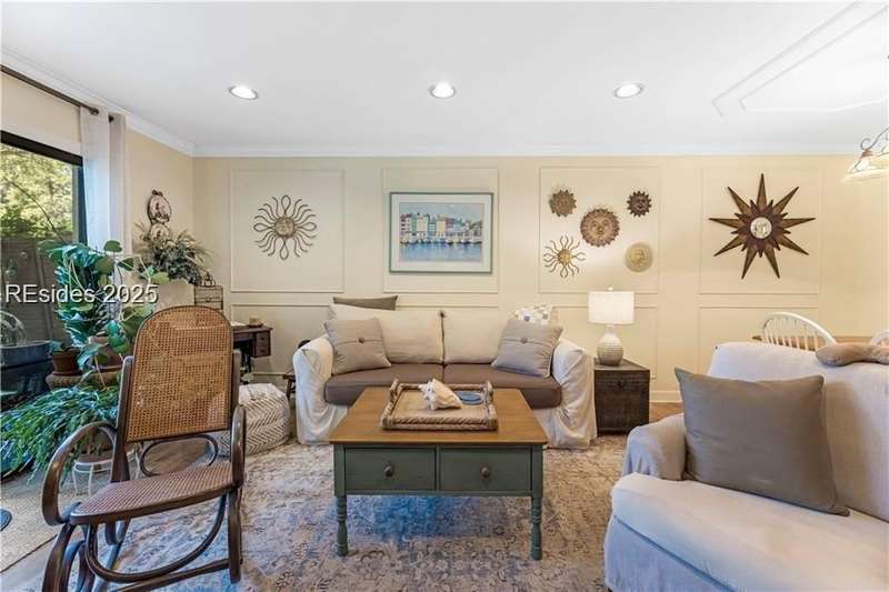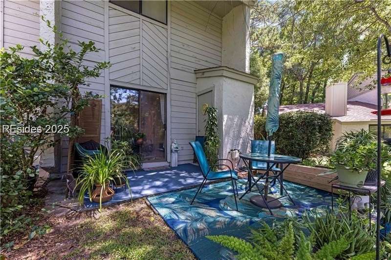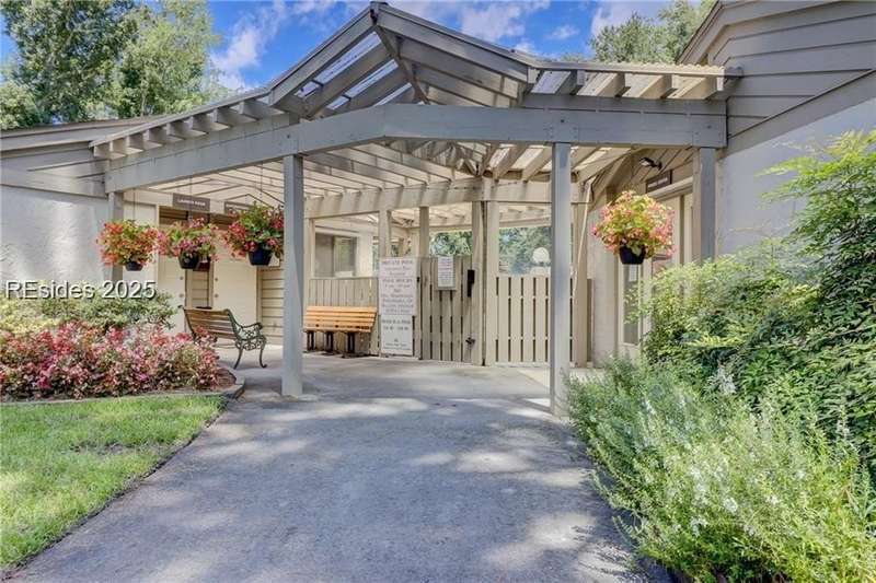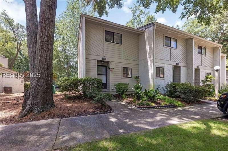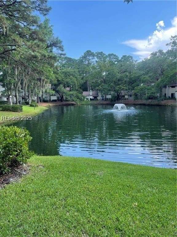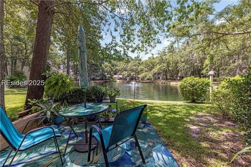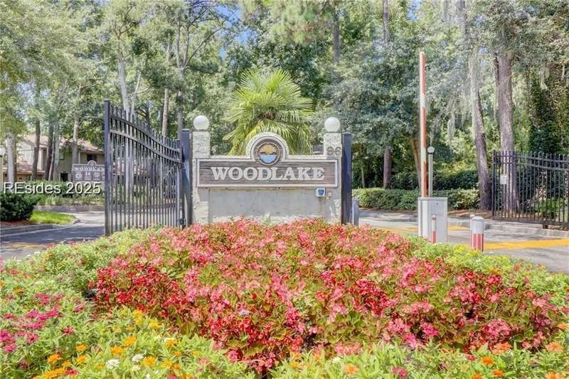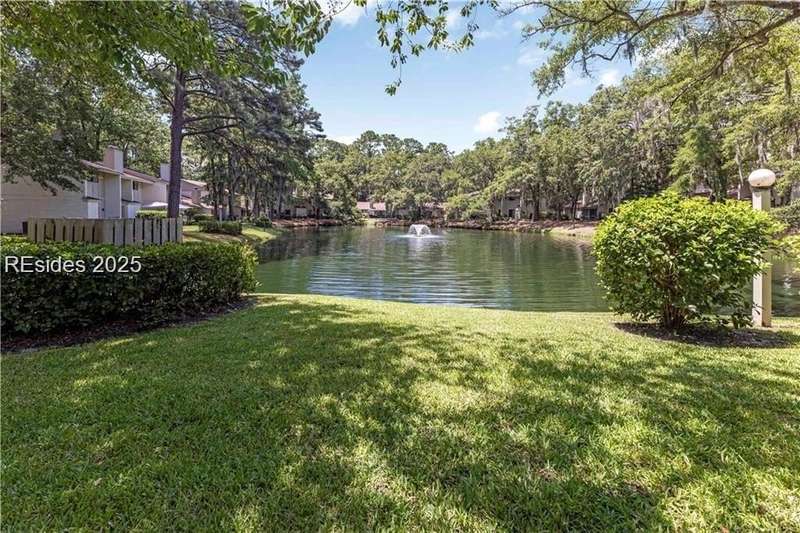 Enter the quiet and charming gated villa community of Woodlake Villas to view this beautifully maintained townhome. Step inside to peaceful living with view of lagoon with fountain, flower gardens, and extended outdoor living area. Open living area with fireplace. Upstairs has 2 bedrooms and 2 baths with nice separation and a linen closet. Primary bedroom has view of the lagoon. Second bedroom has a queen size murphy bed with a pull-out table when the bed is not in use! Quiet community centrally located on the island with convenient location to all Hilton Head Island has to offer!