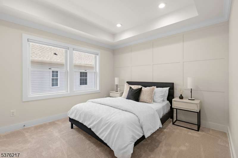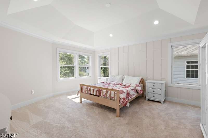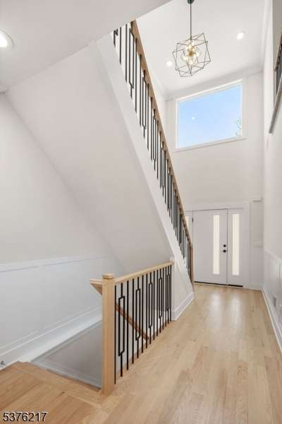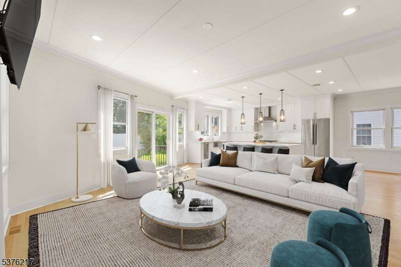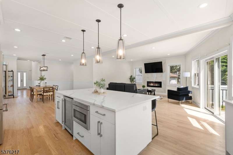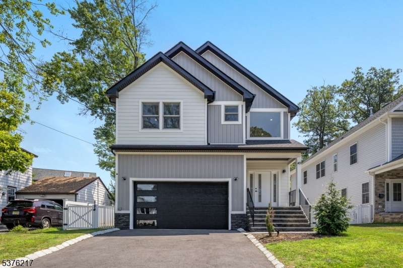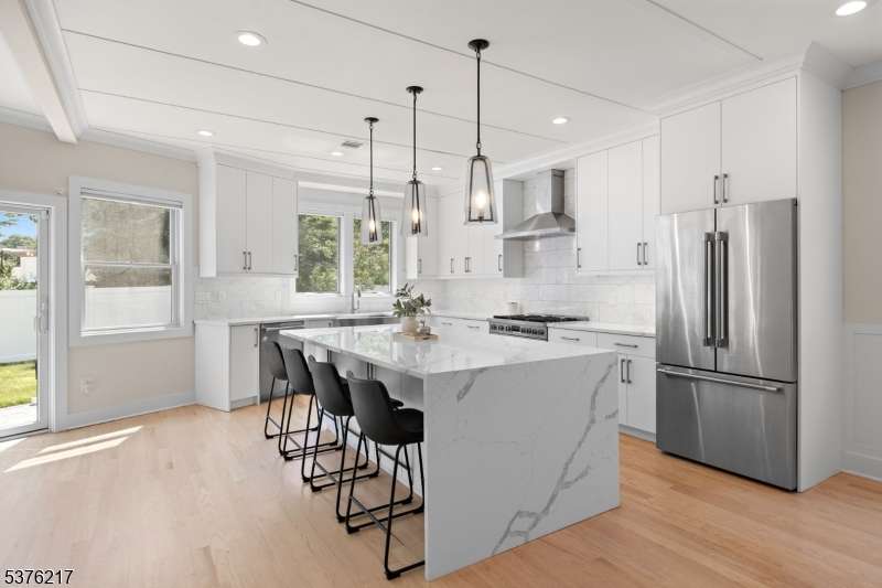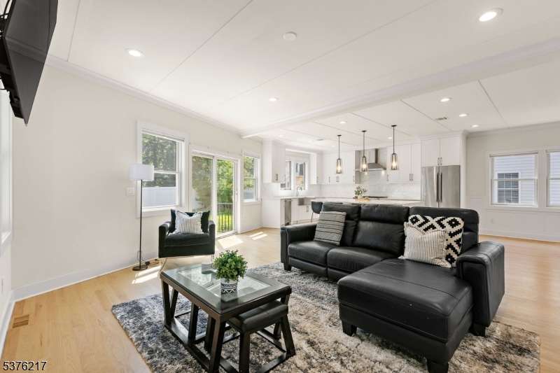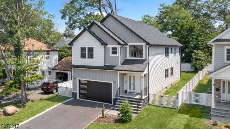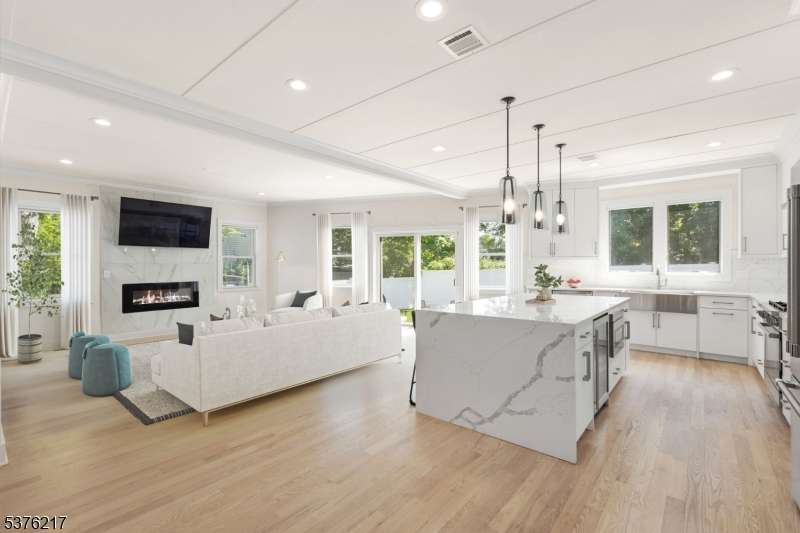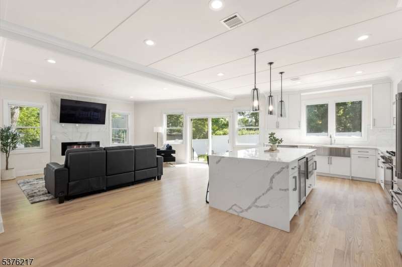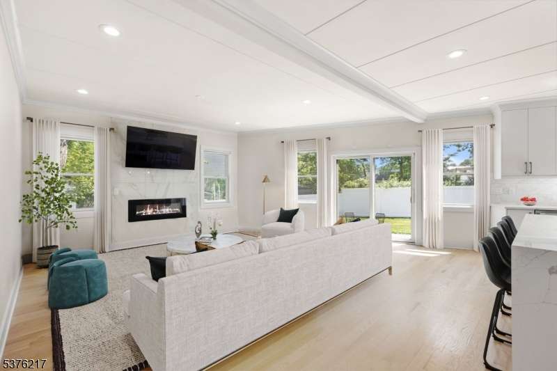 Gorgeous newer construction Colonial on a quiet, tree-lined street in one of Livingston's most desirable neighborhoods. This beautifully appointed 5BR, 5.5BA home showcases hardwood oak floors, 8-10' ceilings, custom millwork, and designer tilework throughout. The main level offers an open layout with sun-drenched living and dining areas, a family room with a sleek electric fireplace and tiled surround, and sliders that open to a private, fenced-in backyard with patio. The chef's kitchen is a standout, featuring floor-to-ceiling custom cabinetry, quartz countertops, a dramatic waterfall island, walk-in pantry, and premium Thermador appliances. Also on this floor are a first-floor en-suite, powder room, and custom mudroom with built-ins. Upstairs, the expansive primary suite boasts dual walk-in closets and a spa-like bath with soaking tub, stall shower, and double vanity. A princess suite, two additional bedrooms with shared bath, and a full laundry room complete the second floor. The finished basement includes a spacious rec/media room, full bath, and ample storage. Additional features include custom blinds throughout, a full sprinkler system, a whole-home water treatment system, and the balance of a 10-year builder warranty. Prime location near top-rated schools, houses of worship, parks, shopping, and NYC transportation.