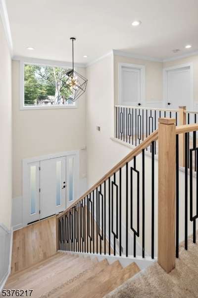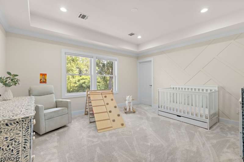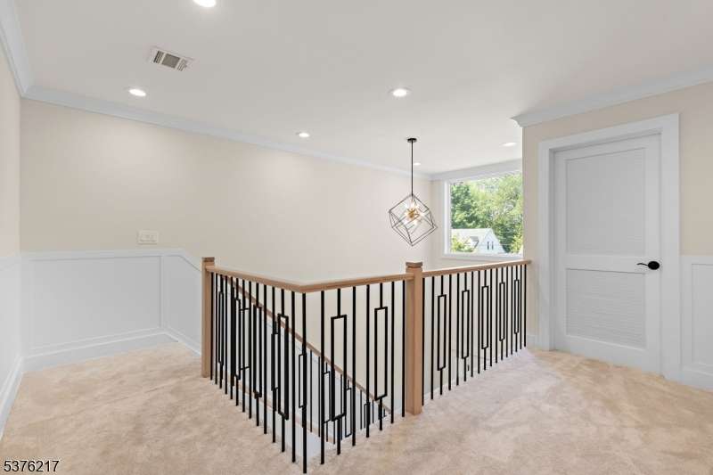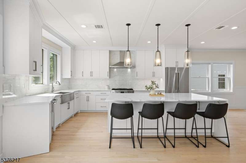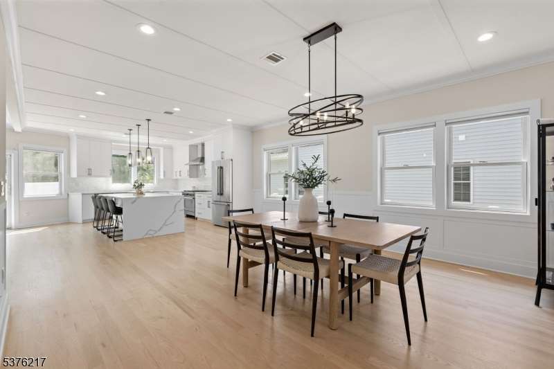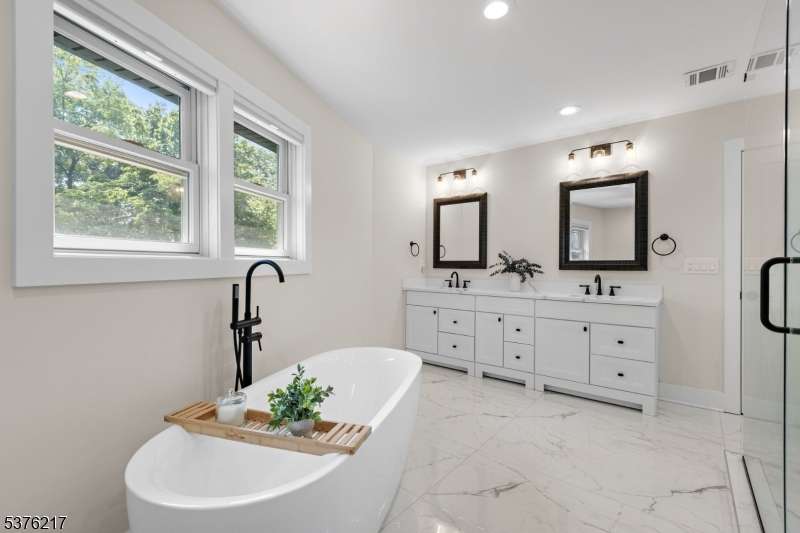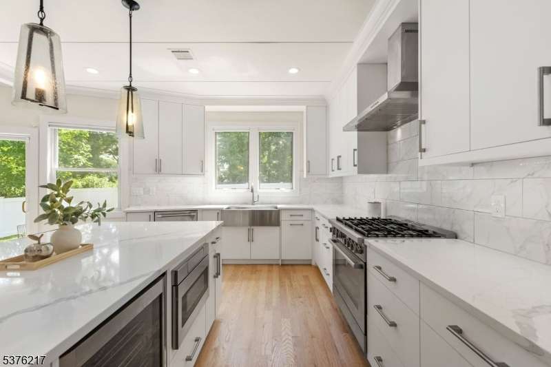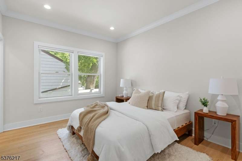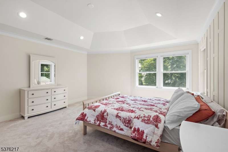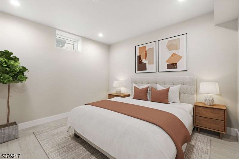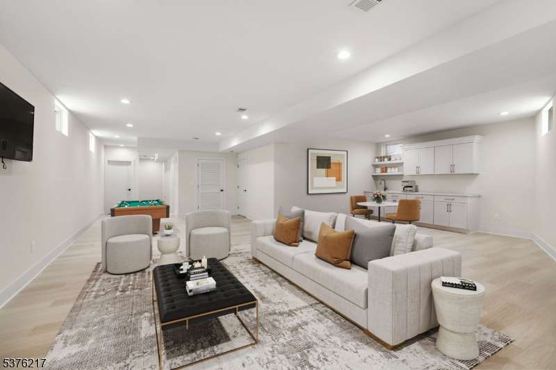 Gorgeous newer construction Colonial on a quiet, tree-lined street in one of Livingston's most desirable neighborhoods. This beautifully appointed 5BR, 5.5BA home showcases hardwood oak floors, 8-10' ceilings, custom millwork, and designer tilework throughout. The main level offers an open layout with sun-drenched living and dining areas, a family room with a sleek electric fireplace and tiled surround, and sliders that open to a private, fenced-in backyard with patio. The chef's kitchen is a standout, featuring floor-to-ceiling custom cabinetry, quartz countertops, a dramatic waterfall island, walk-in pantry, and premium Thermador appliances. Also on this floor are a first-floor en-suite, powder room, and custom mudroom with built-ins. Upstairs, the expansive primary suite boasts dual walk-in closets and a spa-like bath with soaking tub, stall shower, and double vanity. A princess suite, two additional bedrooms with shared bath, and a full laundry room complete the second floor. The finished basement includes a spacious rec/media room, full bath, and ample storage. Additional features include custom blinds throughout, a full sprinkler system, a whole-home water treatment system, and the balance of a 10-year builder warranty. Prime location near top-rated schools, houses of worship, parks, shopping, and NYC transportation.