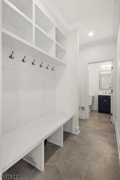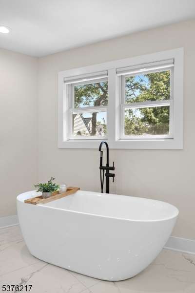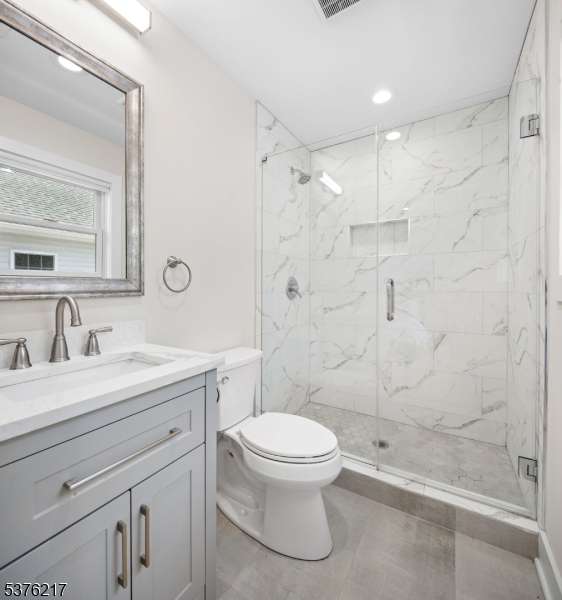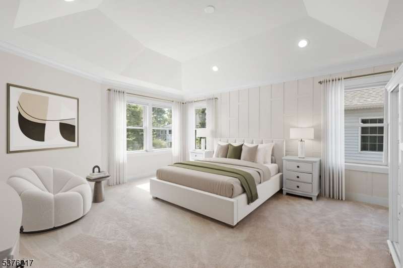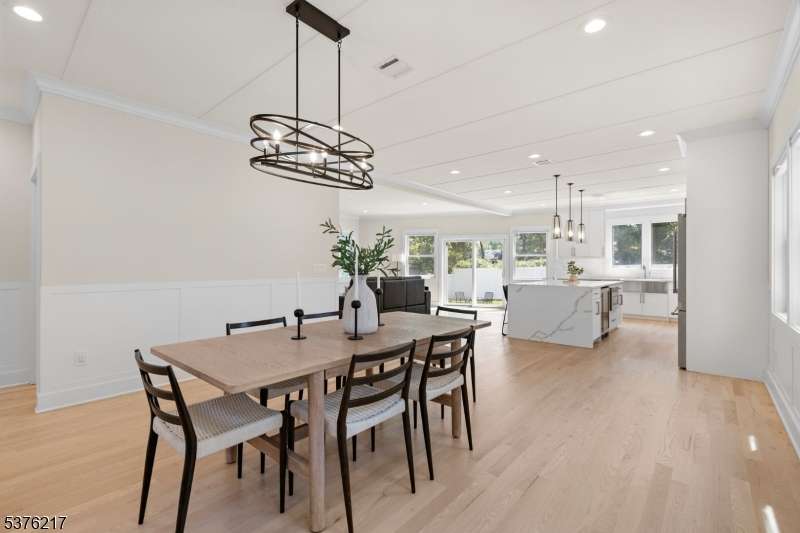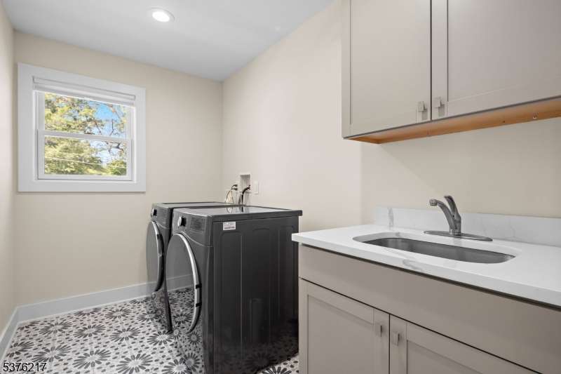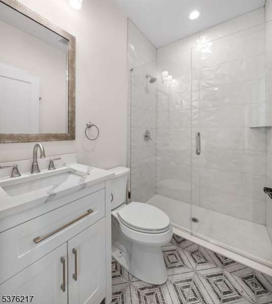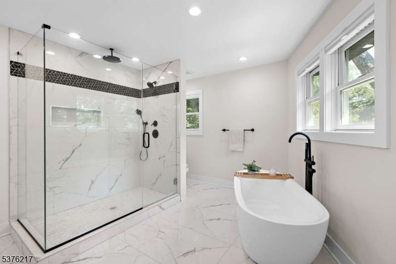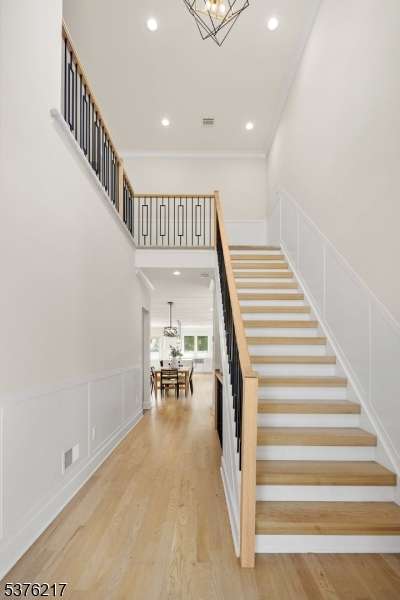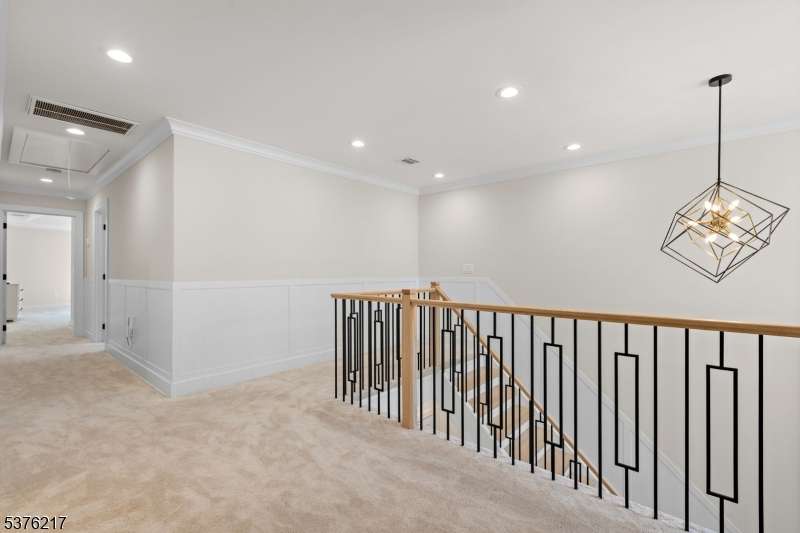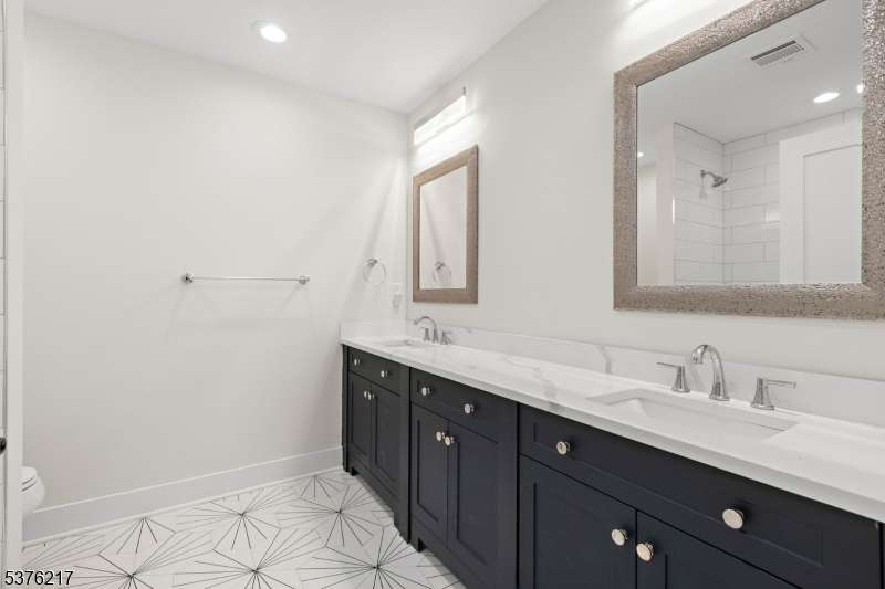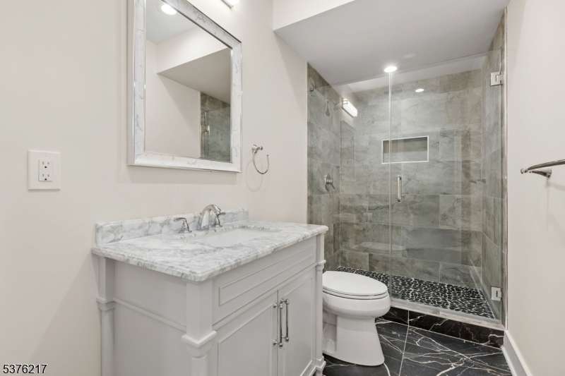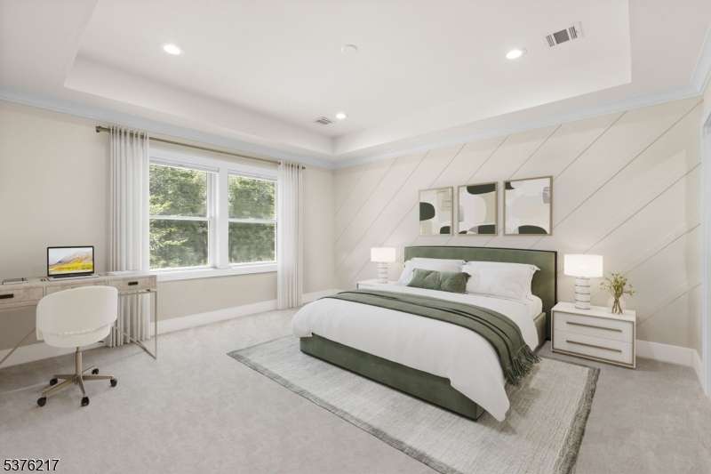 Gorgeous newer construction Colonial on a quiet, tree-lined street in one of Livingston's most desirable neighborhoods. This beautifully appointed 5BR, 5.5BA home showcases hardwood oak floors, 8-10' ceilings, custom millwork, and designer tilework throughout. The main level offers an open layout with sun-drenched living and dining areas, a family room with a sleek electric fireplace and tiled surround, and sliders that open to a private, fenced-in backyard with patio. The chef's kitchen is a standout, featuring floor-to-ceiling custom cabinetry, quartz countertops, a dramatic waterfall island, walk-in pantry, and premium Thermador appliances. Also on this floor are a first-floor en-suite, powder room, and custom mudroom with built-ins. Upstairs, the expansive primary suite boasts dual walk-in closets and a spa-like bath with soaking tub, stall shower, and double vanity. A princess suite, two additional bedrooms with shared bath, and a full laundry room complete the second floor. The finished basement includes a spacious rec/media room, full bath, and ample storage. Additional features include custom blinds throughout, a full sprinkler system, a whole-home water treatment system, and the balance of a 10-year builder warranty. Prime location near top-rated schools, houses of worship, parks, shopping, and NYC transportation.