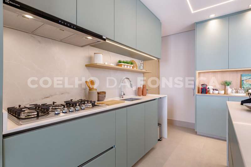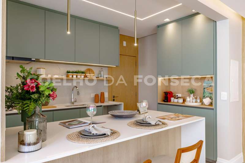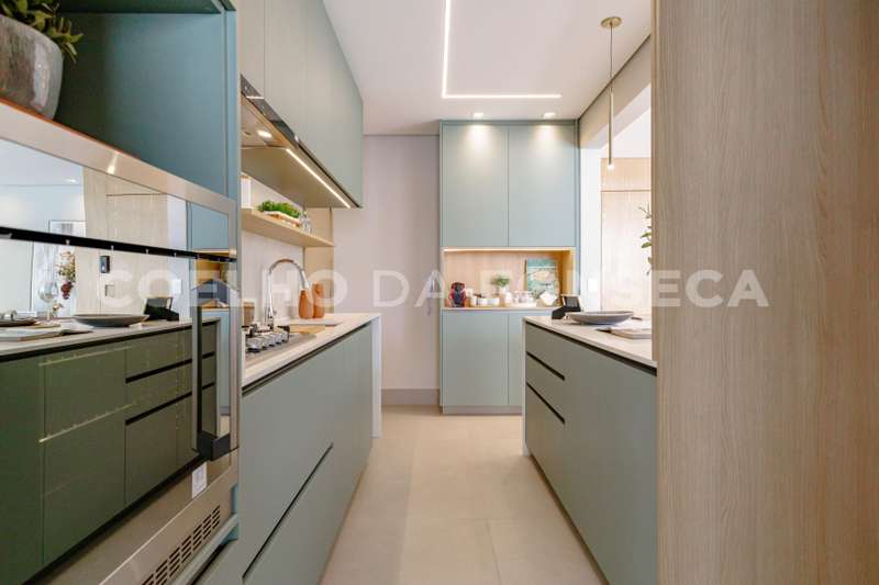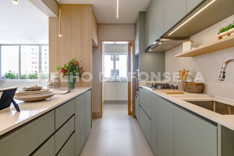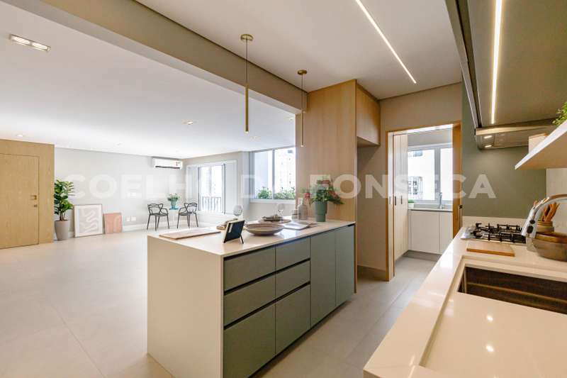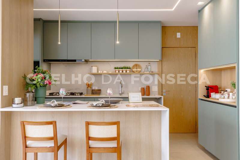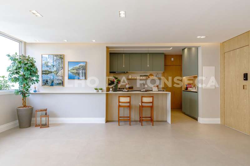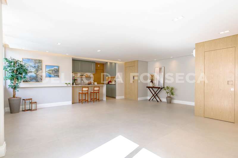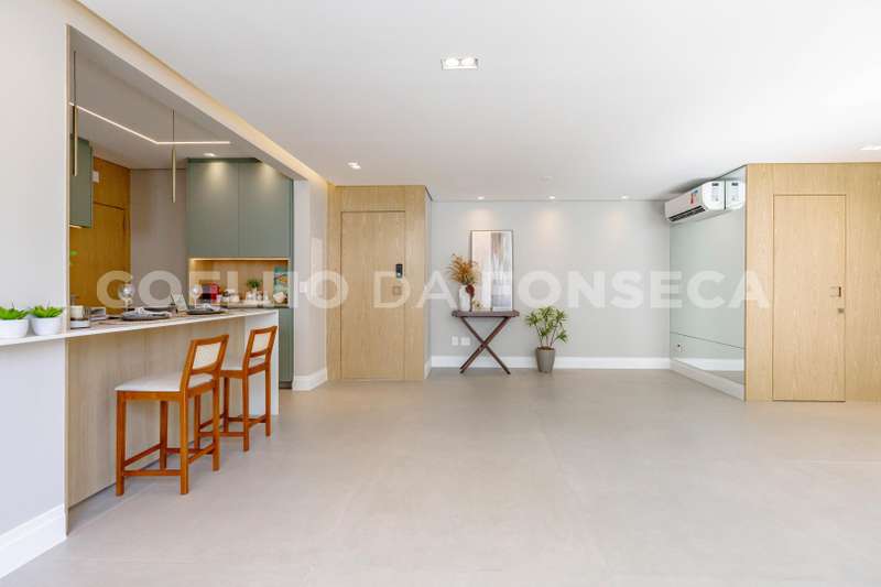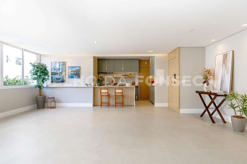Com *130m²*, o apartamento foi *totalmente reformado* para oferecer *charme e conforto à nova família que vai habitá-lo*. Ao entrar, você se depara um *amplo living para 3 ambientes bem iluminado e boa ventilação natural*, ideal para convivência em família. O painel em lâmina de madeira natural Carvalho Americano e o espelho na sala de jantar trazem ainda mais charme e aconchego ao ambiente. A *cozinha americana(, planejada e funcional, se integra ao living com harmonia e a bancada é perfeita para reunir a família.