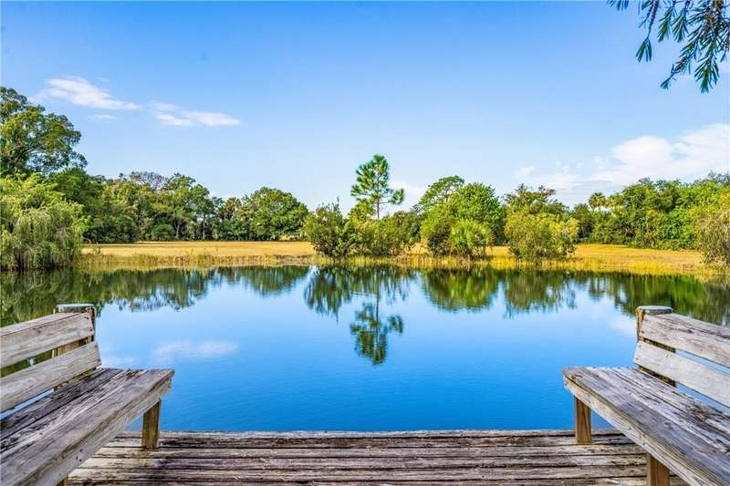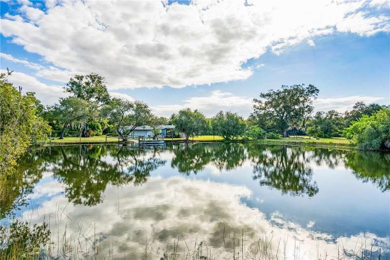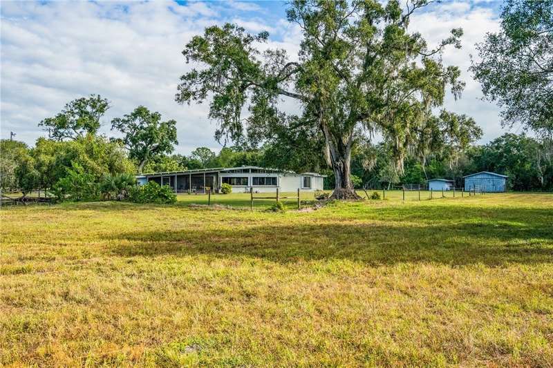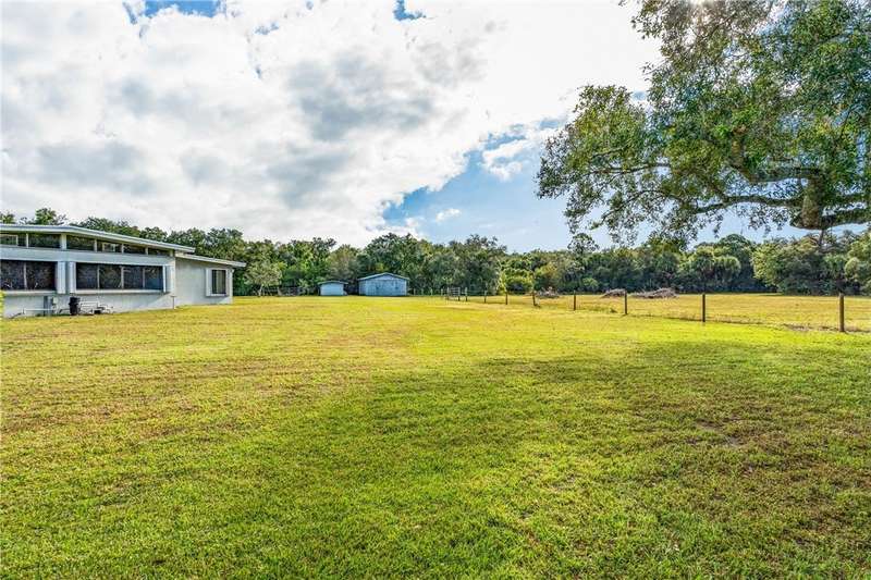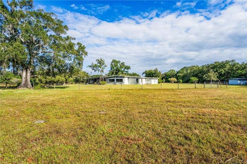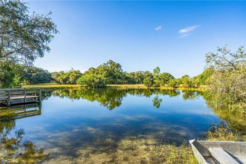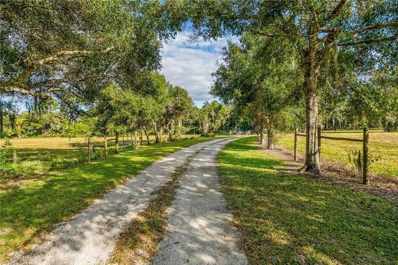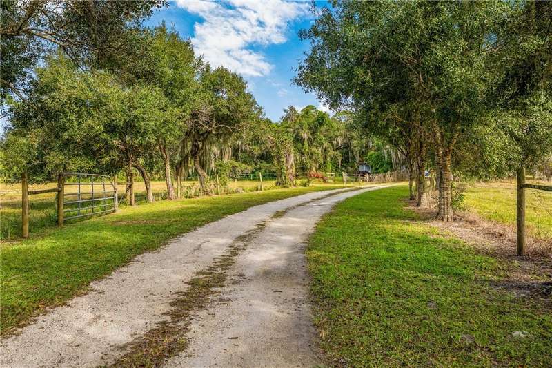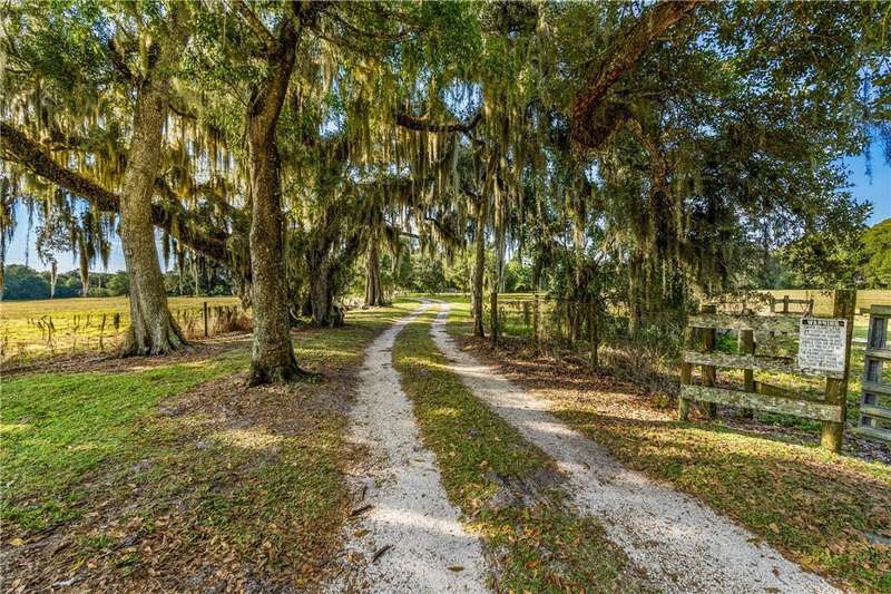 Once-in-a-lifetime opportunity to own a private oasis. This remarkable property spans 20 acres of pristine Florida countryside. The grounds are a sanctuary of natural beauty, with fenced, lush green pastures shaded by magnificent oak trees. An artesian spring pond is surrounded by red flower bottle brush trees. Relax with bird song in the morning and a painter's sky at sunset. A driveway lined with oak trees and crepe myrtles leads to a 1950's-built, mid-century architecture home, complete with expansive porches, pickled gray wood built-ins, wood kitchen cabinets and an indoor pool.