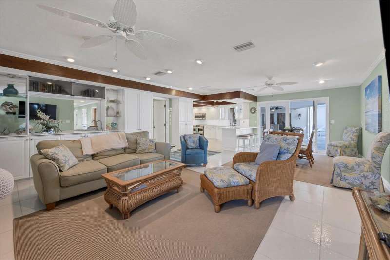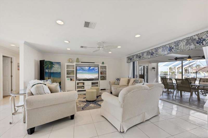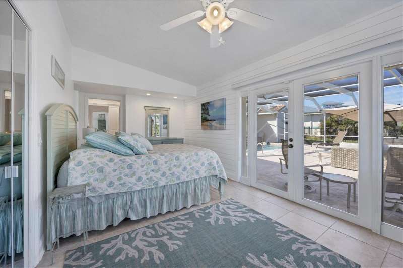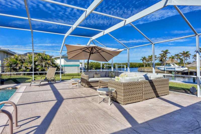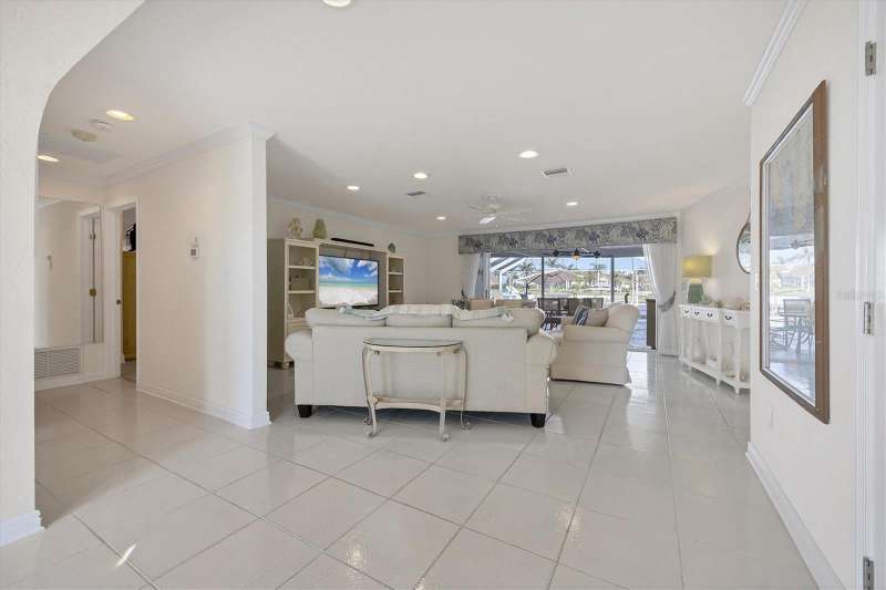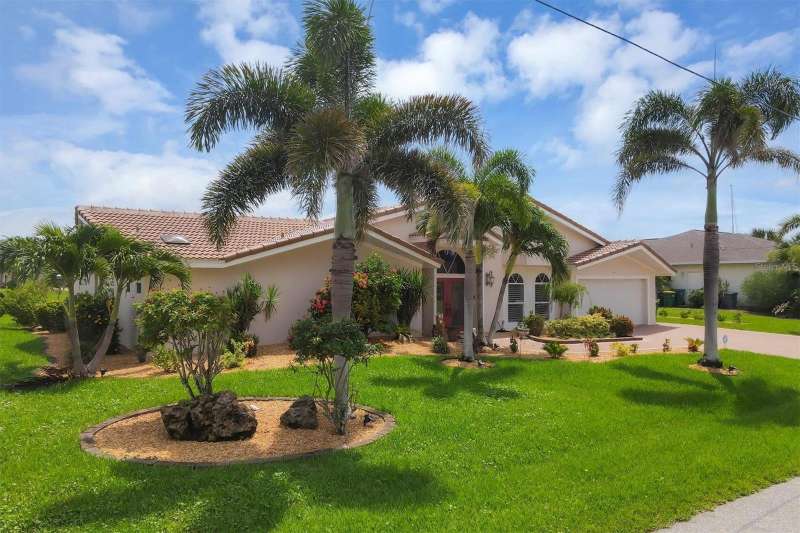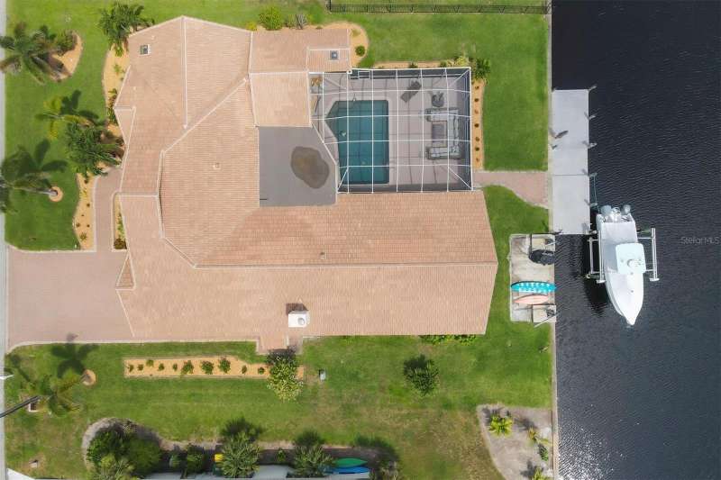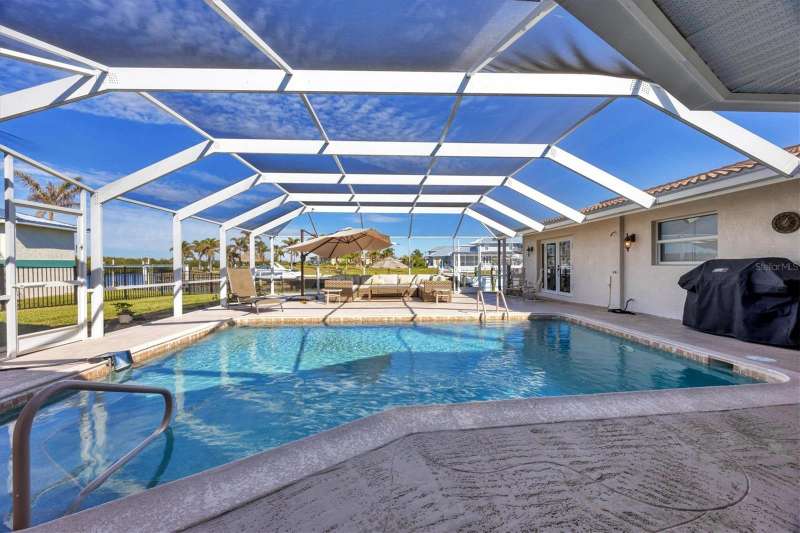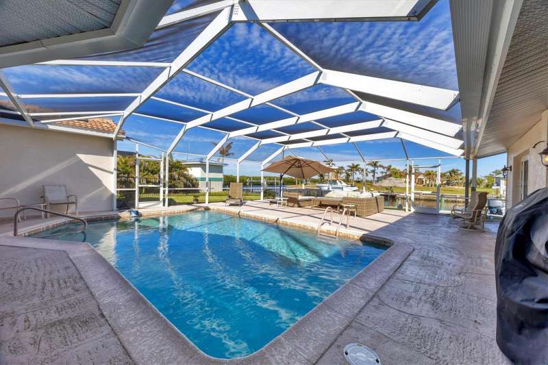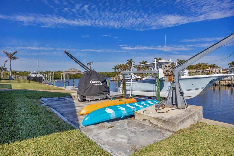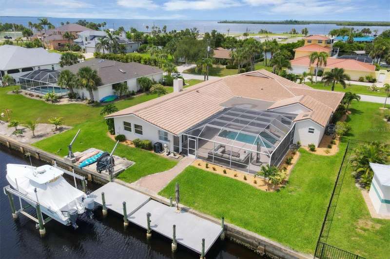 Experience the ultimate in waterfront living with this stunning 4-bedroom, 5-bath home located just minutes from Charlotte Harbor — with no bridges to open water. This spacious and well-designed home features a formal dining room, private den, family room, and a large sitting area off the master suite, ideal for a quiet retreat, office, or lounge space. The heart of the home opens up to an expansive lanai that wraps around a resort-style pool, all enclosed by a brand-new pool cage. With four sets of French doors and sliders leading out to the pool area, the layout offers effortless indoor-outdoor living and entertaining. The newly landscaped grounds frame the water views, while a boat lift and two davits for jet skis make it easy to enjoy the waterfront lifestyle. Upstairs, a loft at the front of the home provides flexible additional living space and features its own private balcony — perfect for a reading nook, home gym, or game room. Additional highlights include a new roof, dual-zone A/C, and direct sailboat water access with no bridges to the harbor. This is a rare opportunity to own a true Florida waterfront retreat with generous space, thoughtful design, and unmatched boating access.