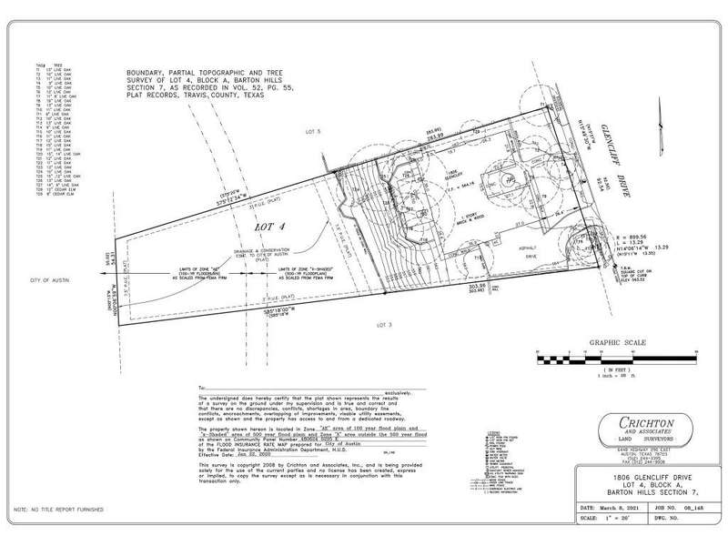 An incredible opportunity to own a half-acre greenbelt lot in Barton Hills! With its elevation high above the lush greenbelt, the views of Barton Creek and the rolling hills are unparalleled. Experience front-row seats to vivid sunsets, and enjoy year-round gentle breezes from a truly remarkable spot. Greenbelt properties on Glencliff rarely change hands, as they are cherished for their prized location-- in addition to incomparable views, they are less than two blocks from Barton Hills’ own elementary school, park, and trailhead entrance to miles of outdoor fun on the hike and bike trails winding along Barton Creek. Whether you choose to extensively remodel the existing house, design your own retreat or customize new plans by acclaimed architect Jay Corder, the end result will be a legacy property like no other. Designed to blend beautifully into the natural surroundings and maximize greenbelt views from every room, these plans emphasize a modern aesthetic and call for a 4517sf 4-bedroom 4-bath home with lower-level guest quarters. Multiple indoor and outdoor living areas, including a roof-top deck and negative-edge pool would enhance an already perfect setting for relaxation and entertainment. Best of all, permits are active and plans convey to the buyer, adding immense value to this property! Barton Hills offers the quintessential Austin lifestyle. Hugged by the Barton Creek Greenbelt high in the hills above Zilker Park, it feels worlds away from the hustle and bustle of city life, yet it’s steps from the energy and charm of Austin’s most celebrated and iconic attractions. Friendly neighbors, a close-knit community and cherished traditions such as the 4th of July parade are the cherry on top! Don’t miss your chance to check all the boxes with this truly exceptional property. Information provided is deemed reliable, but is not guaranteed. Buyer should independently verify all information relating to this property.
