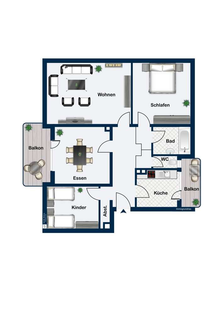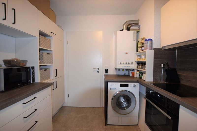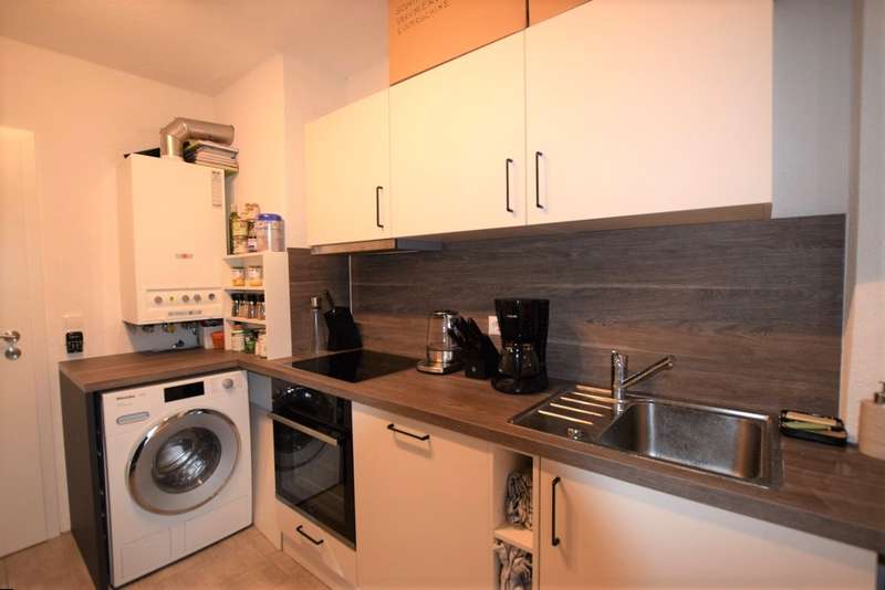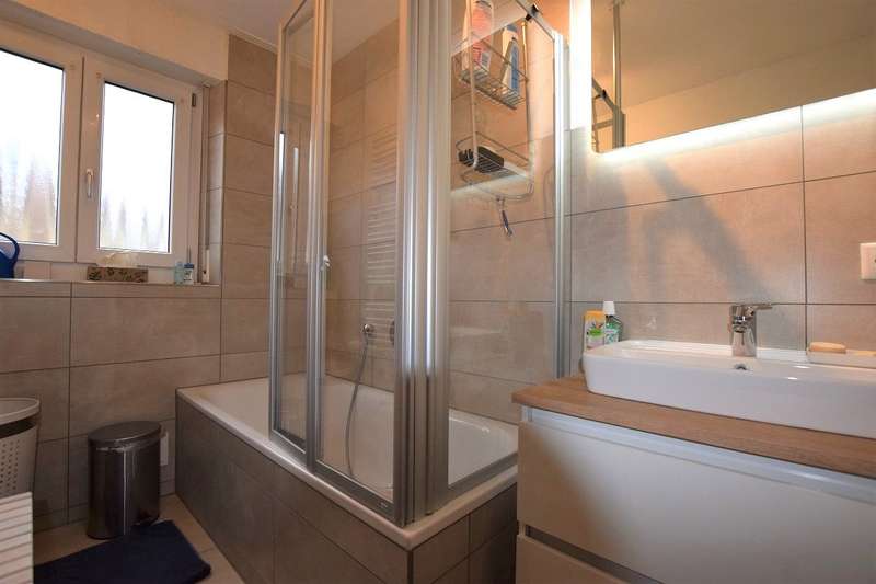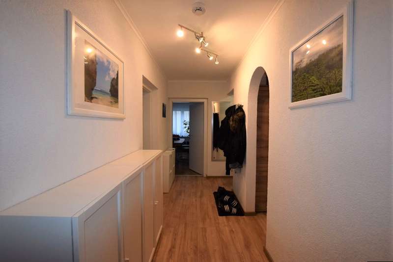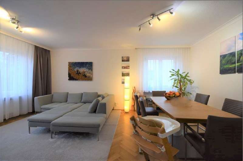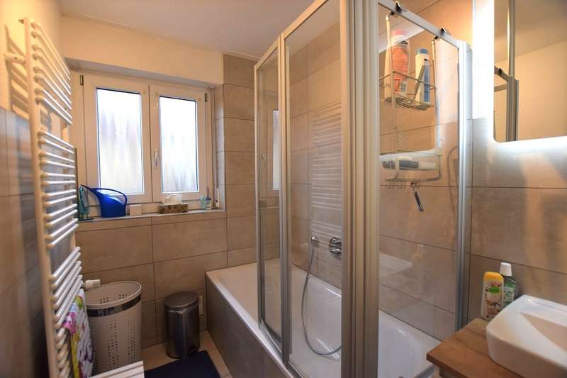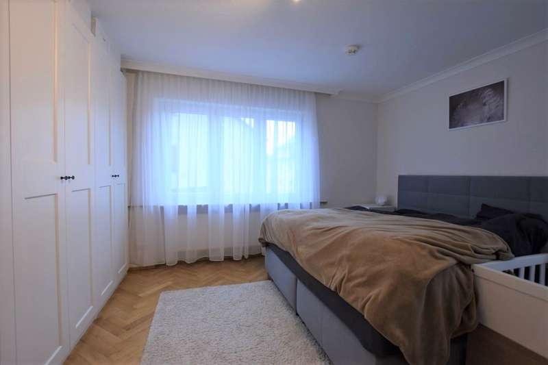 The offered property is a well-cut bright four-room apartment, consisting of a hallway, bathroom, toilet, kitchen, two bedrooms, a dining room and a living room, as well as two balconies. The apartment is located on the mezzanine floor of a well-kept apartment building with only seven other parties. The large, very cozy living room is the center of your new home. The room is large enough to accommodate both the family dining space and a cozy couch/TV nook. The sliding wooden door with glass insert separates the actual dining room from the living area. The dining room can also be used well as an office or children's playroom. From the living room you can also access the covered south-facing balcony. The kitchen is equipped with a fitted kitchen as good as new, installed in 2022. The fitted kitchen including electrical appliances is already included in the purchase price. You can enjoy your breakfast on nice days on the adjacent covered east balcony. The two bedrooms are generously designed and offer good space for a double bed, closet and children's room furniture. The modernized daylight bathroom is tiled in timeless light colors and has both a bathtub with shower device and a washbasin with mirror and matching vanity unit. Furthermore, the apartment has a hallway with space for a wardrobe, a renovated toilet with natural light and a storage room. All rooms are well cut and offer creative furnishing possibilities for your furniture. The kitchen like the bathroom and WC are tiled in modern colors. In the hallway and the children's room is easy-care laminate flooring in wood look. In the remaining rooms high-quality real wood parquet in herringbone pattern is laid. The apartment is equipped with plastic windows, 2-fold insulated glazing and shutters. Furthermore, a lockable cellar compartment belongs to the apartment. A garage is available directly behind the house and is included in the purchase price. A shared laundry room is also available in the basement. Currently, the apartment is still inhabited. The apartment will be available for occupancy in winter 2023. You acquire here a tasteful apartment in modernized condition. Convince yourself of this beautiful apartment on site. We are happy to arrange, in consultation with the residents, a personal viewing appointment. Please send us a completely filled out contact request with your telephone number by e-mail. We are looking forward to meeting you.