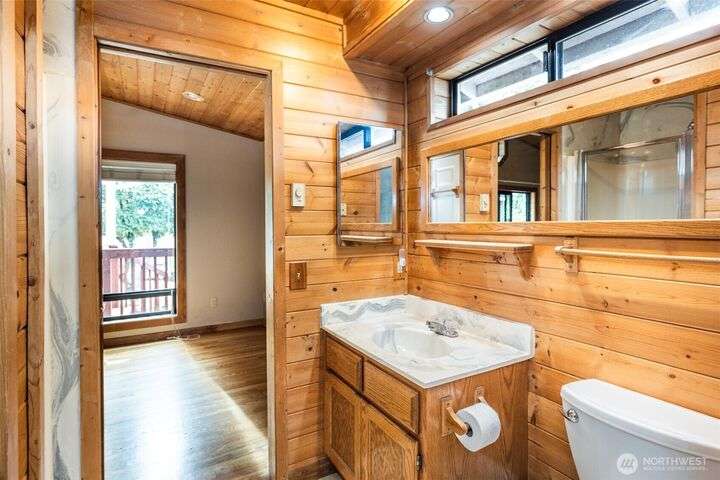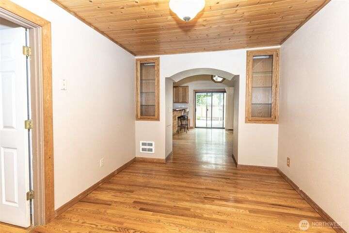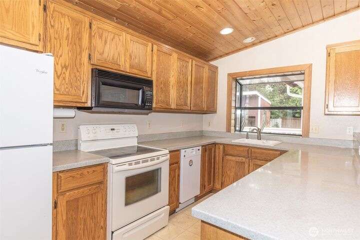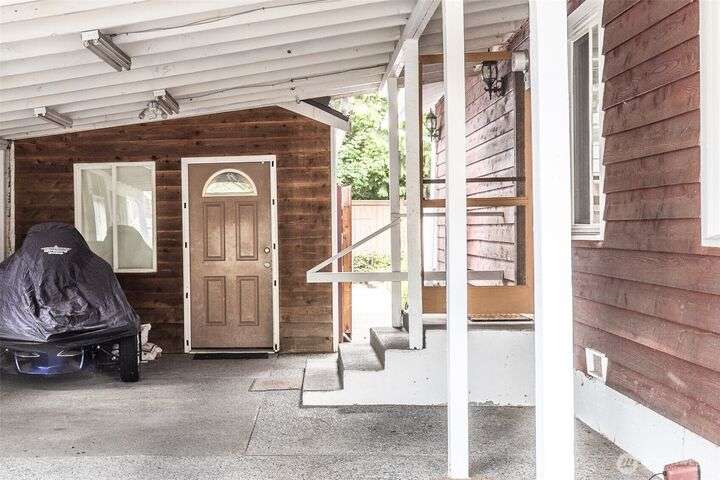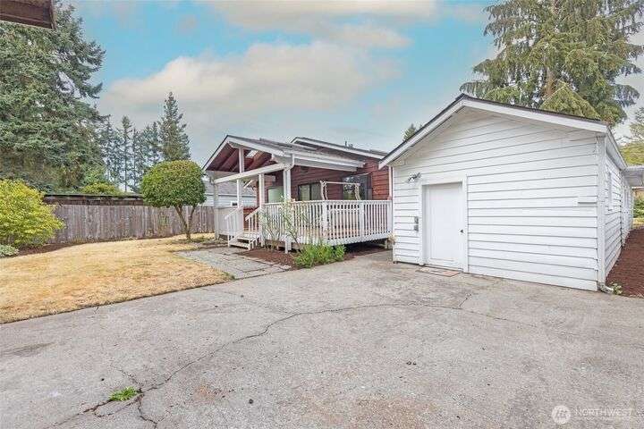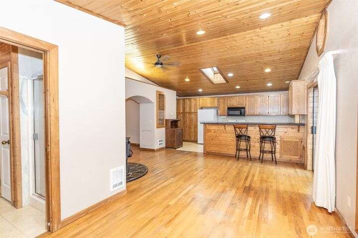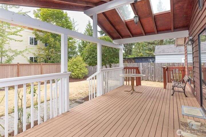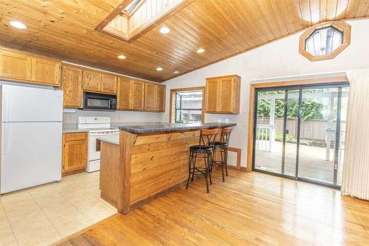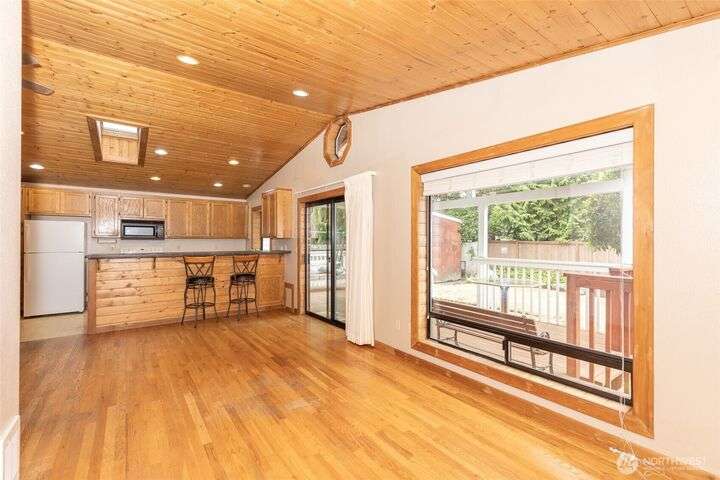 Welcome home to this warm and inviting country style one-story home complete with a big covered back deck allowing extra living space, spacious fully fenced and landscaped backyard, 2-car carport and a detached partially finished room that could be used for storage, guests or turned back into a 1-car garage! Warm wood tones and natural light greet you as you enter the home with skylights, vaulted tongue & groove ceiling, hardwood floors, spacious kitchen with abundance of cabinets, counter space & breakfast bar open to family room and formal dining room + 2 freestanding stoves for energy efficient heating. Centrally located in Snohomish close to all amenities!