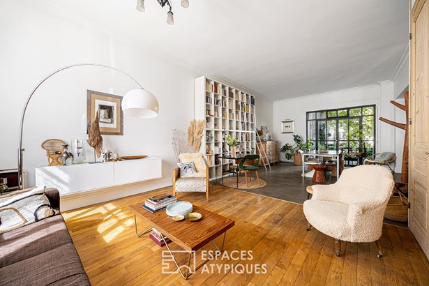 From the reception area, a storage/laundry area precedes a semi-open kitchen with a pantry, extended by a convivial dining room. A characterful stone archway then reveals a majestic living room bathed in light thanks to its high bay windows running over 5m in ceiling height. This reception area extends onto a private 14sqm terrace, rare in the area.