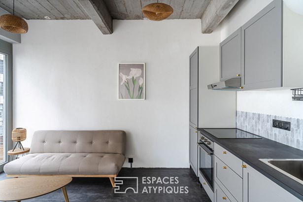 The interior of the studio apartment is appealing thanks to its careful layout. As you enter, there is a sleeping area on the right, which can be adjusted using a curtain to preserve privacy while maintaining the fluidity of the space. The exposed period columns bear witness to the history of the place while blending perfectly into a resolutely contemporary setting. The main room features a sitting area and an open-plan fitted and equipped kitchen. The finishes are particularly sophisticated: tinted waxed concrete-effect screed on the floor, cream-white lime plaster on the walls, and rubberized ceilings. The generous ceiling height is 2.95 meters. A shower room completes the ensemble. The large bay windows, fitted with adjustable sunshades, provide constant light while ensuring thermal comfort and privacy. The sleeping area has blackout blinds.