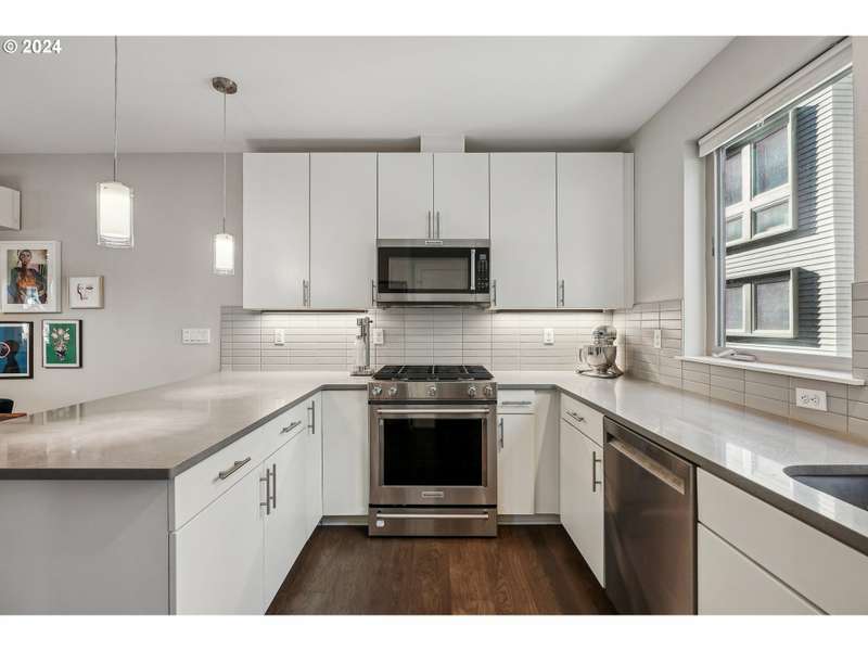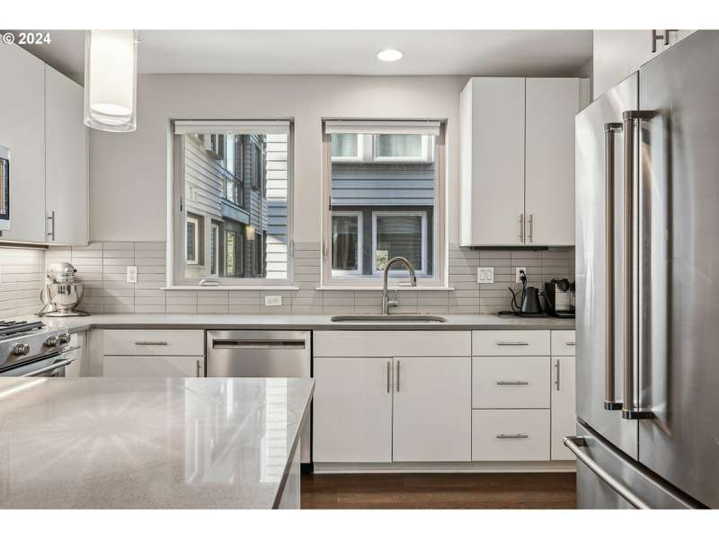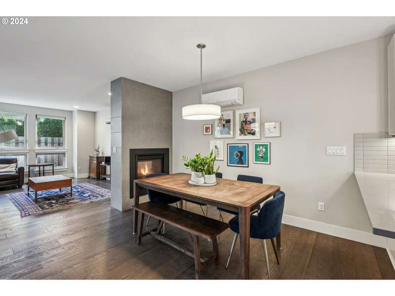 Easy living in the heart of historic Sellwood with low HOA dues. Built in 2020, this end unit home features lots of natural light, high ceilings, engineered wood floors and double-sided gas fireplace shared by the living and dining room in an open concept floorplan. Kitchen with stainless steel kitchen-aide appliances, custom cabinetry and quartz countertops. Step out living room to private patio. Custom built wooden staircase leads up to a large primary suite with vaulted ceilings, a walk-in closet, and a luxurious bathroom showcasing double vanity and a large soaking tub. Plus an additional bed and bath upstairs. Also, a street-level bedroom with a full bathroom - perfect for guests or a home office. Secure parking in your own garage. This home is conveniently located near the Willamette River with easy access to everything the Sellwood and West Moreland neighborhoods has to offer, from New Seasons, shopping and restaurants, Spring water trail. Sellwood park is located adjacent to the home with its 17 acres of trails, sports courts, sports fields, and a swimming pool. Easy access to the Sellwood Bridge. Home energy score 7!